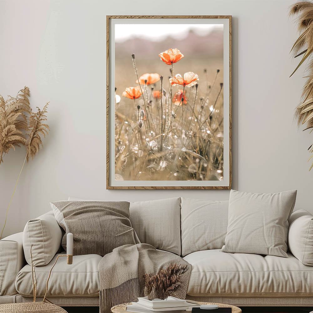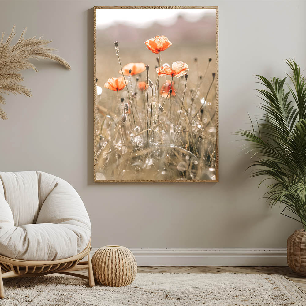 Add a touch of nature's elegance to your home with this breathtaking farmhouse wall art featuring delicate poppies glowing in the soft light of a sunlit meadow. The warm, golden hues and vibrant orange poppies create a serene and peaceful atmosphere, perfect for adding a vintage-inspired touch to any room. The dreamy, blurred background emphasizes the beauty of the flowers, making this piece an ideal focal point for farmhouse-style decor.
