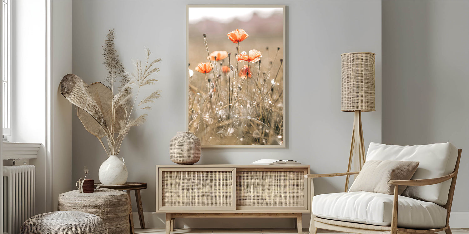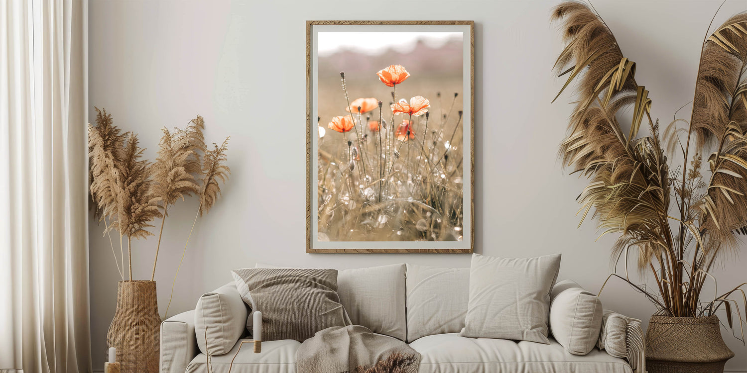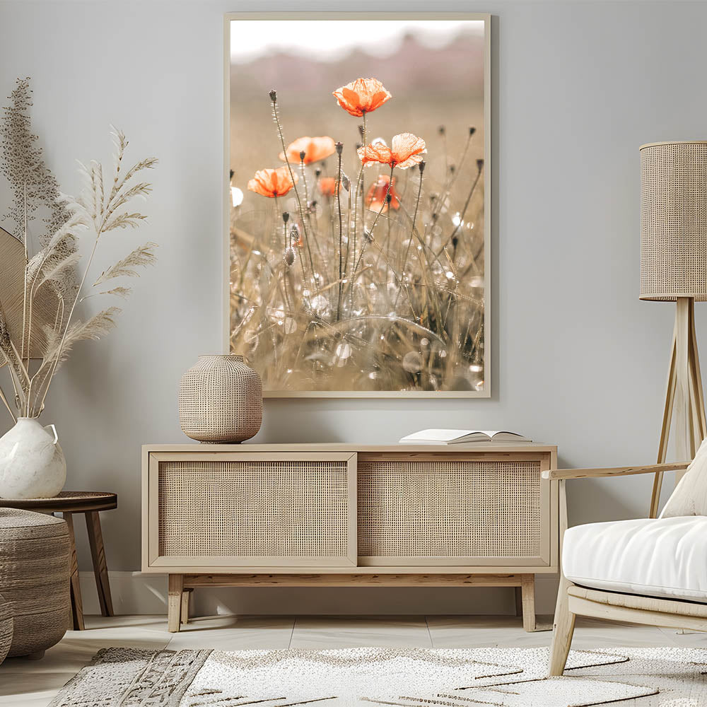 • Features sunlit poppies in a rustic meadow, adding warmth and charm to your space.