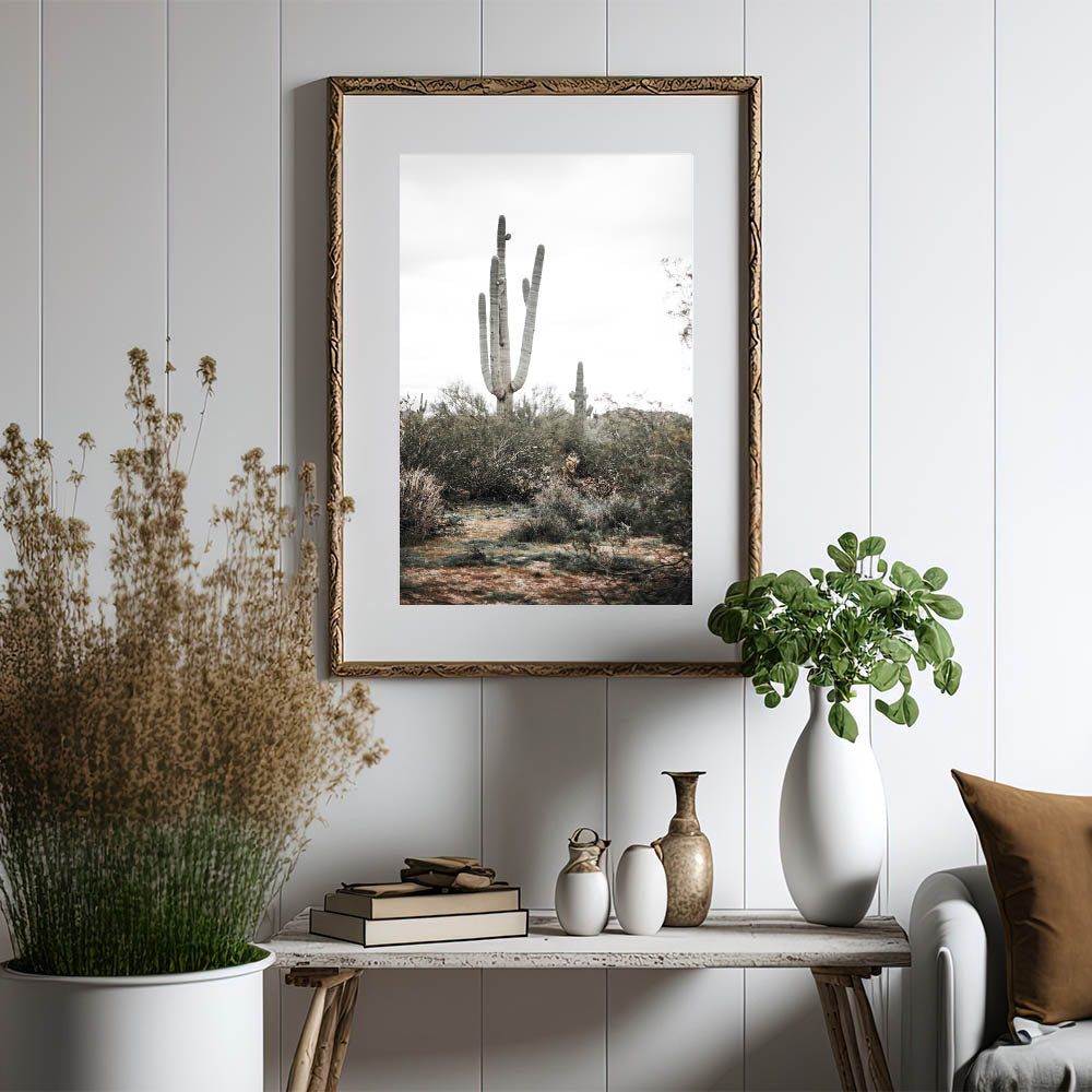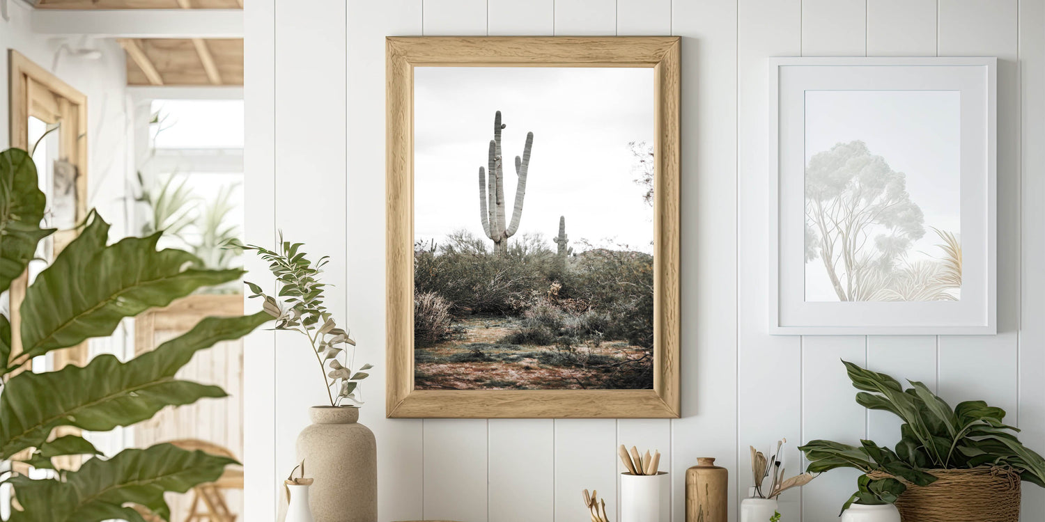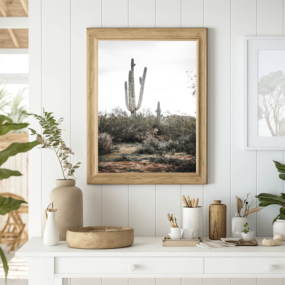 Available in multiple formats, such as stretched canvas, framed prints, and acrylic glass, this versatile piece complements a wide range of interior styles. The natural colors of the cactus and desert plants blend effortlessly with your farmhouse style wall decor, while the minimalist design adds a modern touch to your space. Whether in your living room, hallway, or office, this vintage farmhouse-inspired artwork brings the outdoors inside.