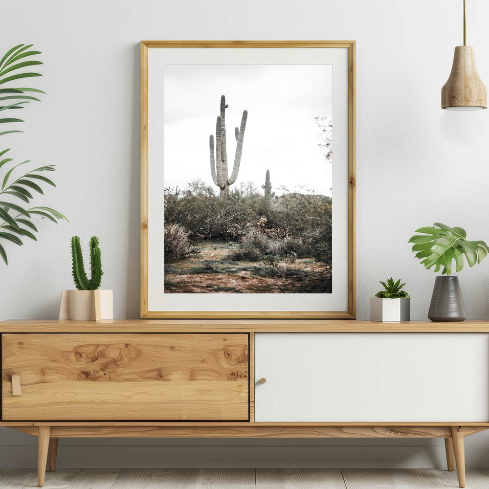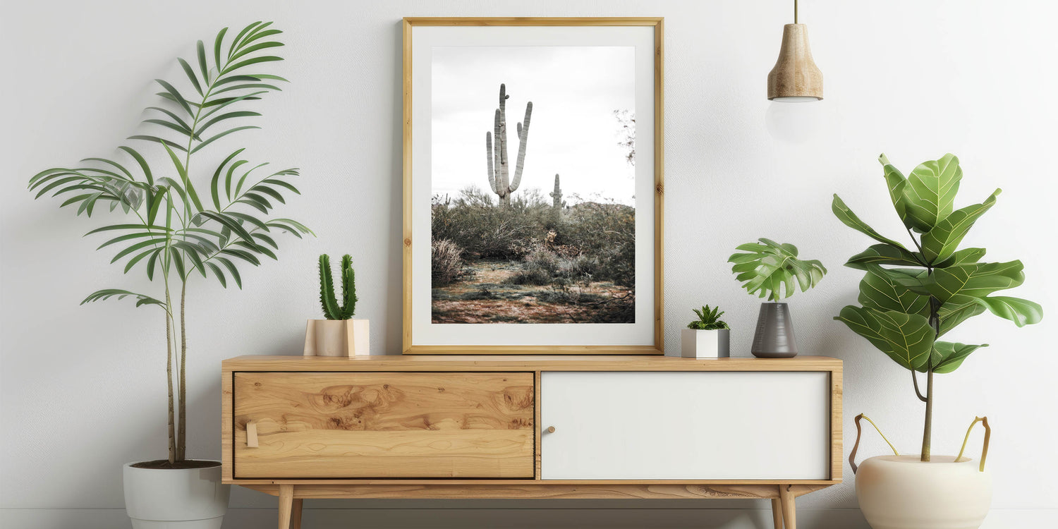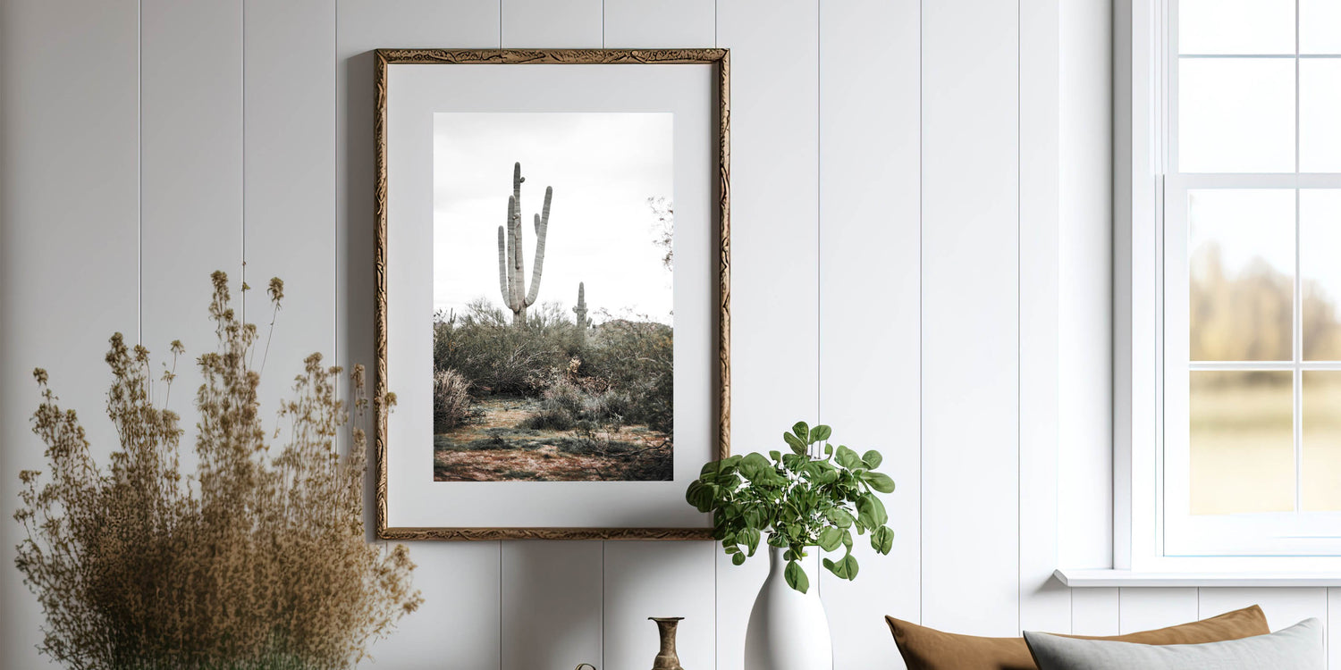 Available in multiple formats, such as stretched canvas, framed prints, and acrylic glass, this versatile piece complements a wide range of interior styles. The natural colors of the cactus and desert plants blend effortlessly with your farmhouse style wall decor, while the minimalist design adds a modern touch to your space. Whether in your living room, hallway, or office, this vintage farmhouse-inspired artwork brings the outdoors inside.