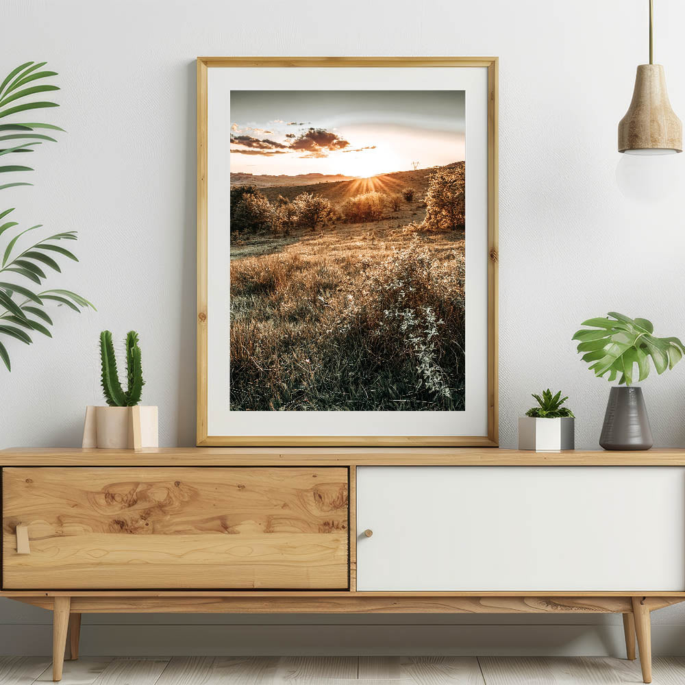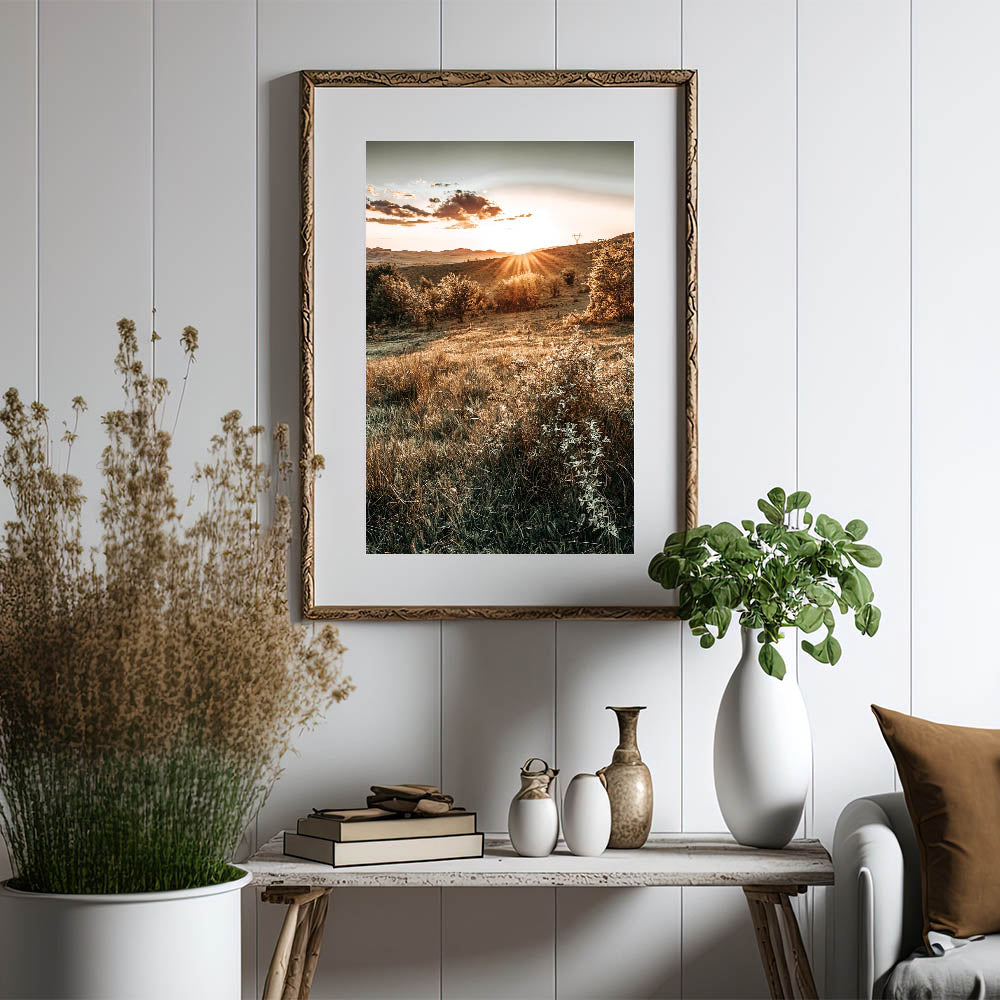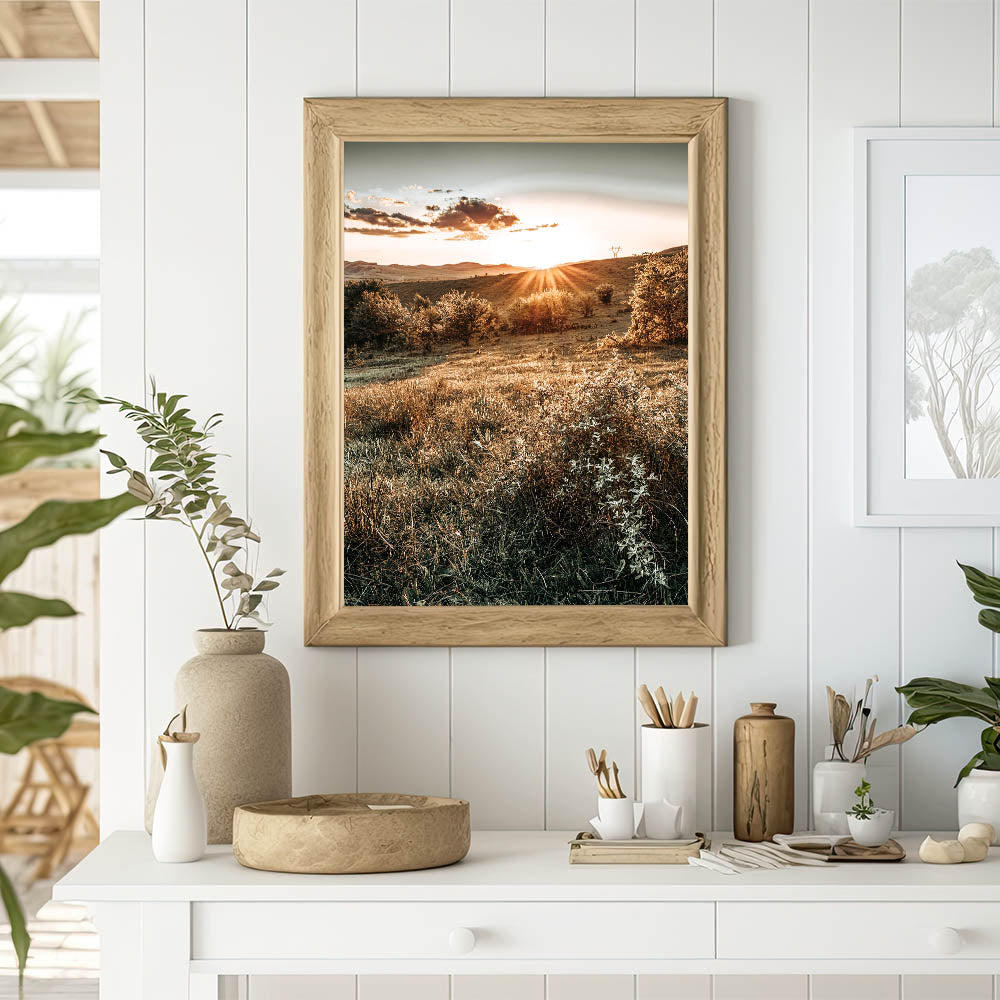 • Warm, golden sunset over a countryside landscape, ideal for rustic and farmhouse decor