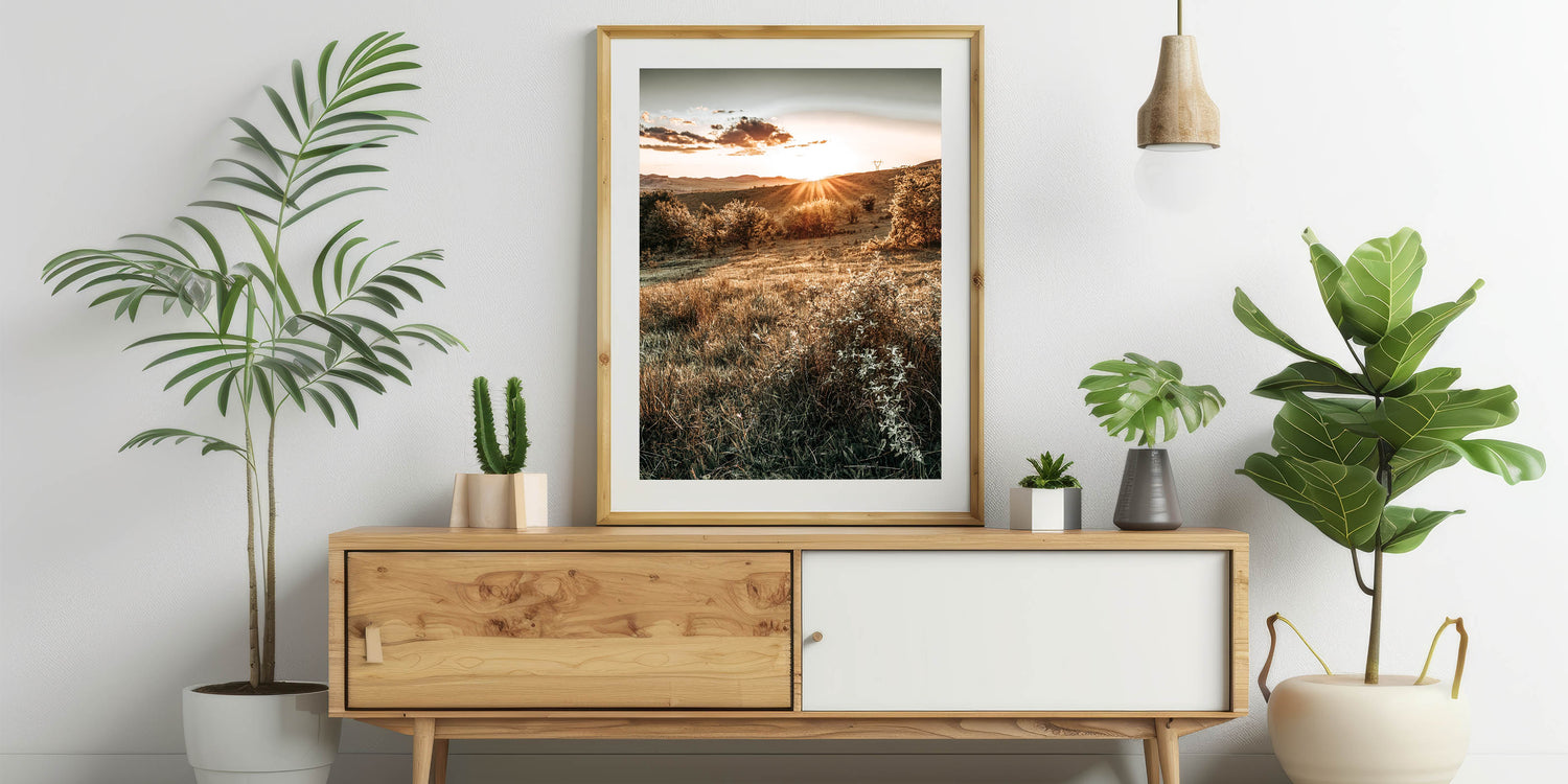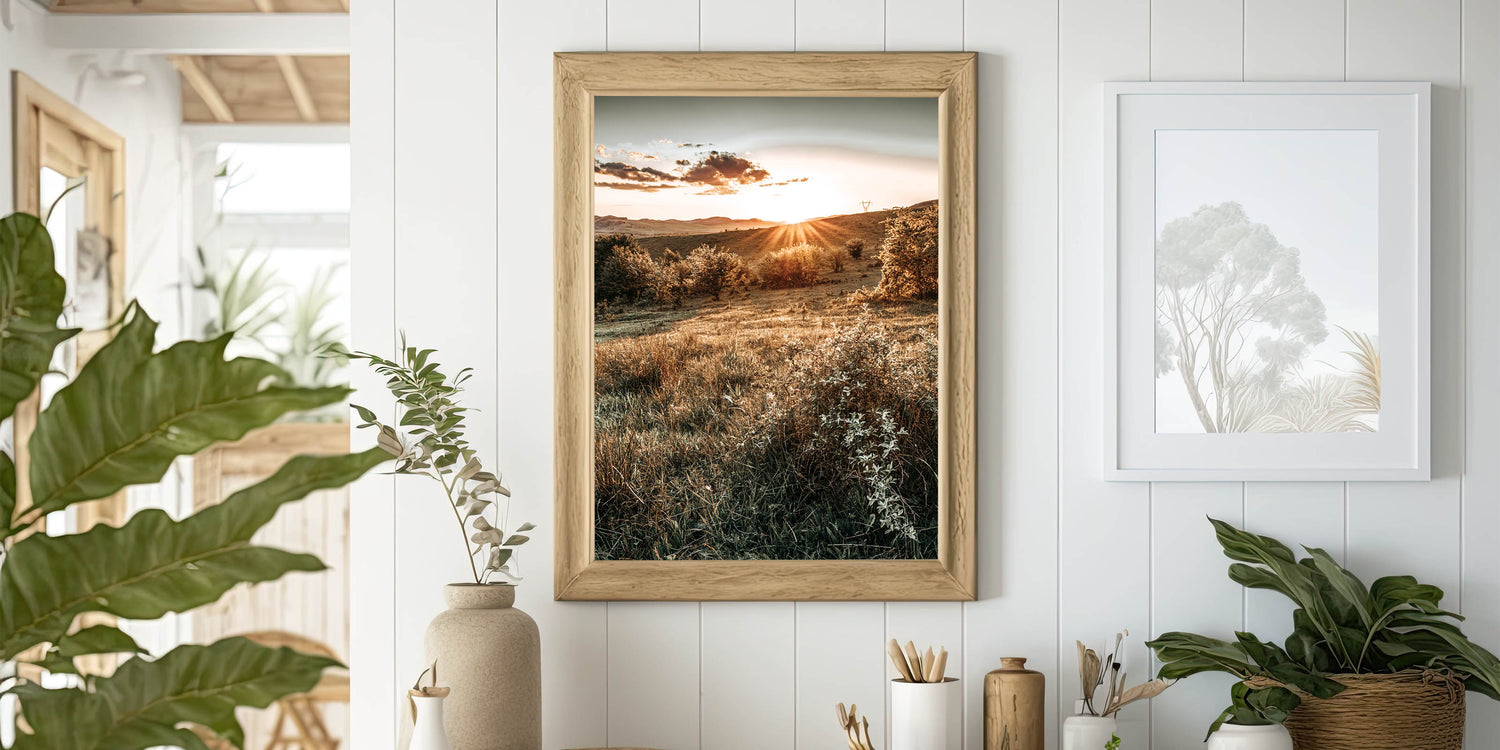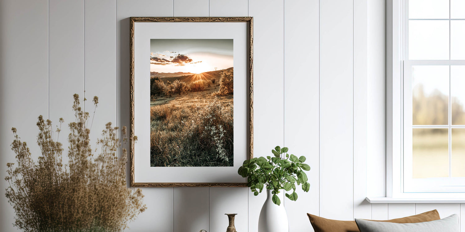 • Warm, golden sunset over a countryside landscape, ideal for rustic and farmhouse decor