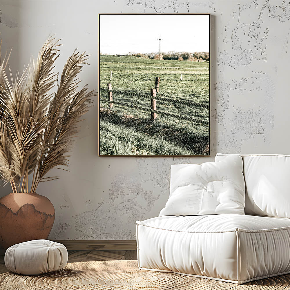 Bring the calming beauty of the countryside into your home with this "Green Pastures and Wooden Fence" farmhouse wall art. The expansive green fields, dotted with rustic wooden fence posts, capture the essence of rural life. Perfect for adding a touch of nature to your living room, kitchen, or office, this artwork brings a sense of calm and openness to any space. The soft tones and serene composition make it an ideal addition to rustic or farmhouse-style decor.