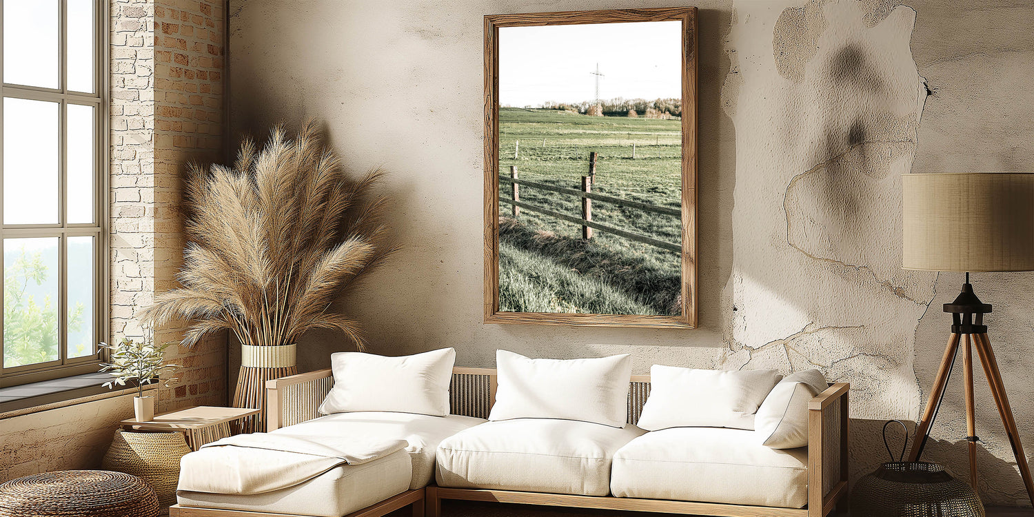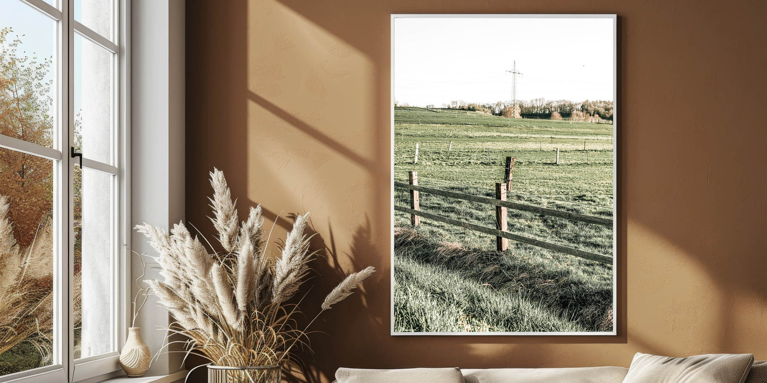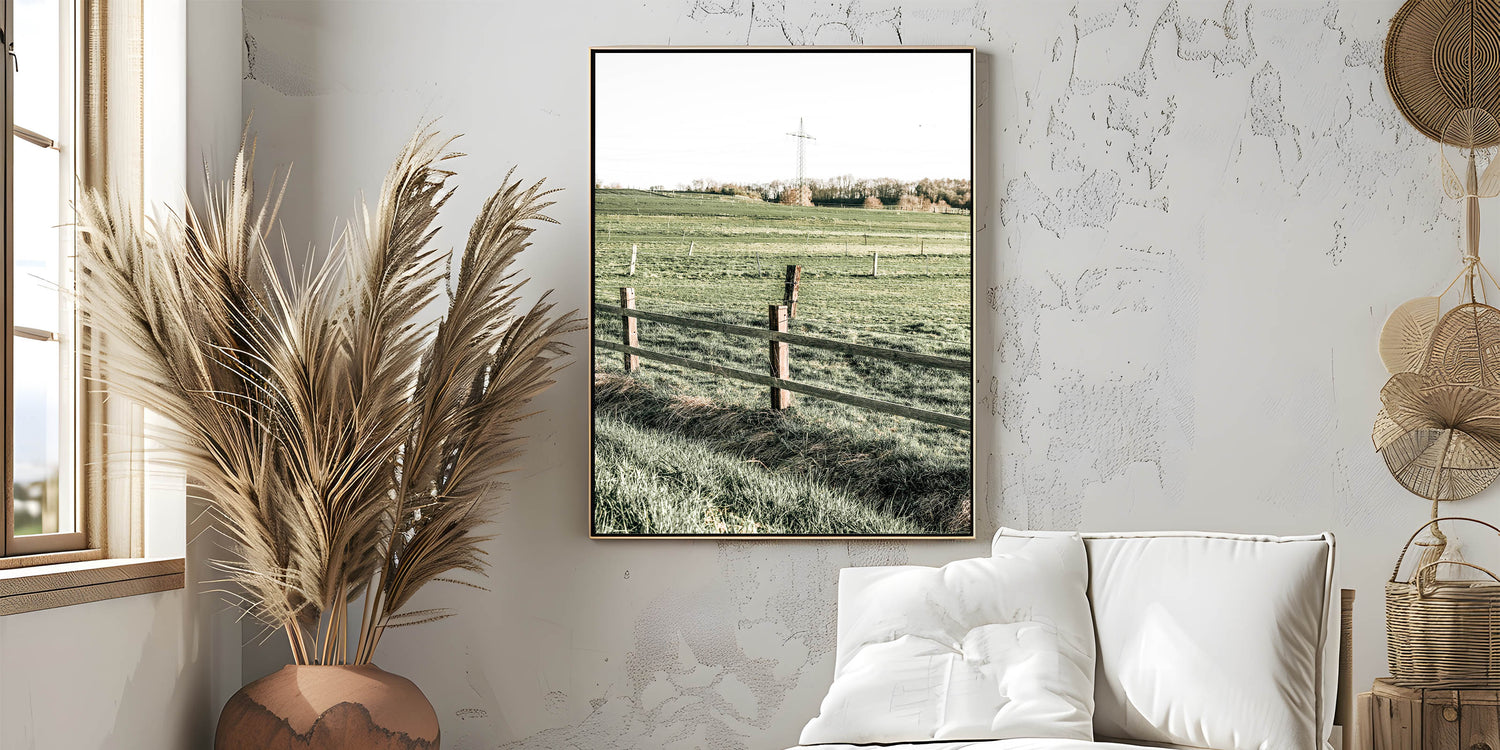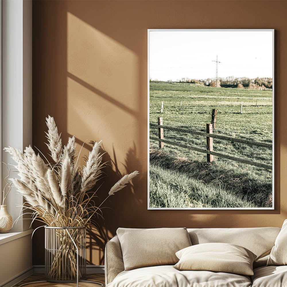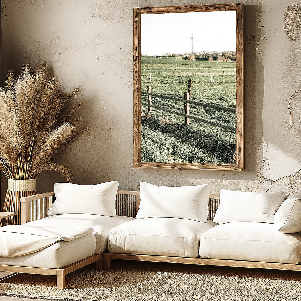 • Serene green pastures and wooden fence scene, ideal for rustic and farmhouse decor