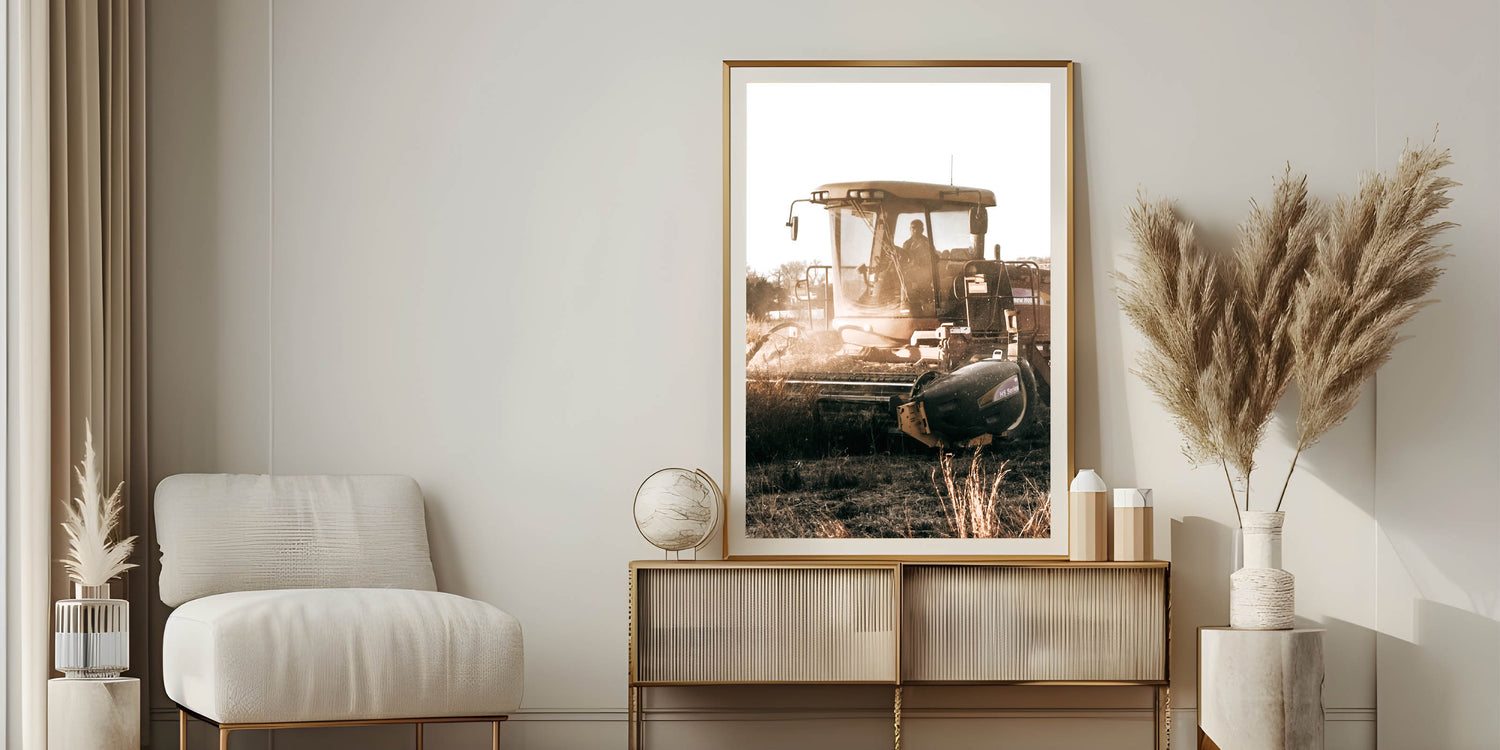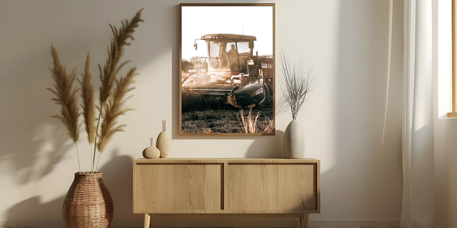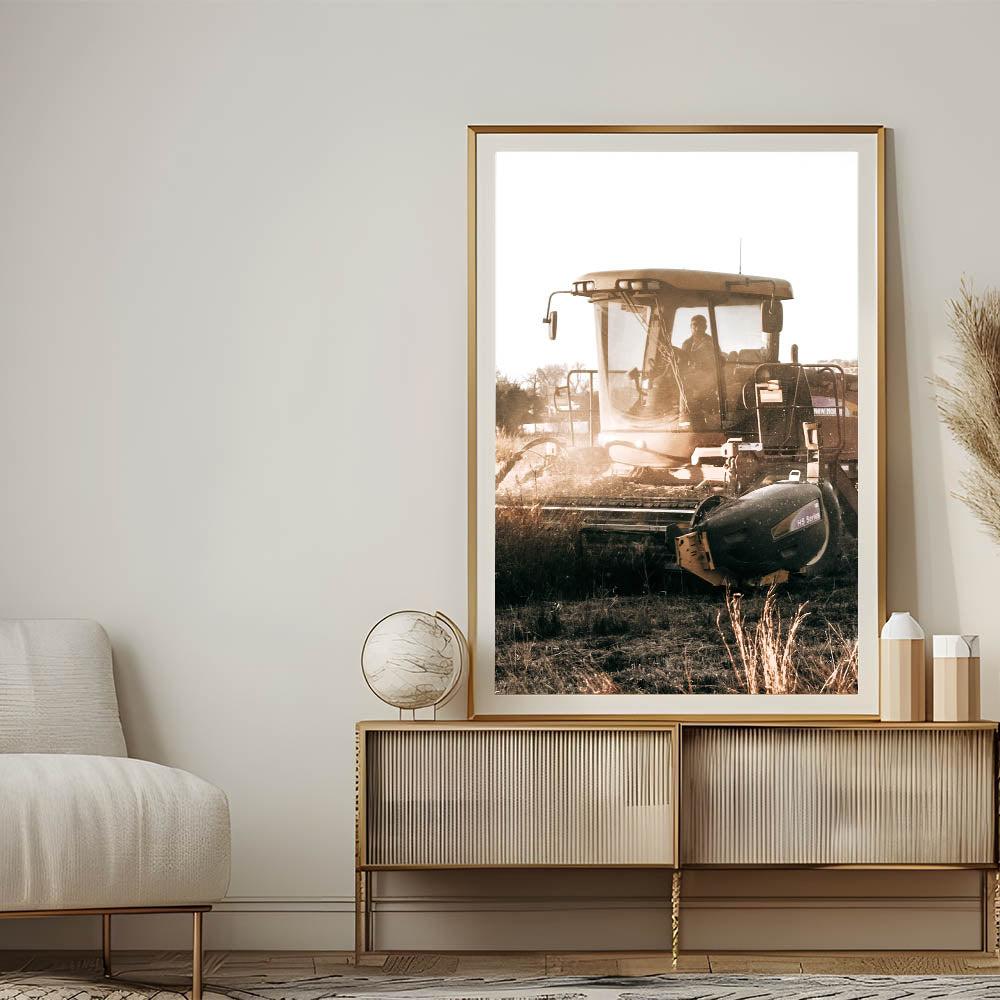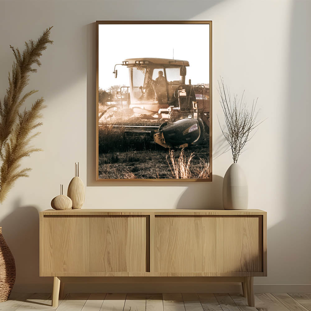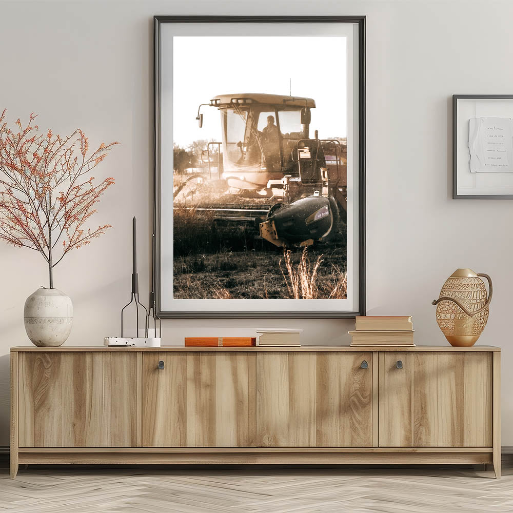 Capture the hard work and beauty of life on the farm with this farmhouse wall art. Featuring a powerful image of a tractor harvesting a field, this artwork is perfect for adding an authentic touch of country living style to your home. The earthy tones of the tractor and field blend beautifully to create a scene that evokes the essence of rustic charm and the timelessness of rural life.