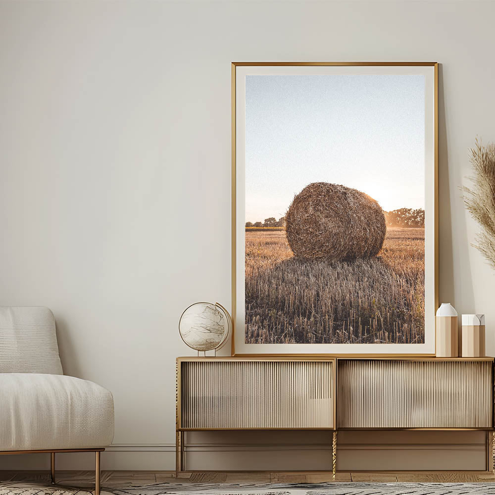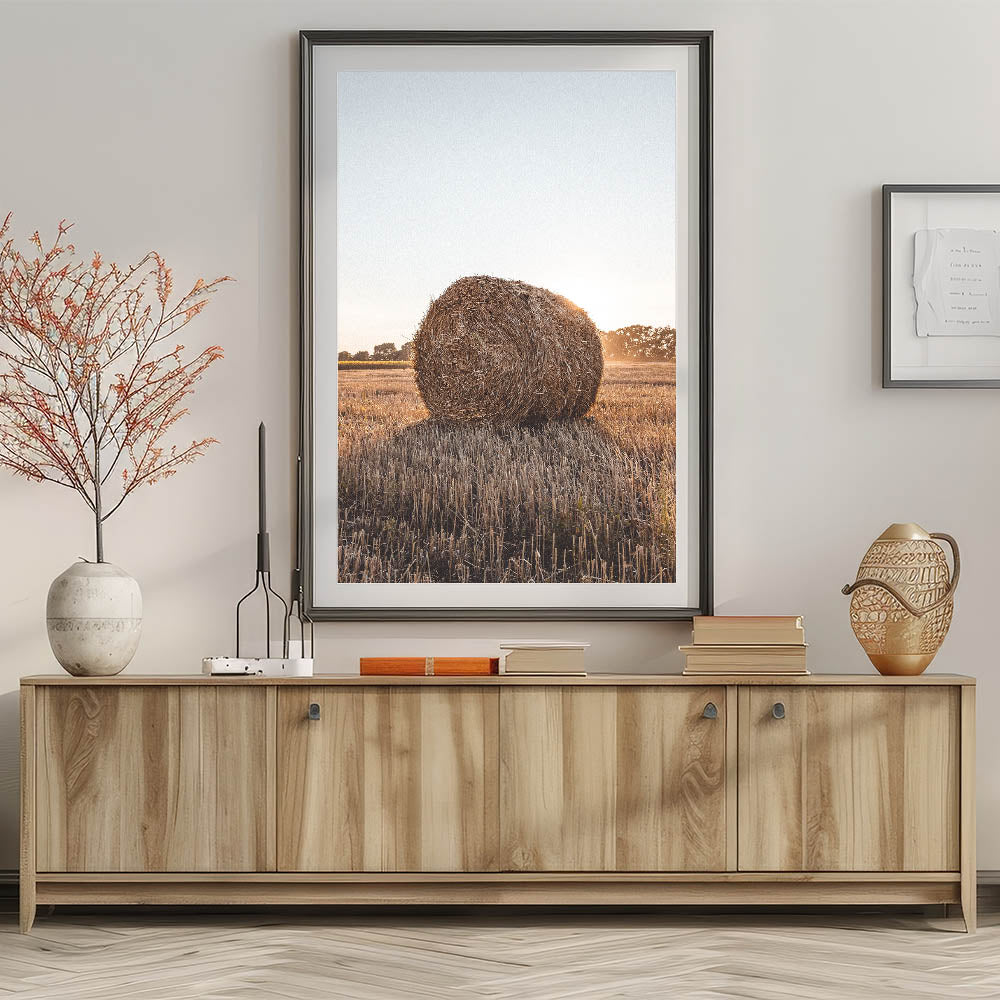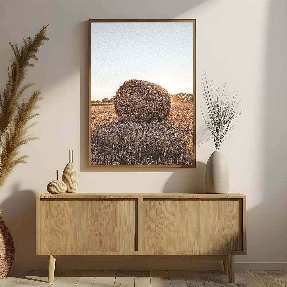 Capture the peaceful beauty of the countryside with this farmhouse wall art, featuring a hay bale bathed in the warm glow of the setting sun. The golden tones of the field and the rich texture of the hay bale bring a sense of rustic charm to your home, making it perfect for enhancing your country living style decor. The serene landscape and gentle sunset light evoke the tranquility and natural beauty of rural life.