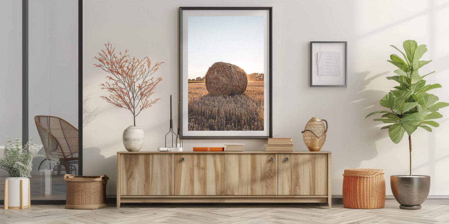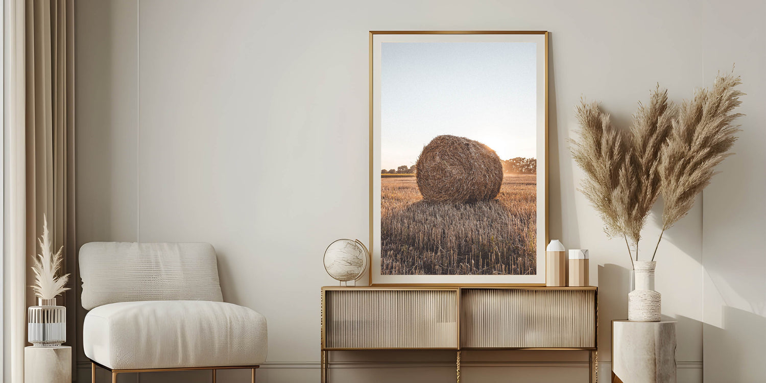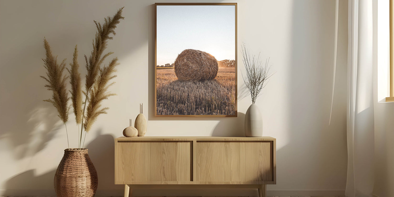 Available in multiple formats, such as stretched canvas, framed prints, and acrylic glass, this versatile artwork can be displayed in any room. The combination of the hay bale's texture with the soft, natural colors makes this piece ideal for adding a calming, country-inspired element to your farmhouse style wall decor. Whether displayed in your living room, kitchen, or entryway, this artwork brings the essence of the farm into your home.