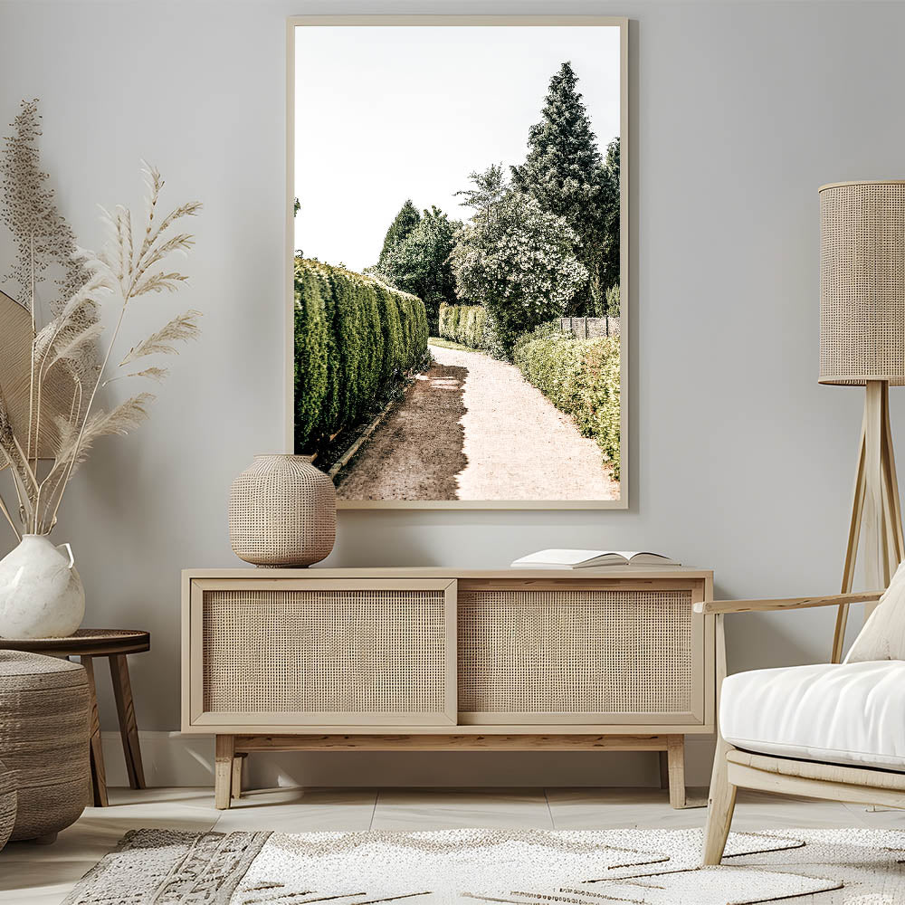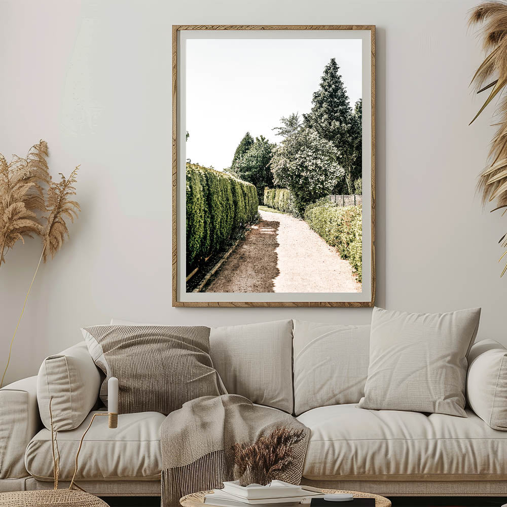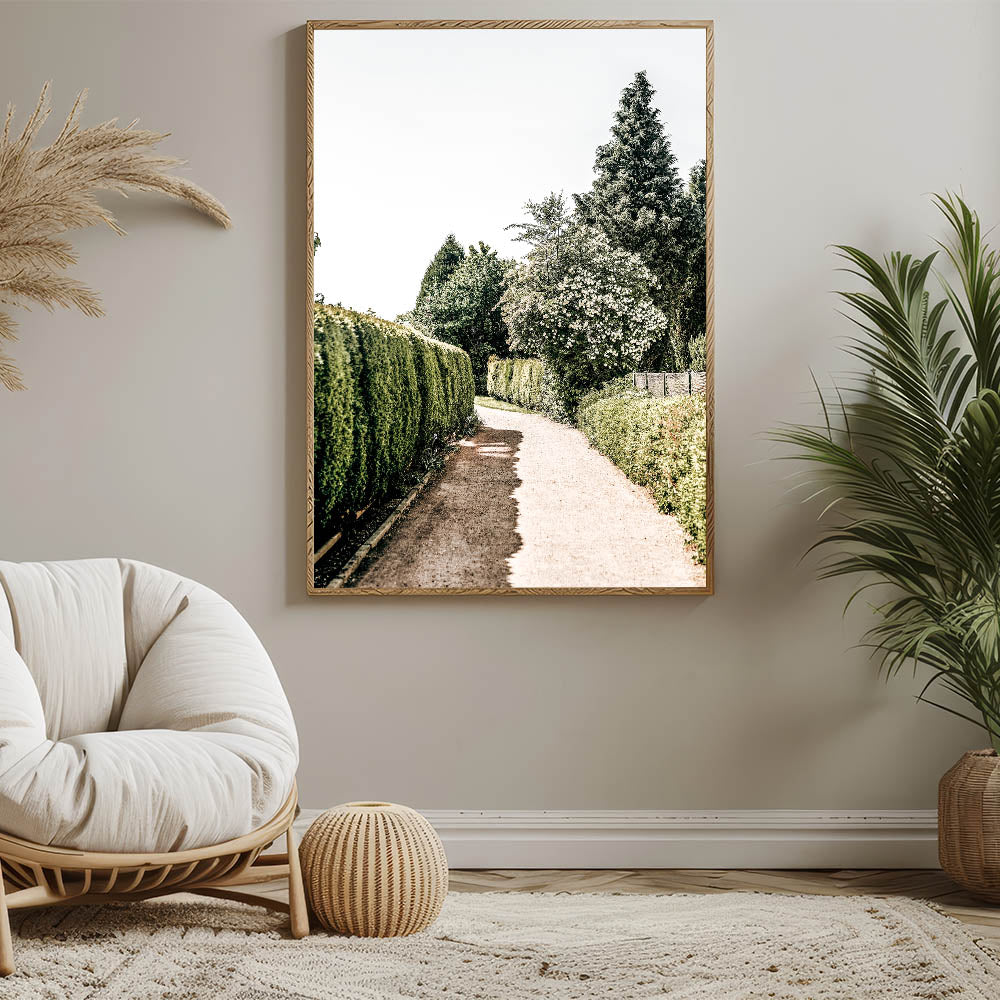 Farmhouse Wall Art – Hedge-Lined Path Print for Rustic Garden Decor