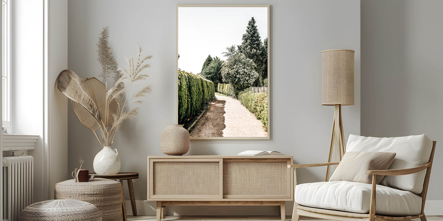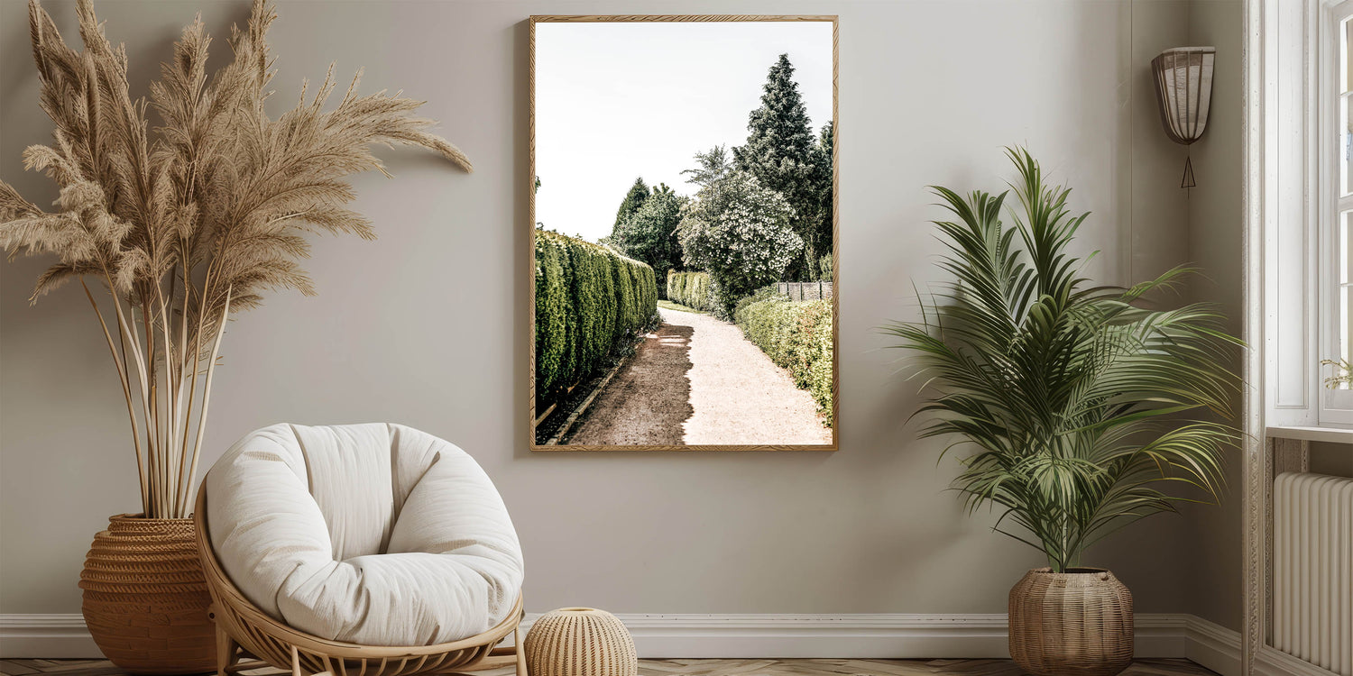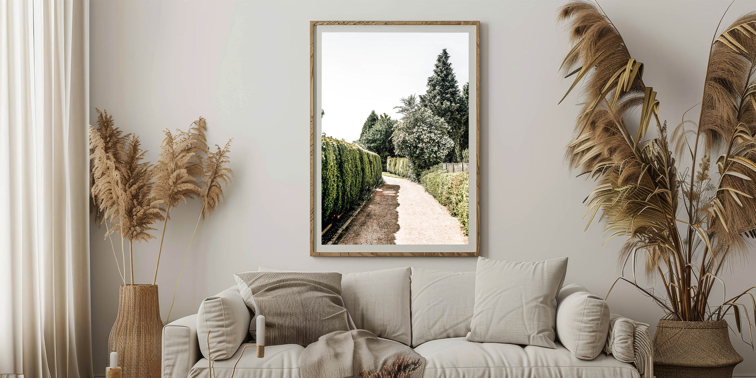 Farmhouse Wall Art – Hedge-Lined Path Print for Rustic Garden Decor