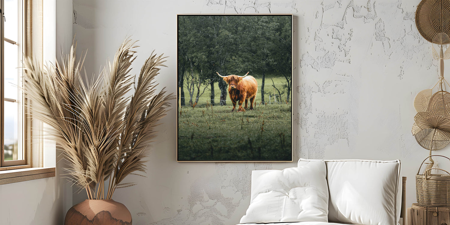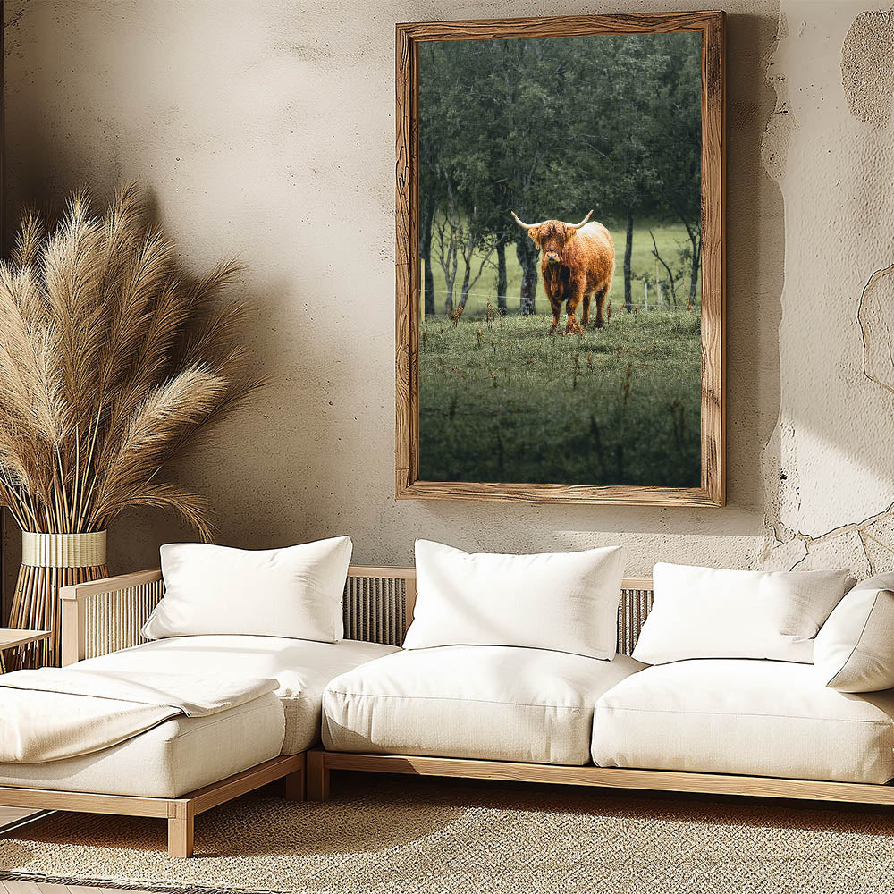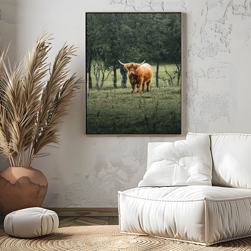 This artwork brings the tranquil beauty of the countryside into your home. Whether you choose it as a framed print or a rolled canvas, this Highland cow wall art will enhance any space with a cozy, rustic elegance.