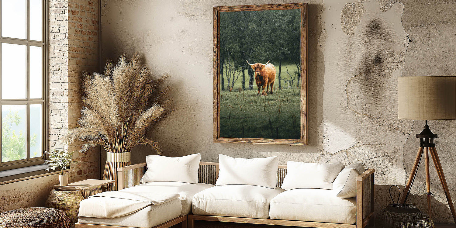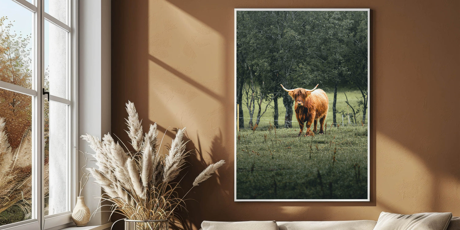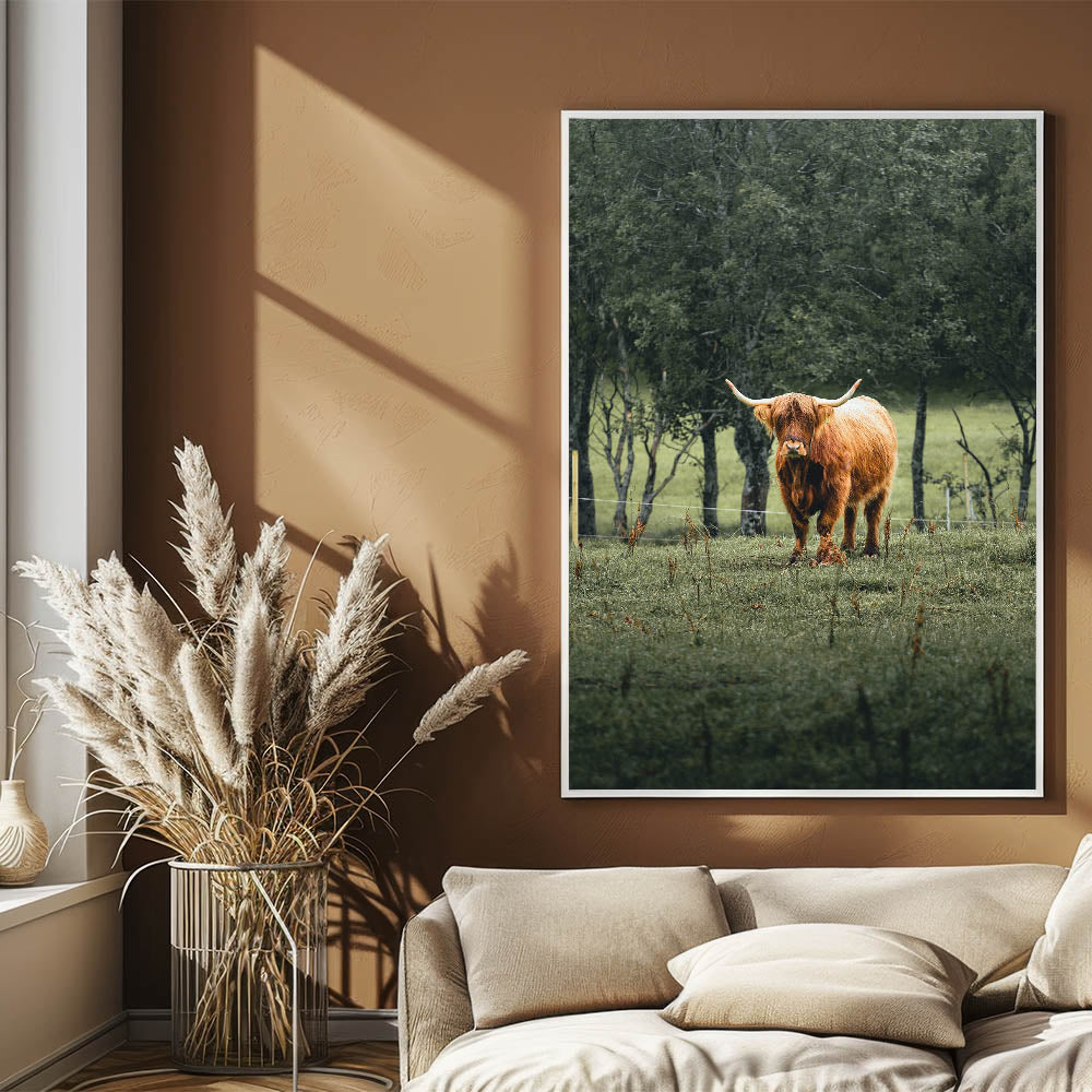 This artwork brings the tranquil beauty of the countryside into your home. Whether you choose it as a framed print or a rolled canvas, this Highland cow wall art will enhance any space with a cozy, rustic elegance.
