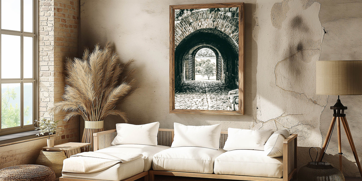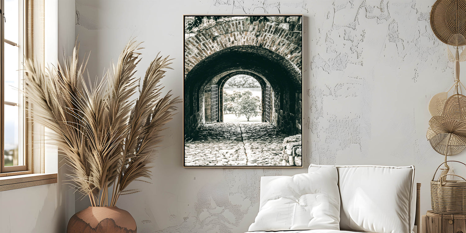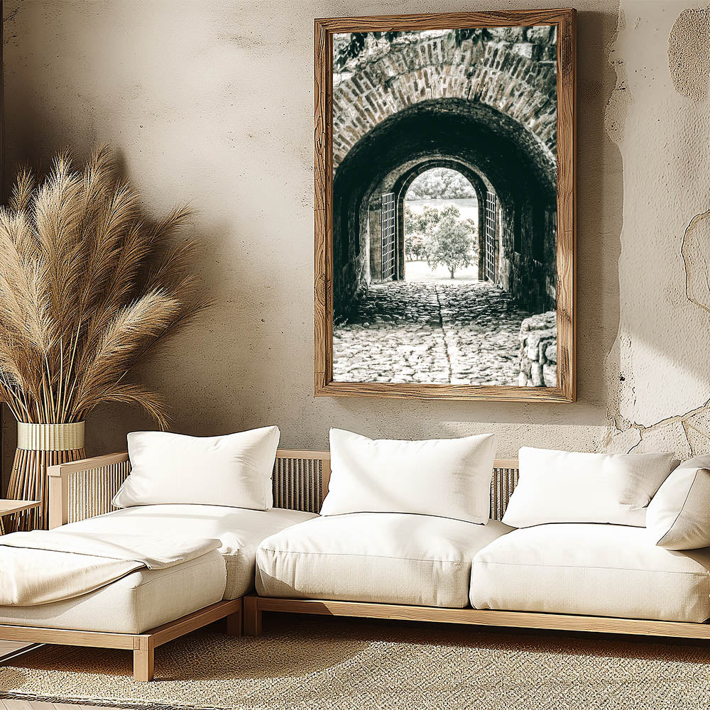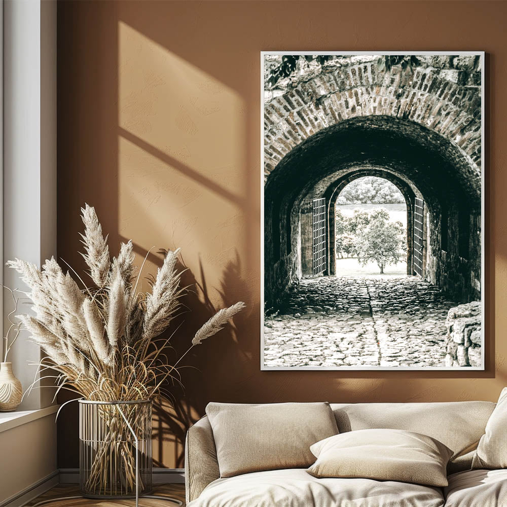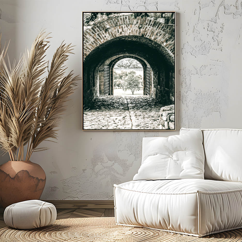 Add a sense of timeless beauty to your home with this striking farmhouse wall art featuring a historic stone archway leading to a serene outdoor scene. The rich textures of the stone and the depth of the arch create a captivating focal point, perfect for enhancing your rustic or vintage-inspired decor. The light at the end of the tunnel evokes a sense of peaceful transition, blending the old-world charm of cobbled stone with the beauty of nature beyond.