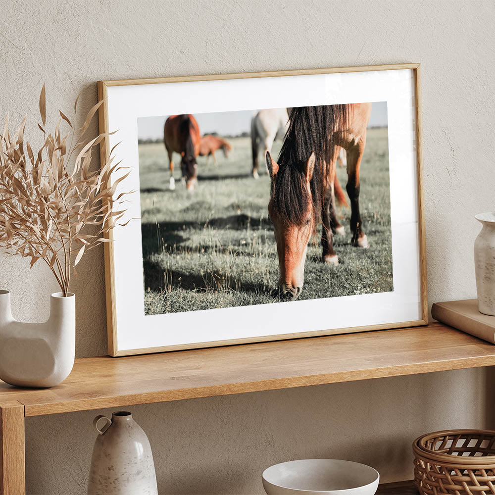 This serene horses grazing wall art is an excellent way to bring the quiet charm of the countryside into your home. Its peaceful composition and natural colors make it a versatile piece for adding warmth and tranquility to any room.