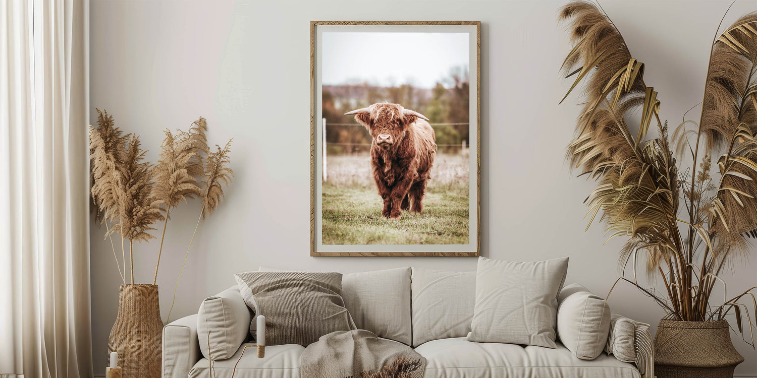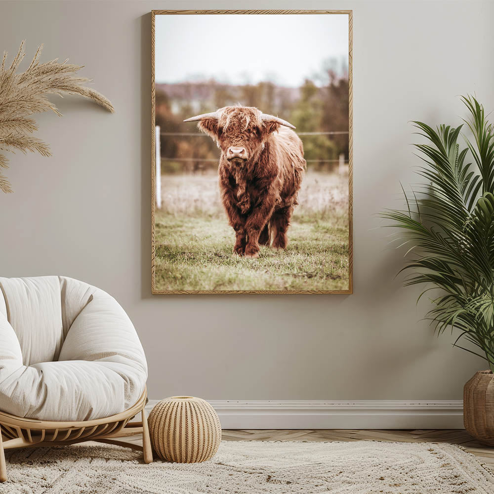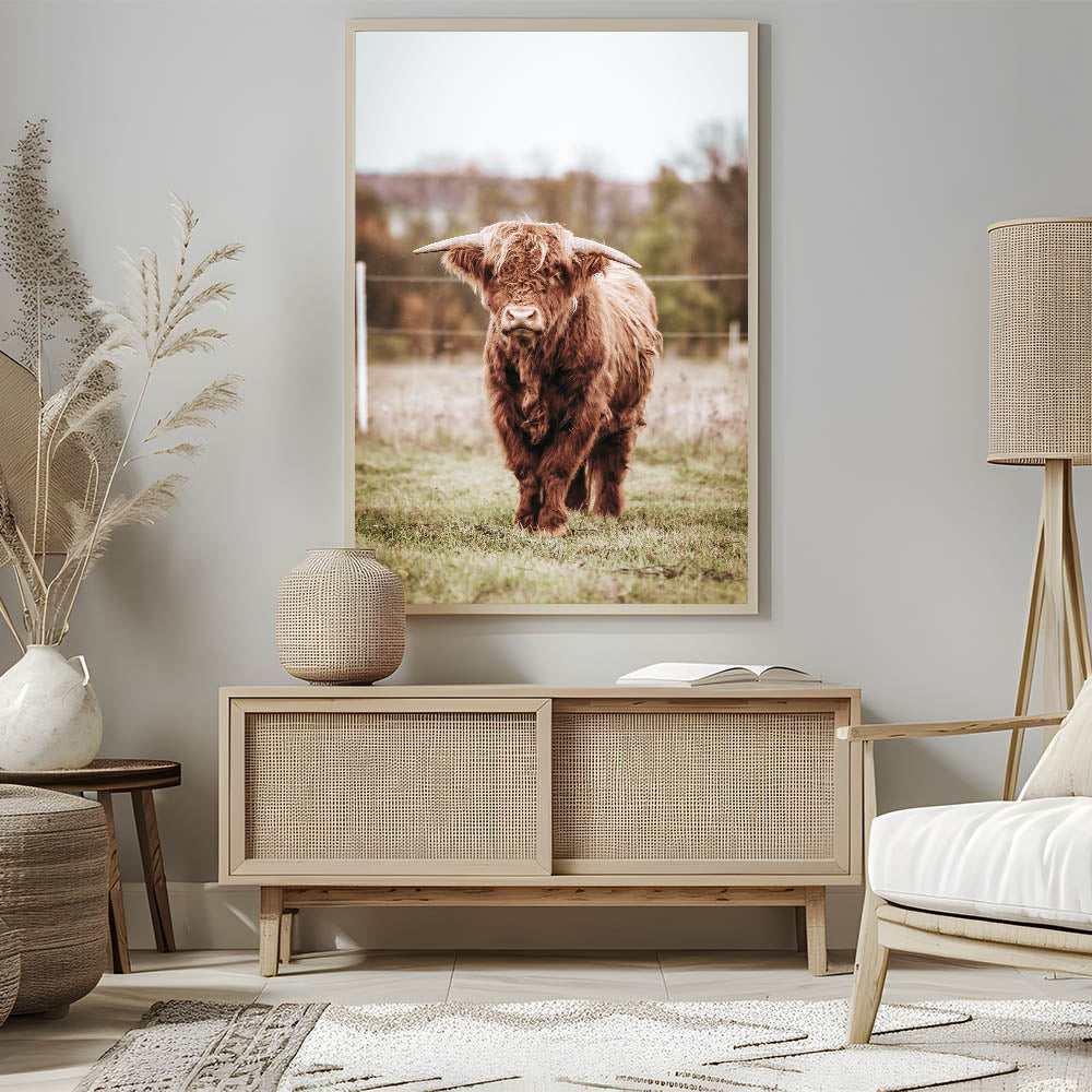 Bring the charm of the countryside into your home with this stunning farmhouse wall art featuring a portrait of a majestic Highland cow. This design perfectly captures the essence of country living style, making it an ideal addition to your rustic farmhouse decor. The natural, earthy tones and the serene setting make this artwork a beautiful statement piece, blending vintage-inspired charm with the beauty of the great outdoors.