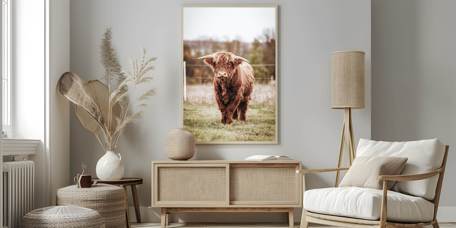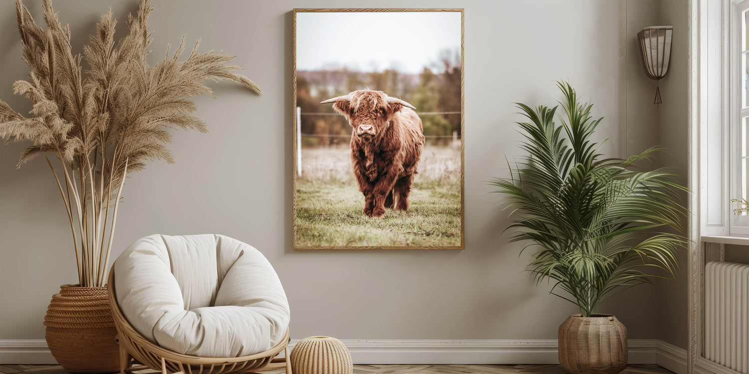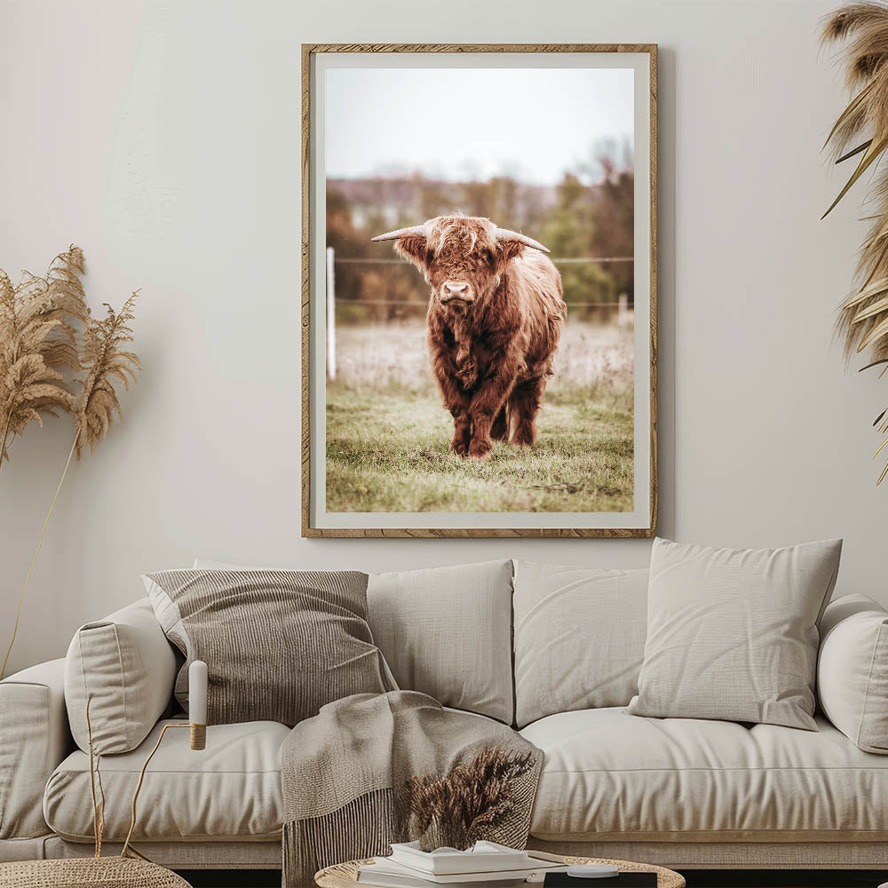 Bring the charm of the countryside into your home with this stunning farmhouse wall art featuring a portrait of a majestic Highland cow. This design perfectly captures the essence of country living style, making it an ideal addition to your rustic farmhouse decor. The natural, earthy tones and the serene setting make this artwork a beautiful statement piece, blending vintage-inspired charm with the beauty of the great outdoors.