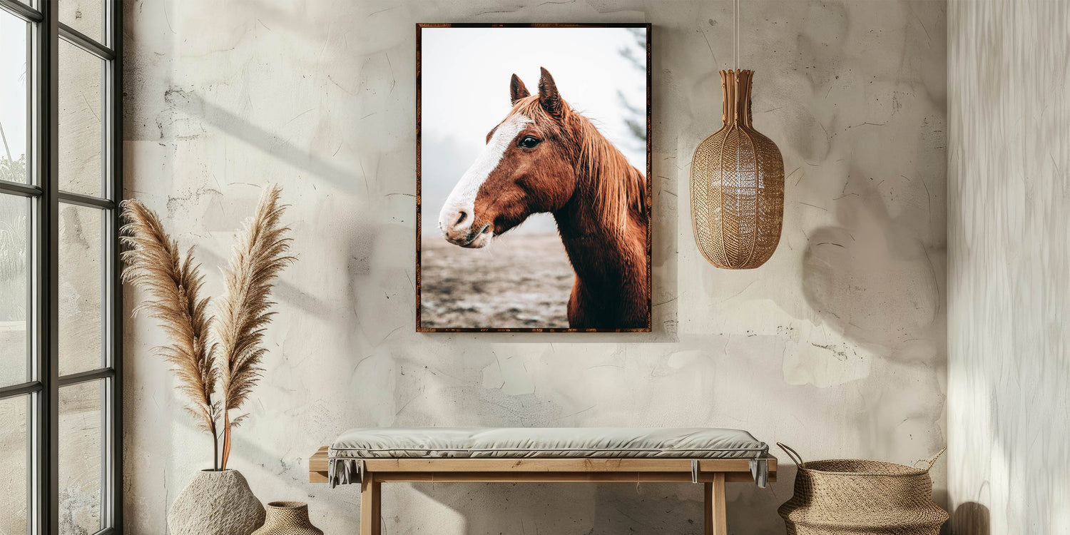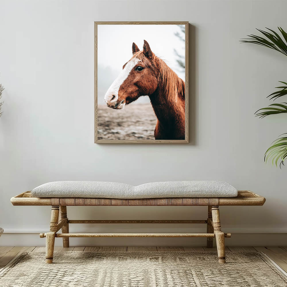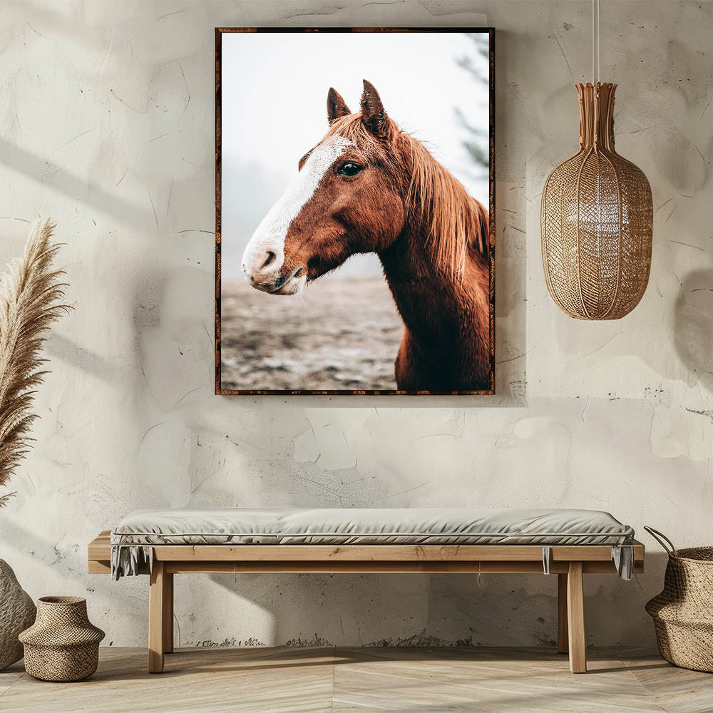 - Rustic charm: A close-up portrait of a majestic horse, ideal for enhancing your farmhouse decor.