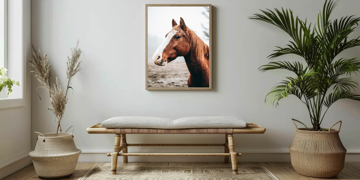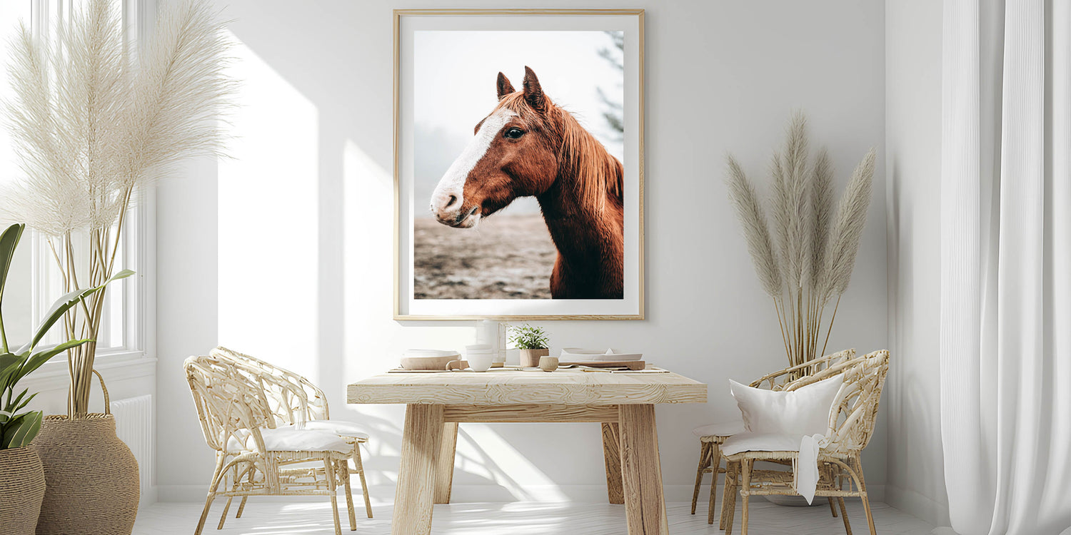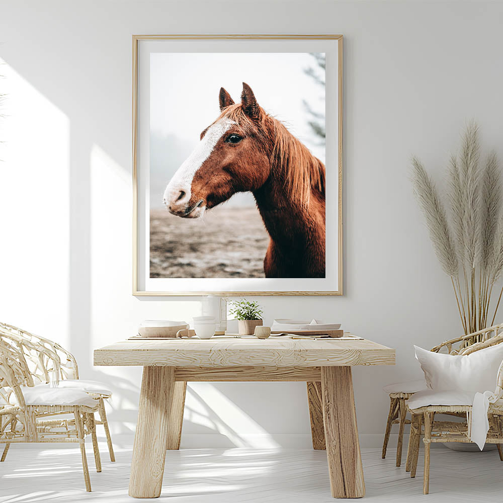 - Rustic charm: A close-up portrait of a majestic horse, ideal for enhancing your farmhouse decor.