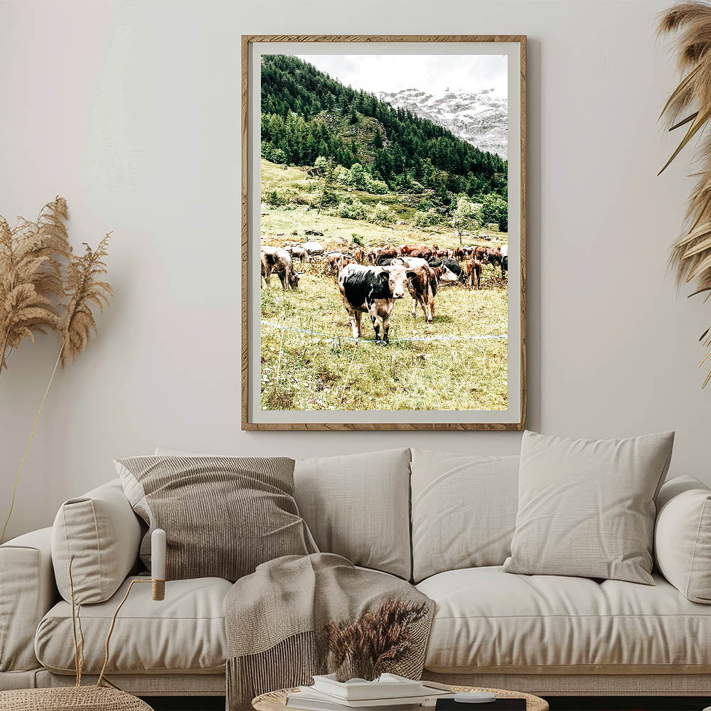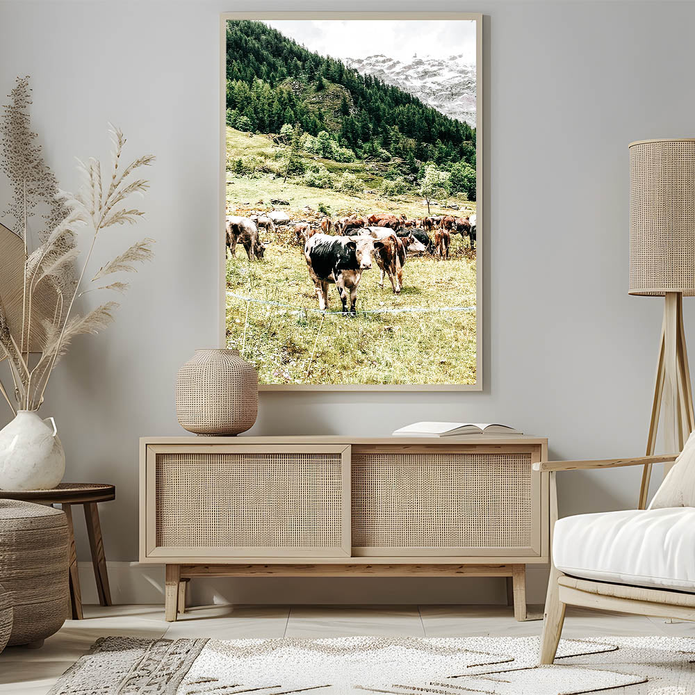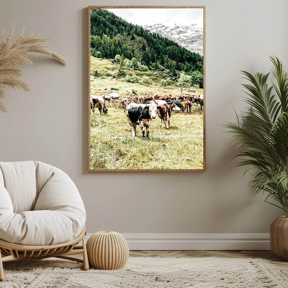 • Stunning mountain valley scene with grazing cows, ideal for rustic or farmhouse decor