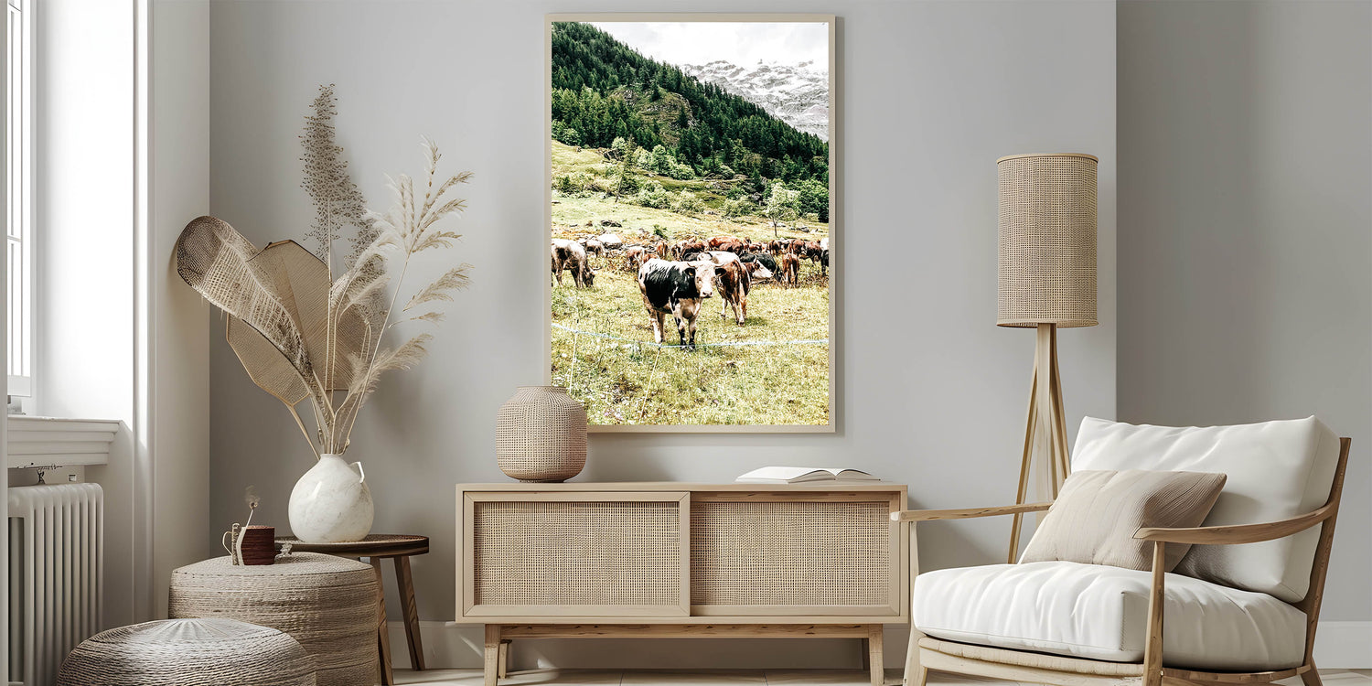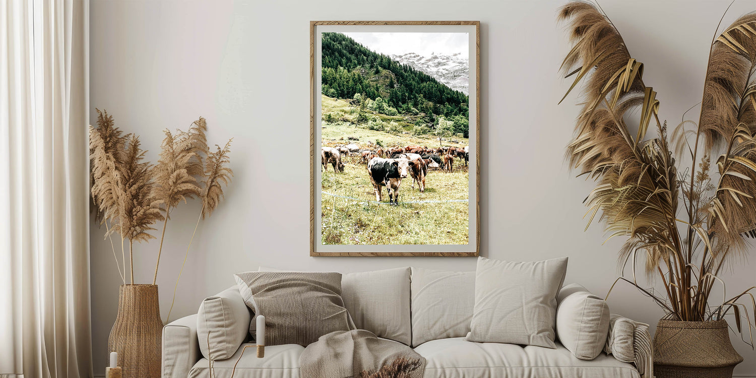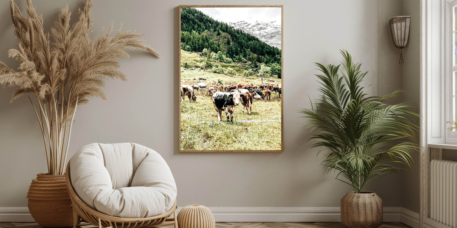 • Stunning mountain valley scene with grazing cows, ideal for rustic or farmhouse decor
