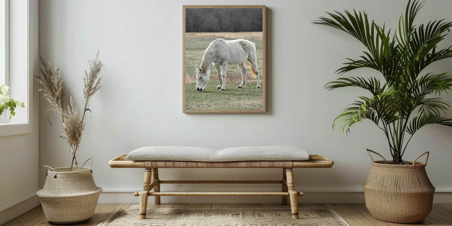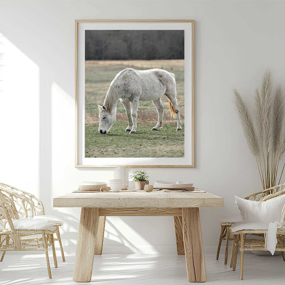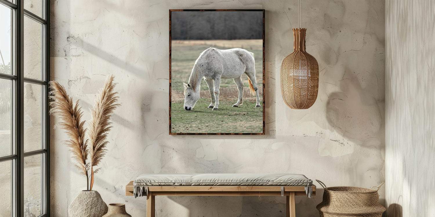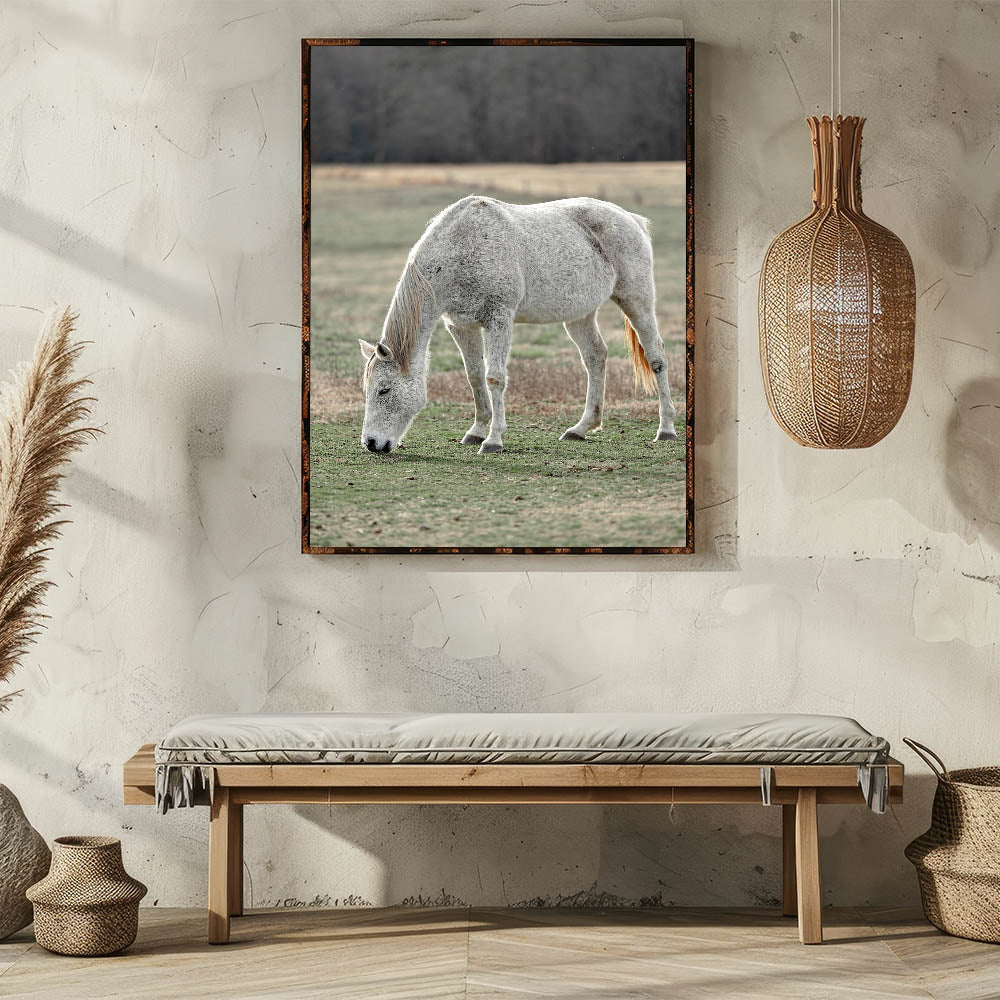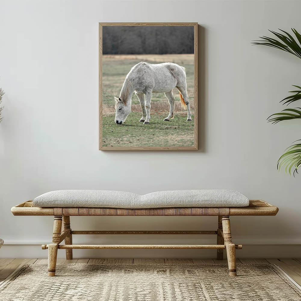 Add a peaceful touch of nature to your home with this beautiful Farmhouse Wall Art featuring a serene white horse grazing in an open field. This piece embodies the simplicity and calmness of country living style, making it a perfect addition to your rustic farmhouse decor. The soft tones and gentle texture of the horse’s coat combined with the natural landscape create an elegant balance that brings a quiet sophistication to any room.