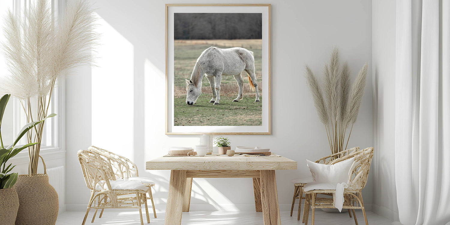 Farmhouse Wall Art of Grazing White Horse – Rustic Country Style Decor