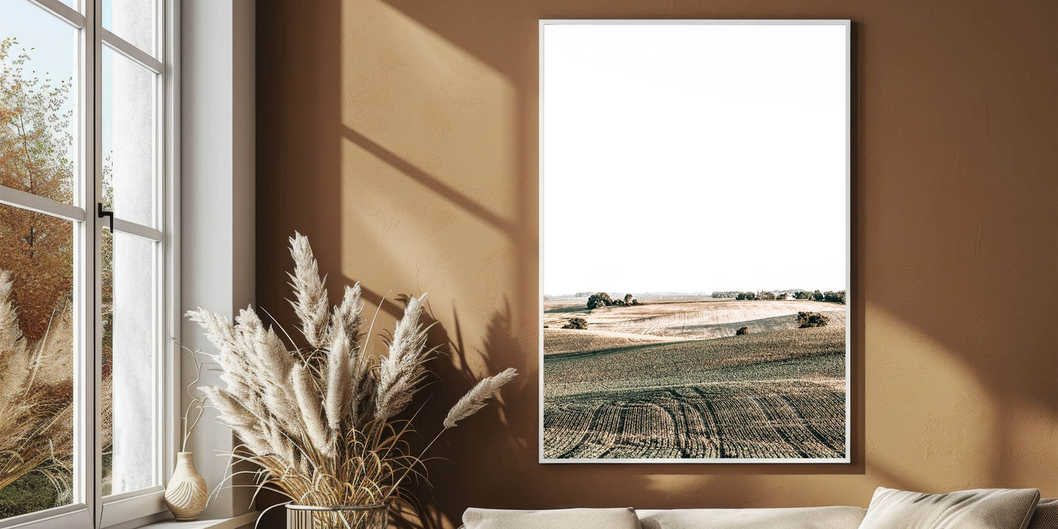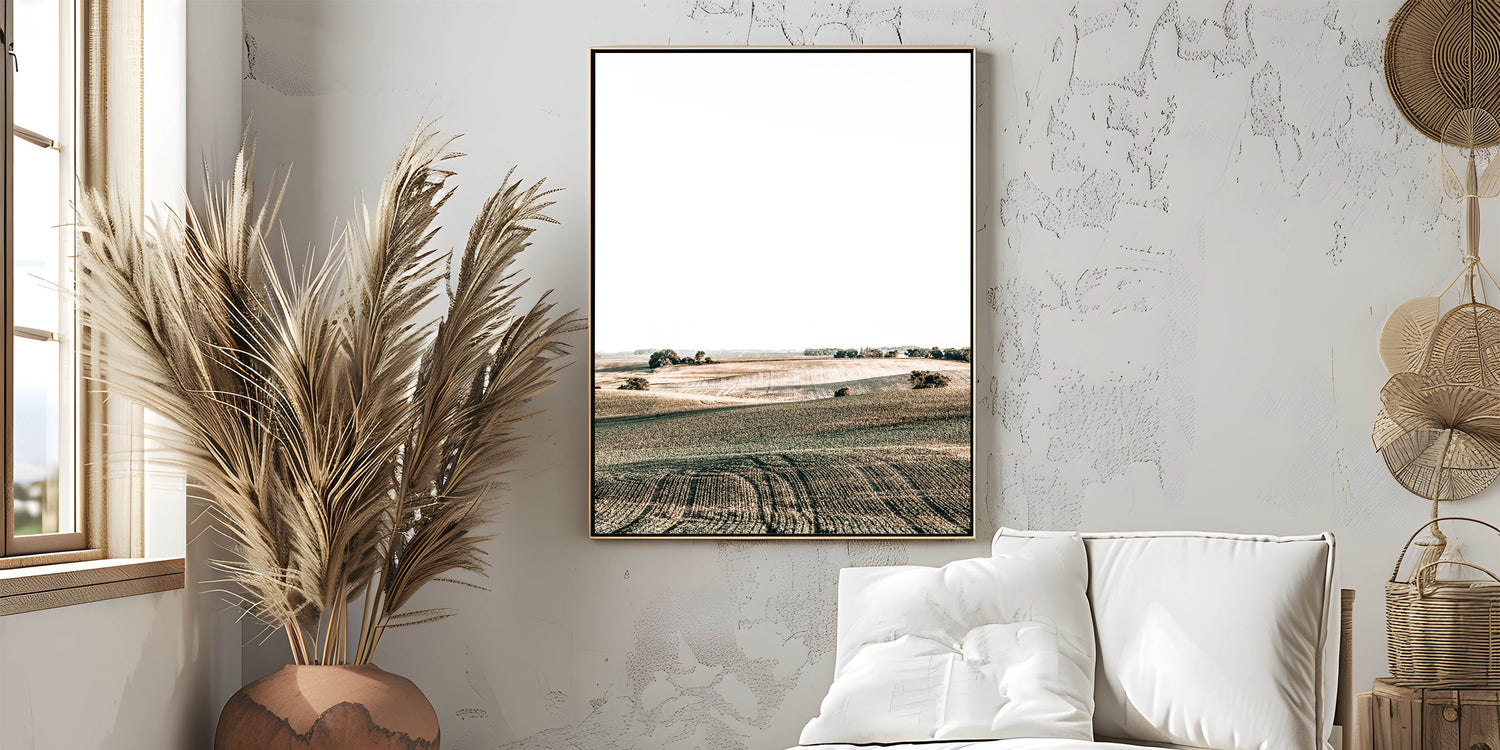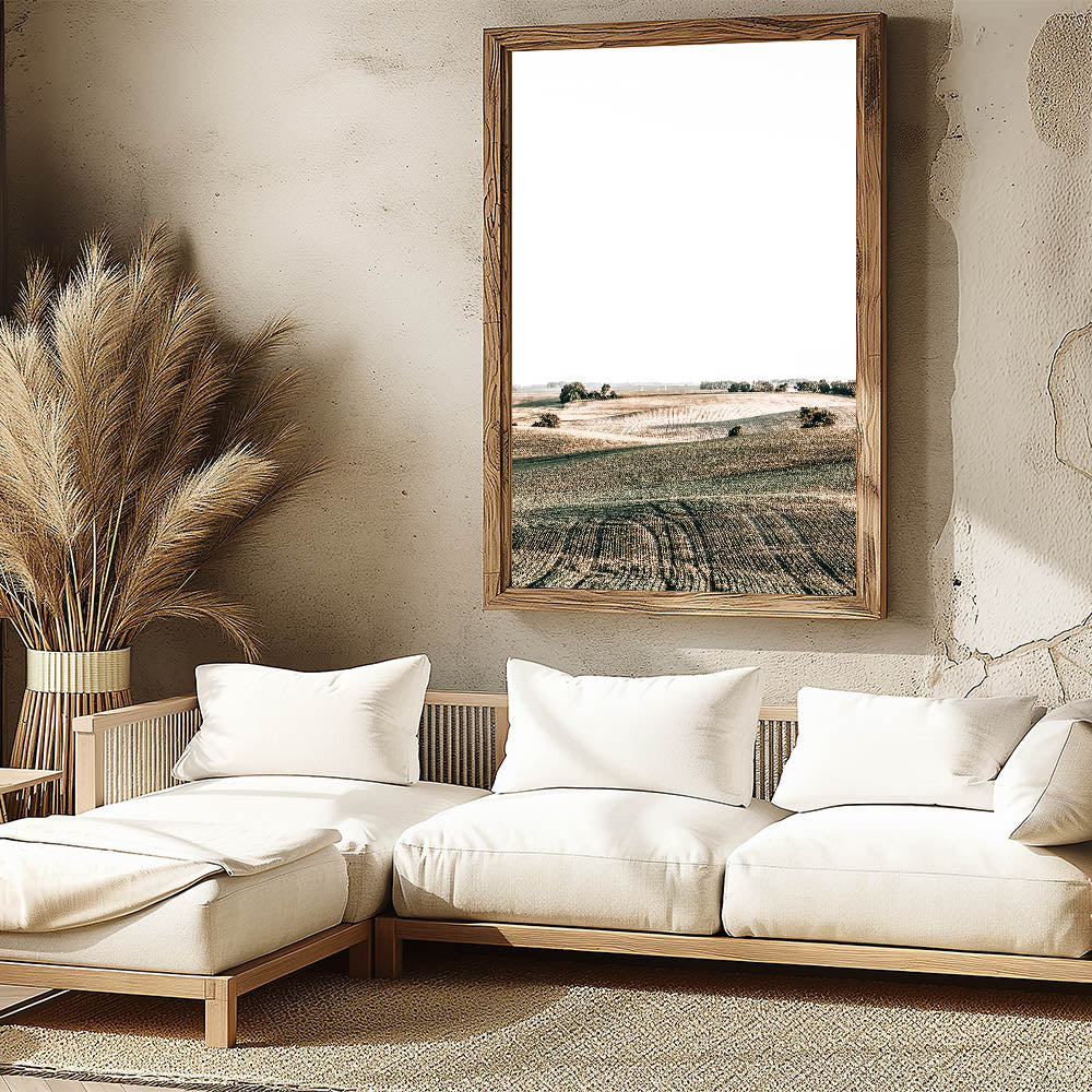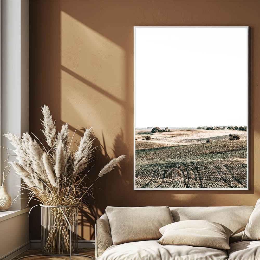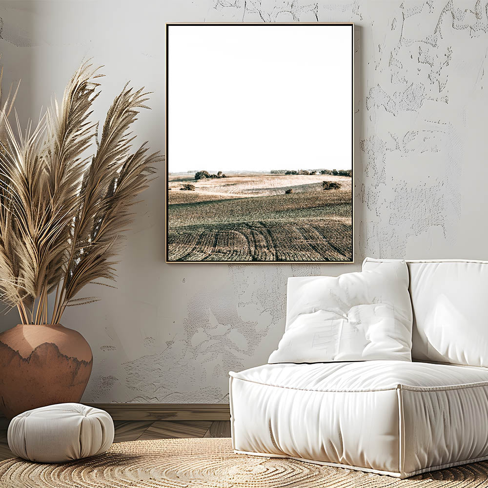 Transform your space with this stunning Farmhouse Wall Art, featuring rolling fields under a bright sky. The soft curves of the landscape and the subtle shades of green and brown create a sense of openness and tranquility, perfect for adding a touch of country living style to your home. This peaceful scene captures the beauty of the countryside, making it an ideal choice for anyone looking to enhance their space with rustic charm and vintage farmhouse prints.