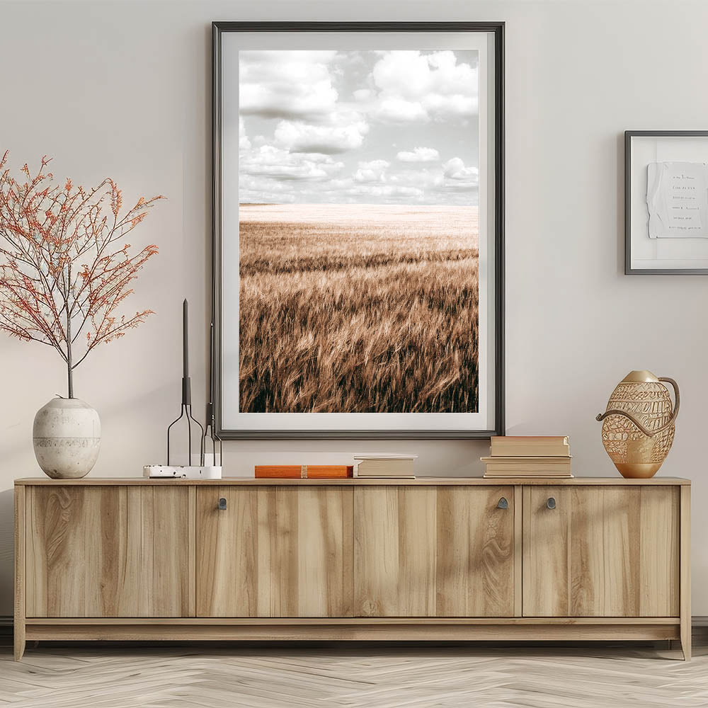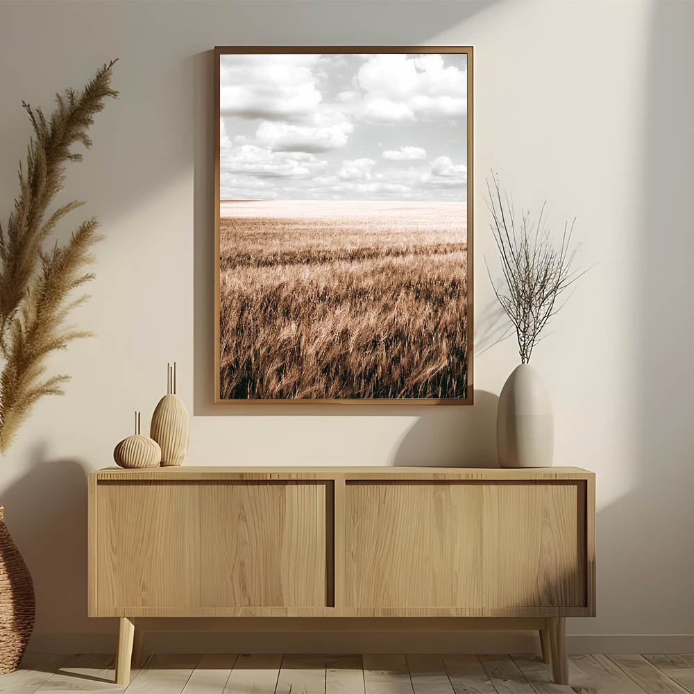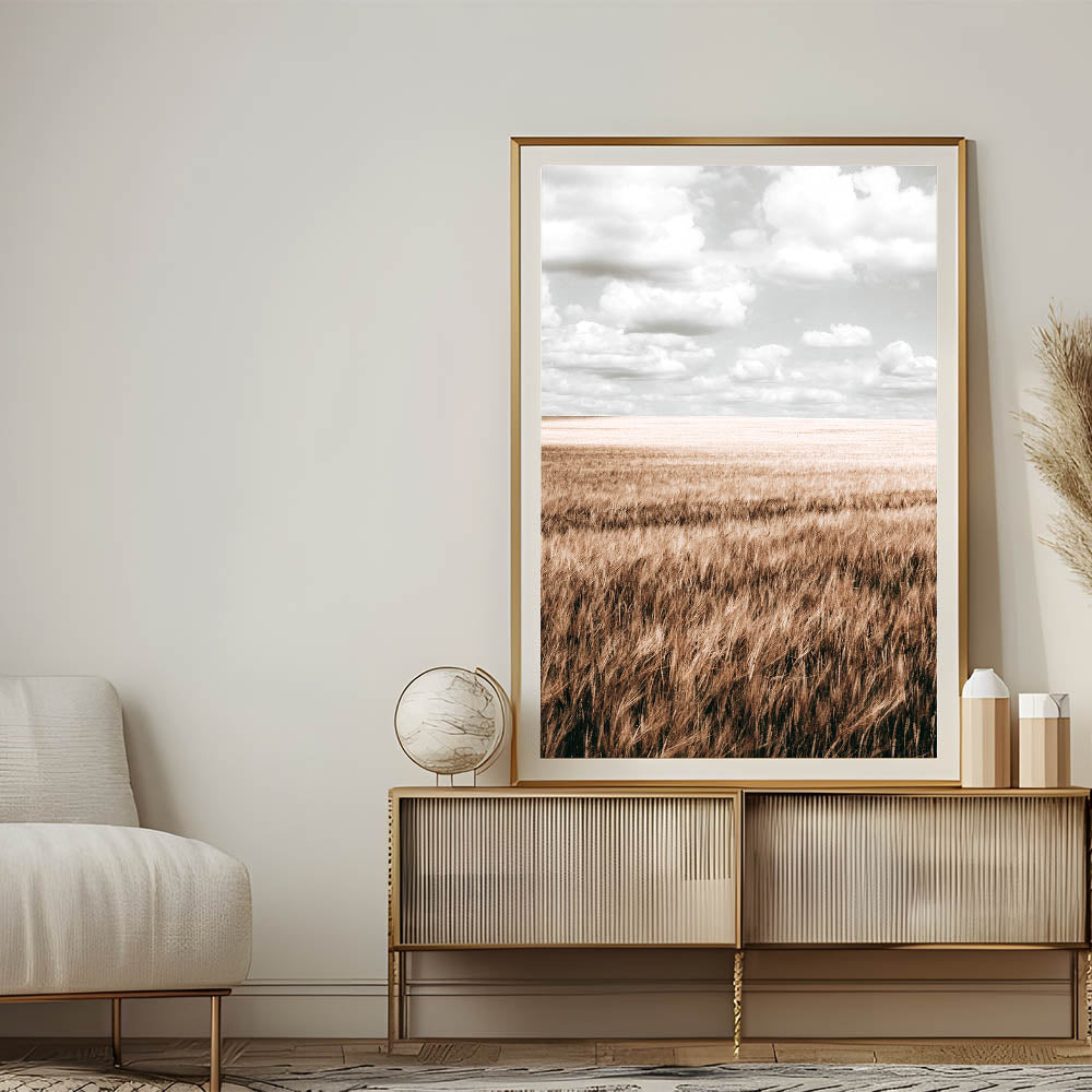 Elevate your home decor with this beautiful Farmhouse Wall Art featuring an expansive wheat field under a soft, cloud-filled sky. The delicate contrast between the golden field and the light sky creates a calming, peaceful atmosphere perfect for any room in your home. This rustic farmhouse decor captures the simplicity of country living style, making it an ideal addition for those who love the charm and elegance of vintage farmhouse prints.