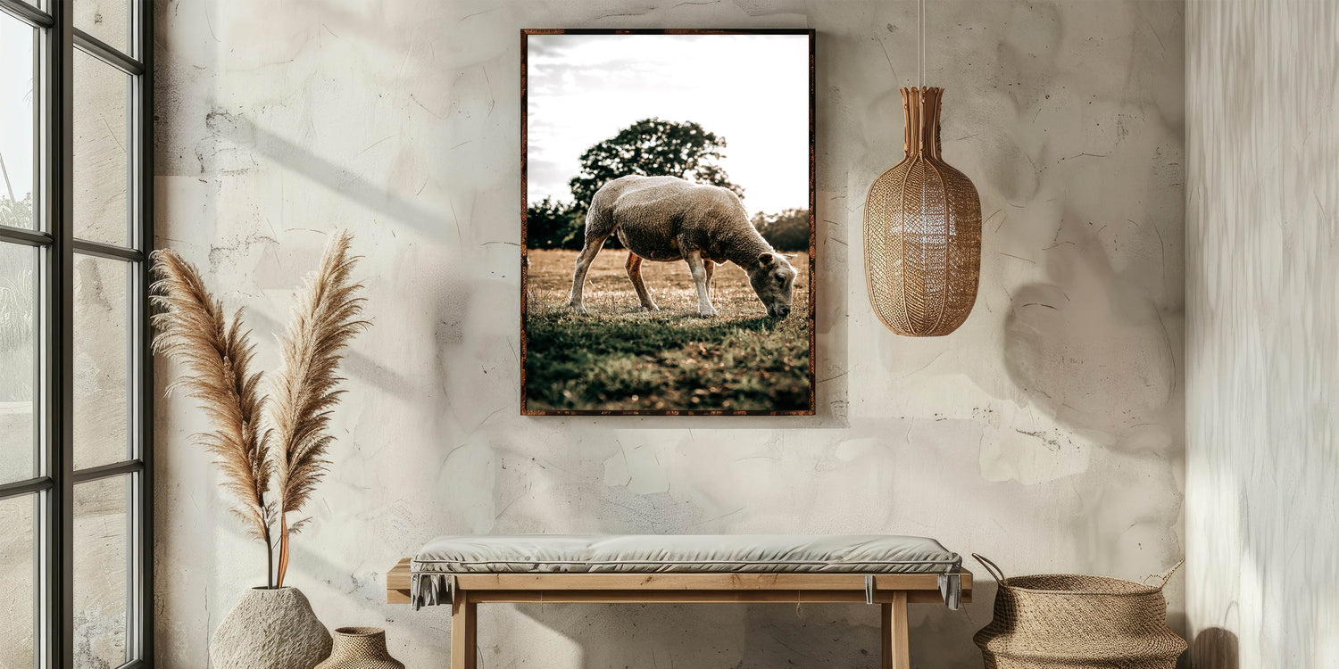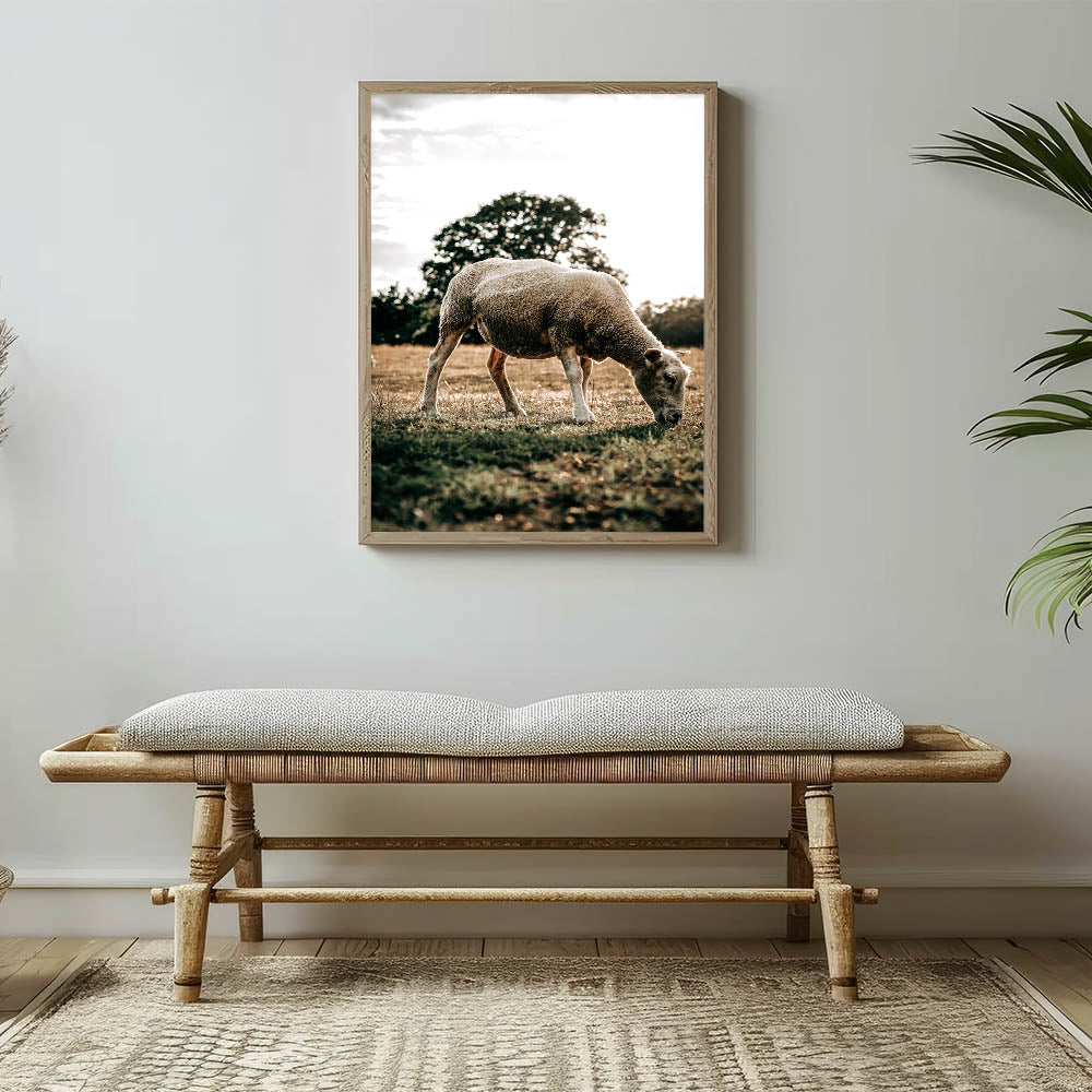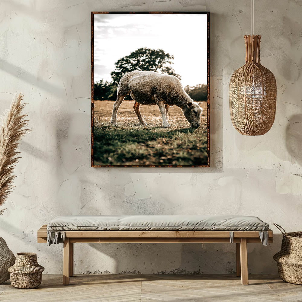 Capture the quiet beauty of farm life with this "Grazing Sheep in Sunset" farmhouse wall art. Featuring a peaceful sheep in a sunlit field, this artwork brings the warmth and simplicity of country living into your home. The golden hues of the sunset and soft textures of the sheep’s wool make this a perfect piece for any farmhouse-style decor, creating a calming atmosphere in kitchens, living rooms, or even bedrooms.