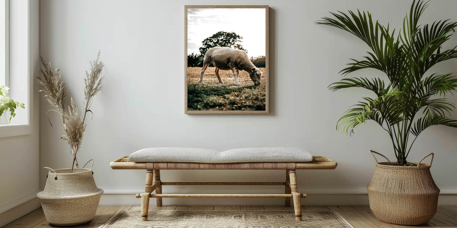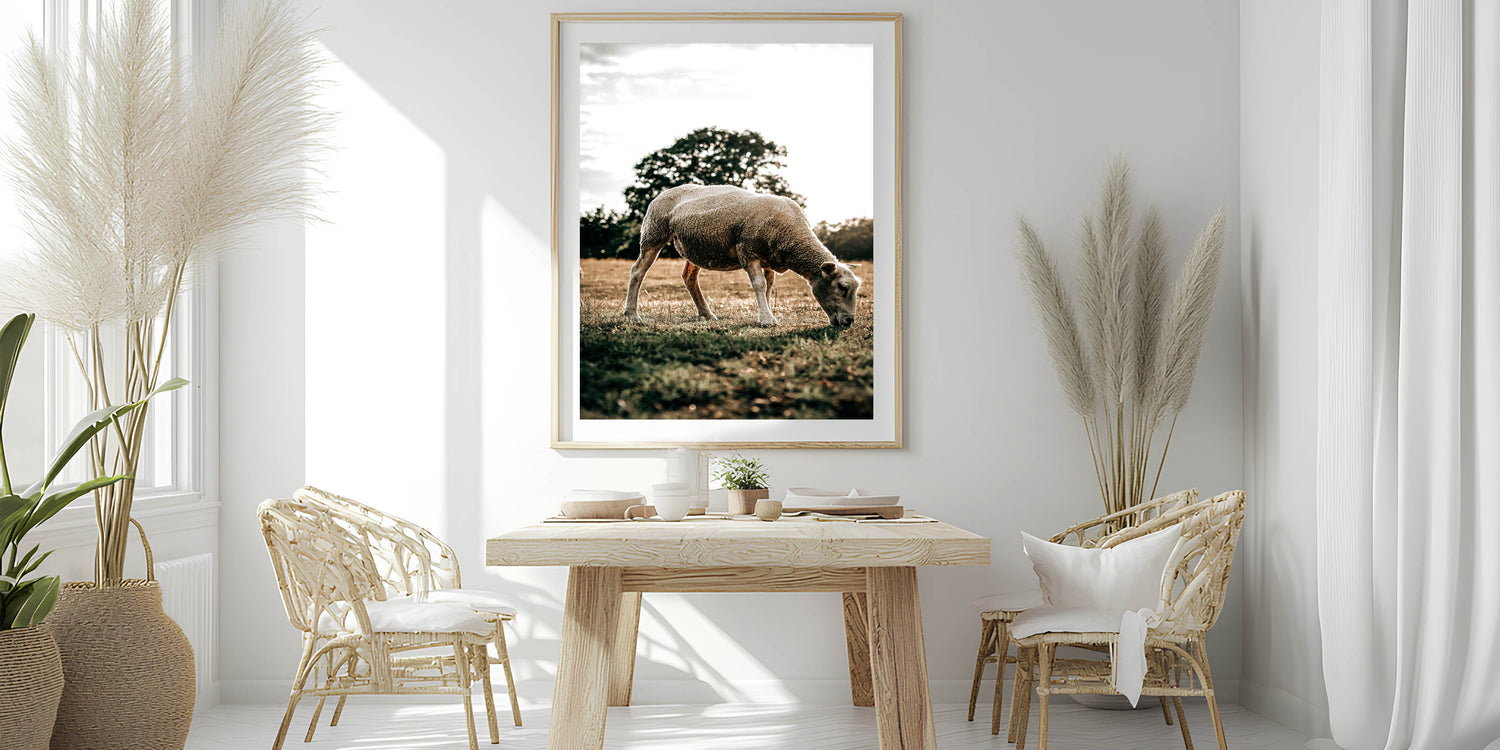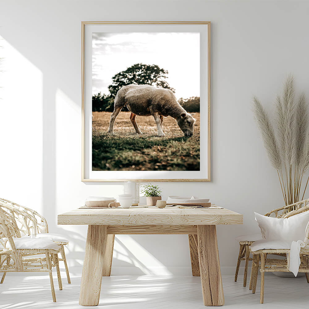 Capture the quiet beauty of farm life with this "Grazing Sheep in Sunset" farmhouse wall art. Featuring a peaceful sheep in a sunlit field, this artwork brings the warmth and simplicity of country living into your home. The golden hues of the sunset and soft textures of the sheep’s wool make this a perfect piece for any farmhouse-style decor, creating a calming atmosphere in kitchens, living rooms, or even bedrooms.