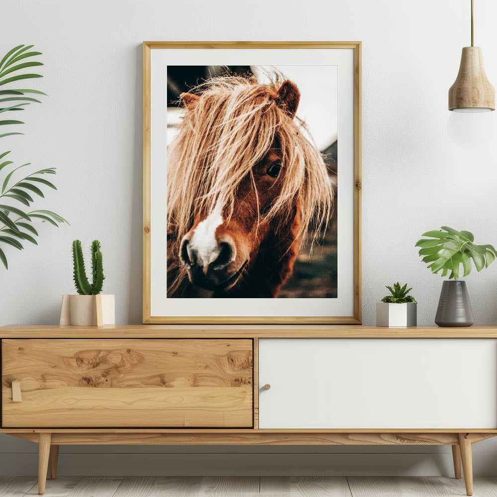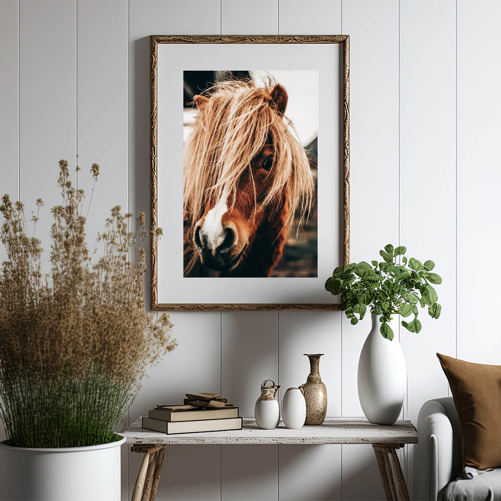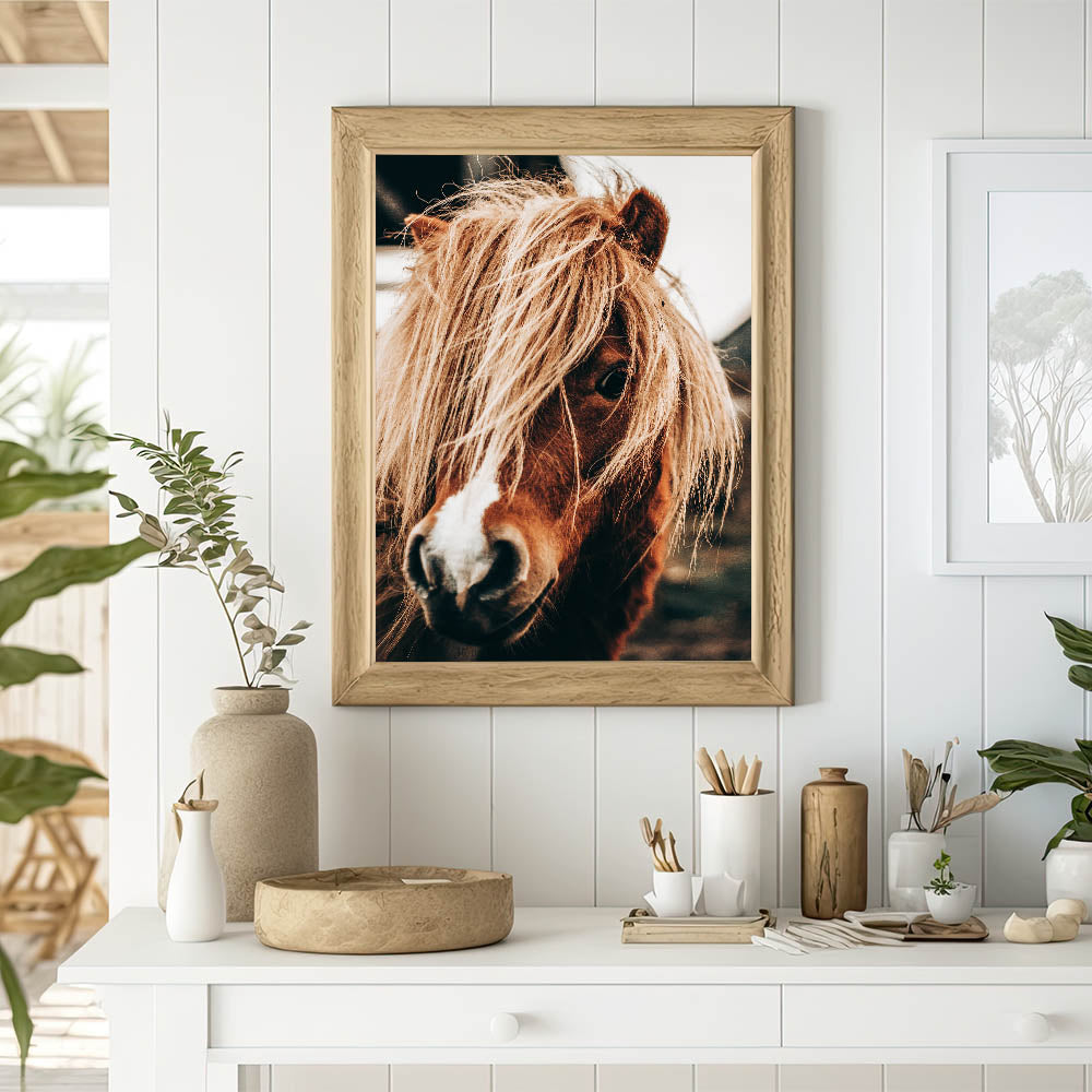 • Rustic charm: A portrait of a pony with a flowing mane, ideal for enhancing your farmhouse-style decor.