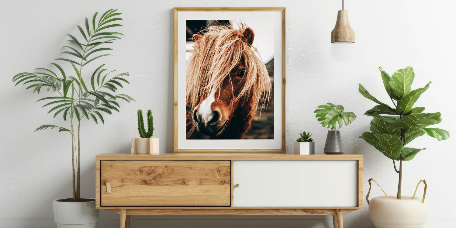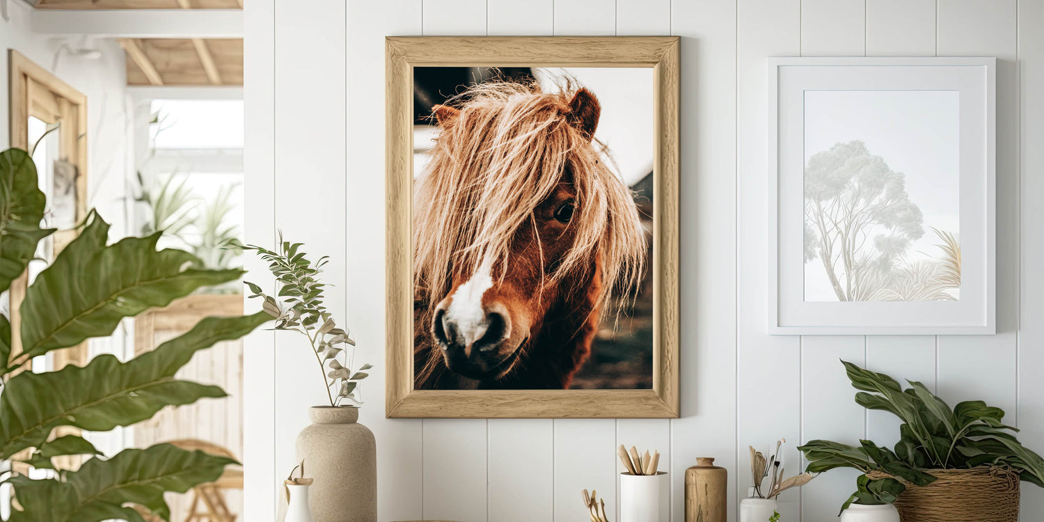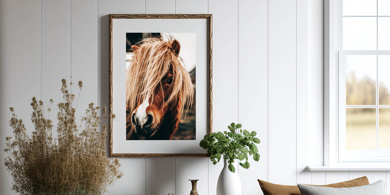 • Rustic charm: A portrait of a pony with a flowing mane, ideal for enhancing your farmhouse-style decor.