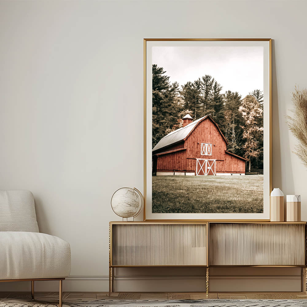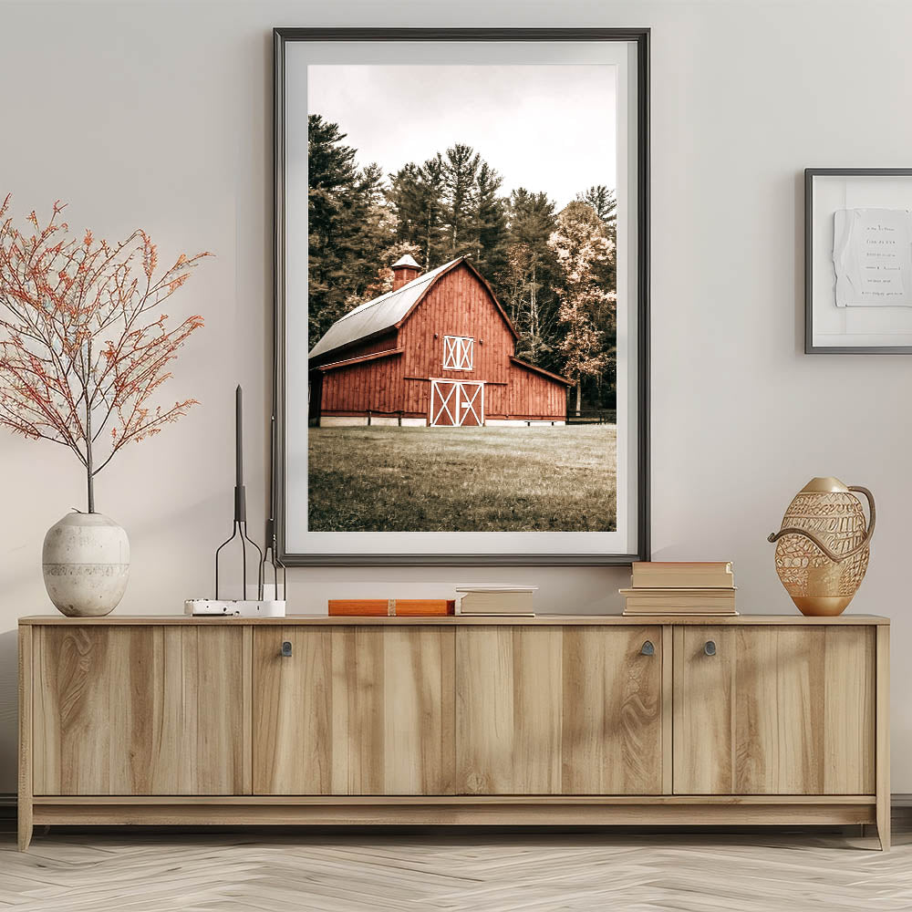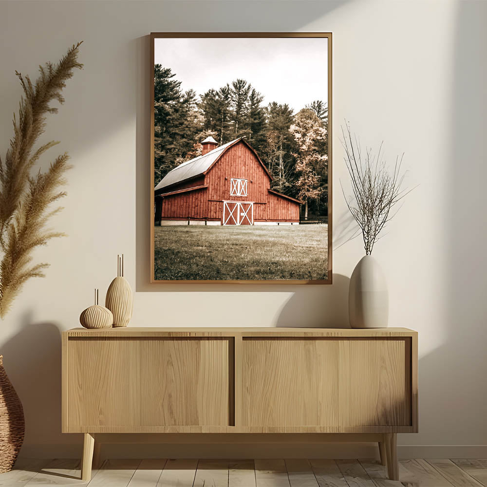 This artwork is ideal for living rooms, kitchens, or hallways, bringing a sense of rural tranquility and nostalgia. The vibrant red barn surrounded by nature offers a timeless, rustic appeal that enhances farmhouse-style decor.