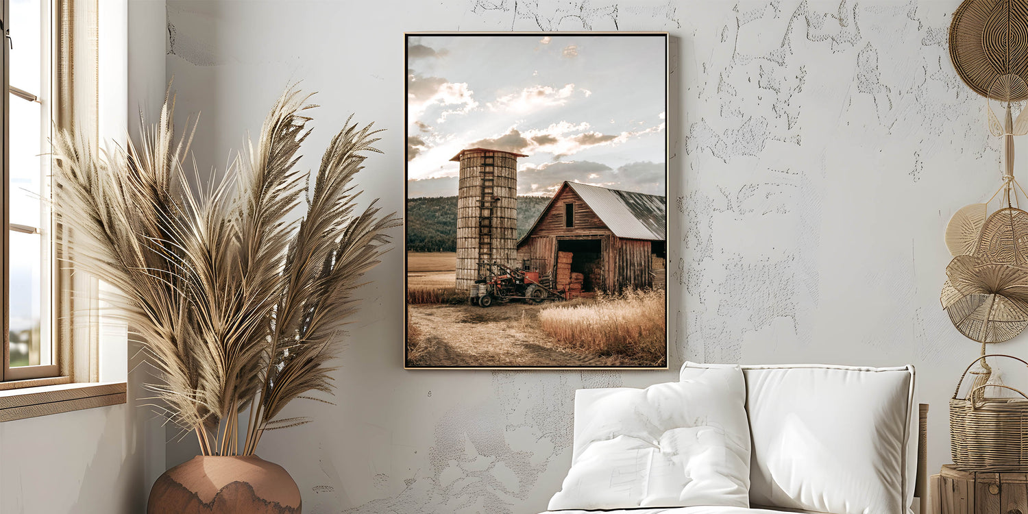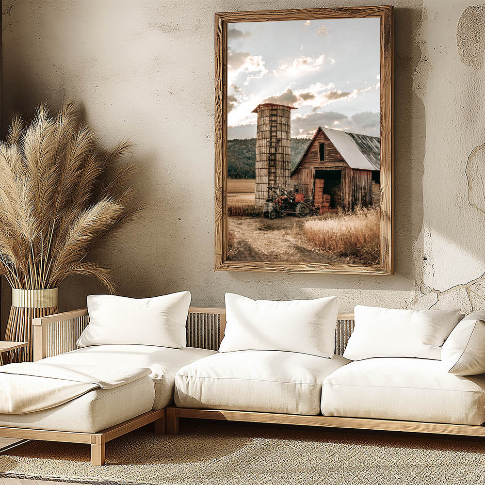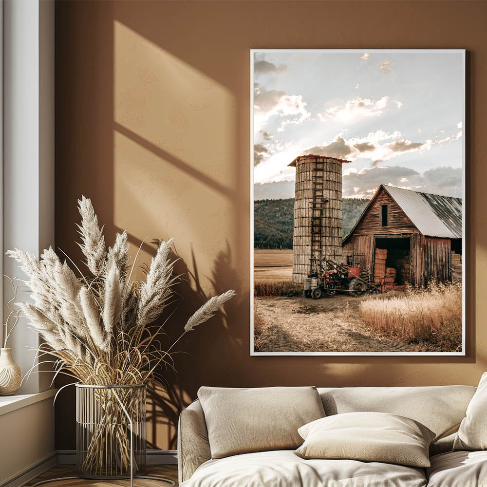 Bring the tranquil charm of the countryside into your home with this Farmhouse Wall Art, featuring a rustic barn and silo under a picturesque sky. This artwork captures the simplicity and beauty of rural life, making it an ideal addition to any country living style decor. The weathered wood of the barn and the aged look of the silo evoke a sense of nostalgia, transporting you to a peaceful farm setting. Perfect for adding vintage-inspired charm to any room.