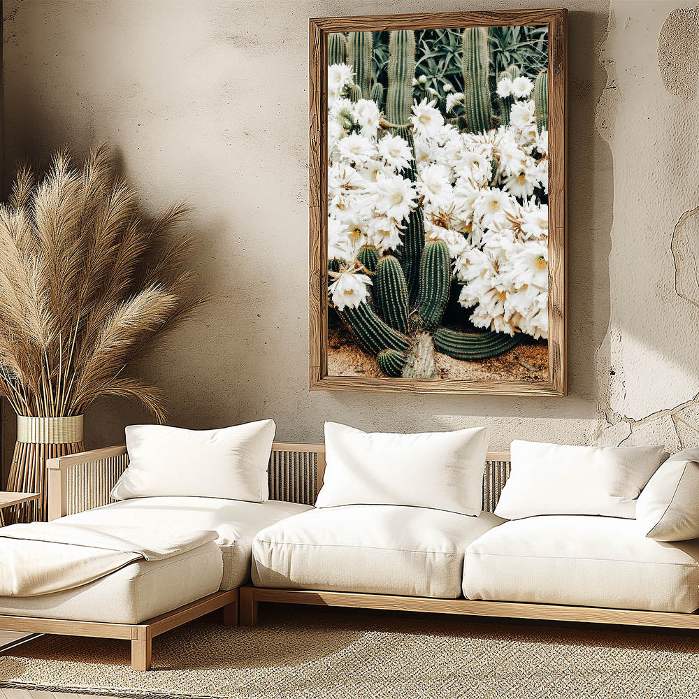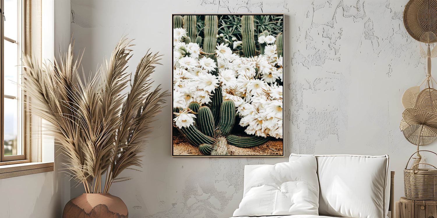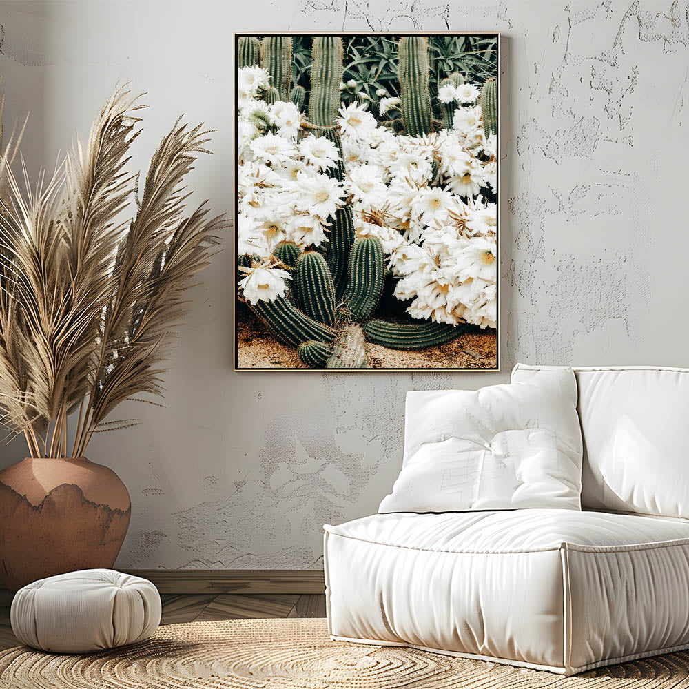 Introduce a touch of rustic charm to your home with this captivating farmhouse wall art featuring beautiful white cactus flowers. This artwork seamlessly blends the raw beauty of nature with vintage-inspired farmhouse aesthetics, making it a perfect addition to your country living space. The stunning composition of desert cactus and soft white flowers brings a serene and tranquil vibe, ideal for brightening up any room.