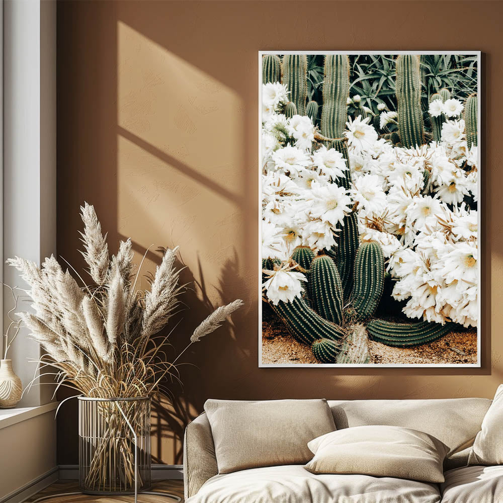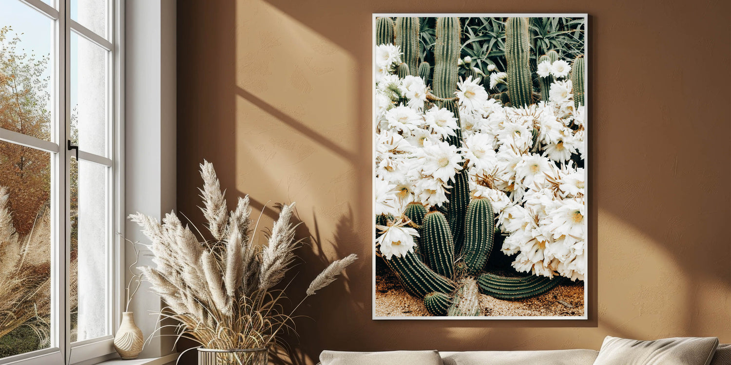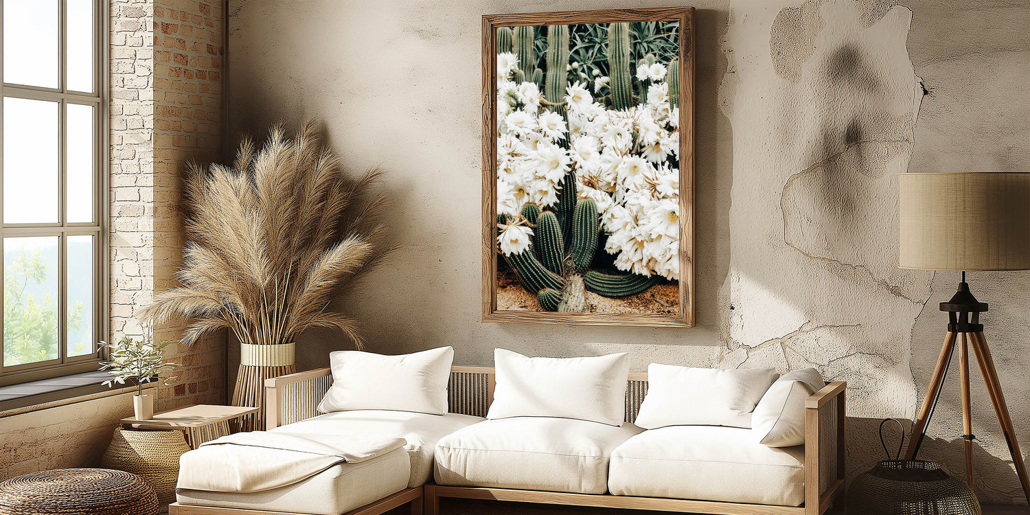 Introduce a touch of rustic charm to your home with this captivating farmhouse wall art featuring beautiful white cactus flowers. This artwork seamlessly blends the raw beauty of nature with vintage-inspired farmhouse aesthetics, making it a perfect addition to your country living space. The stunning composition of desert cactus and soft white flowers brings a serene and tranquil vibe, ideal for brightening up any room.