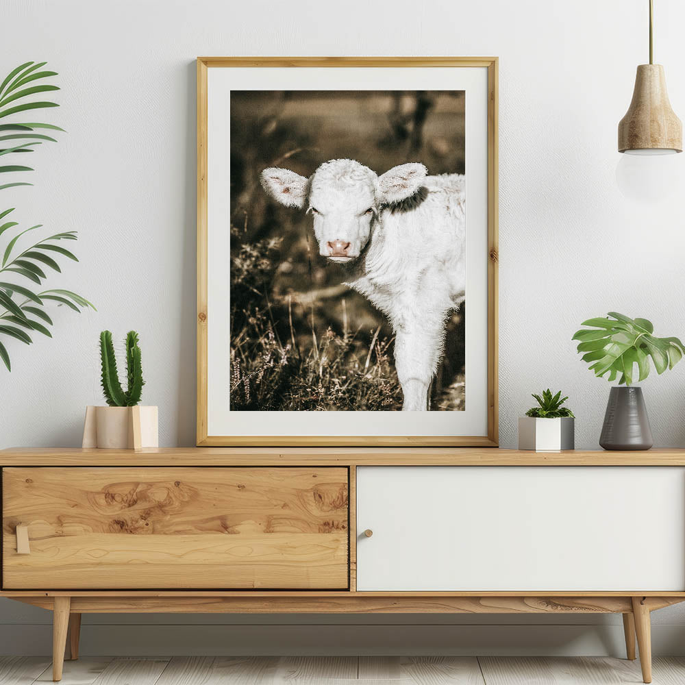 This charming calf portrait is ideal for adding a touch of nature and rustic charm to your living room, bedroom, or nursery.
