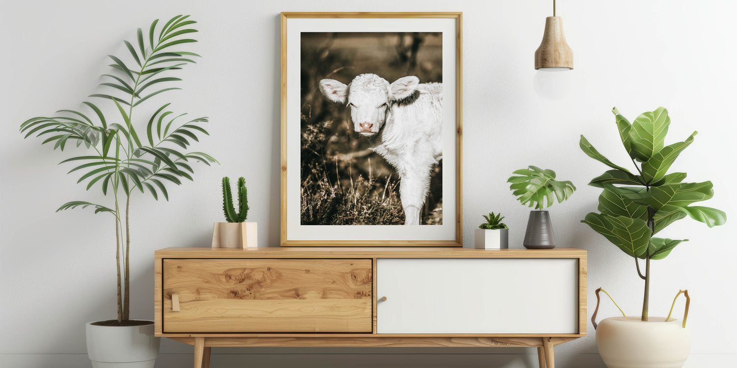 - Rustic charm: The gentle expression of the calf and the natural meadow background add a calming, country-style ambiance to your decor.