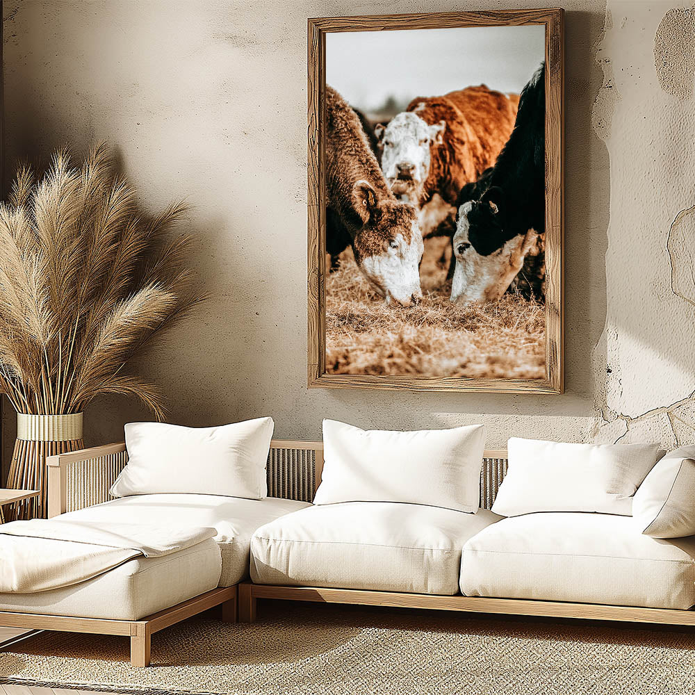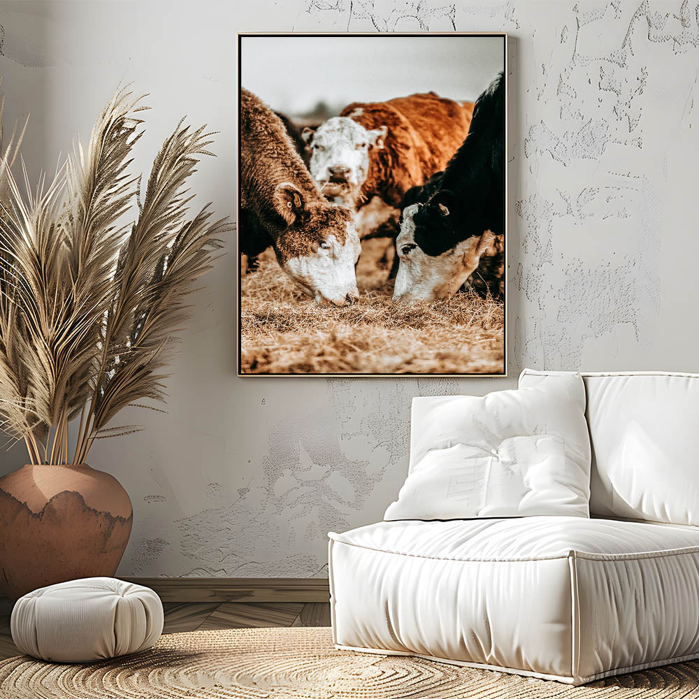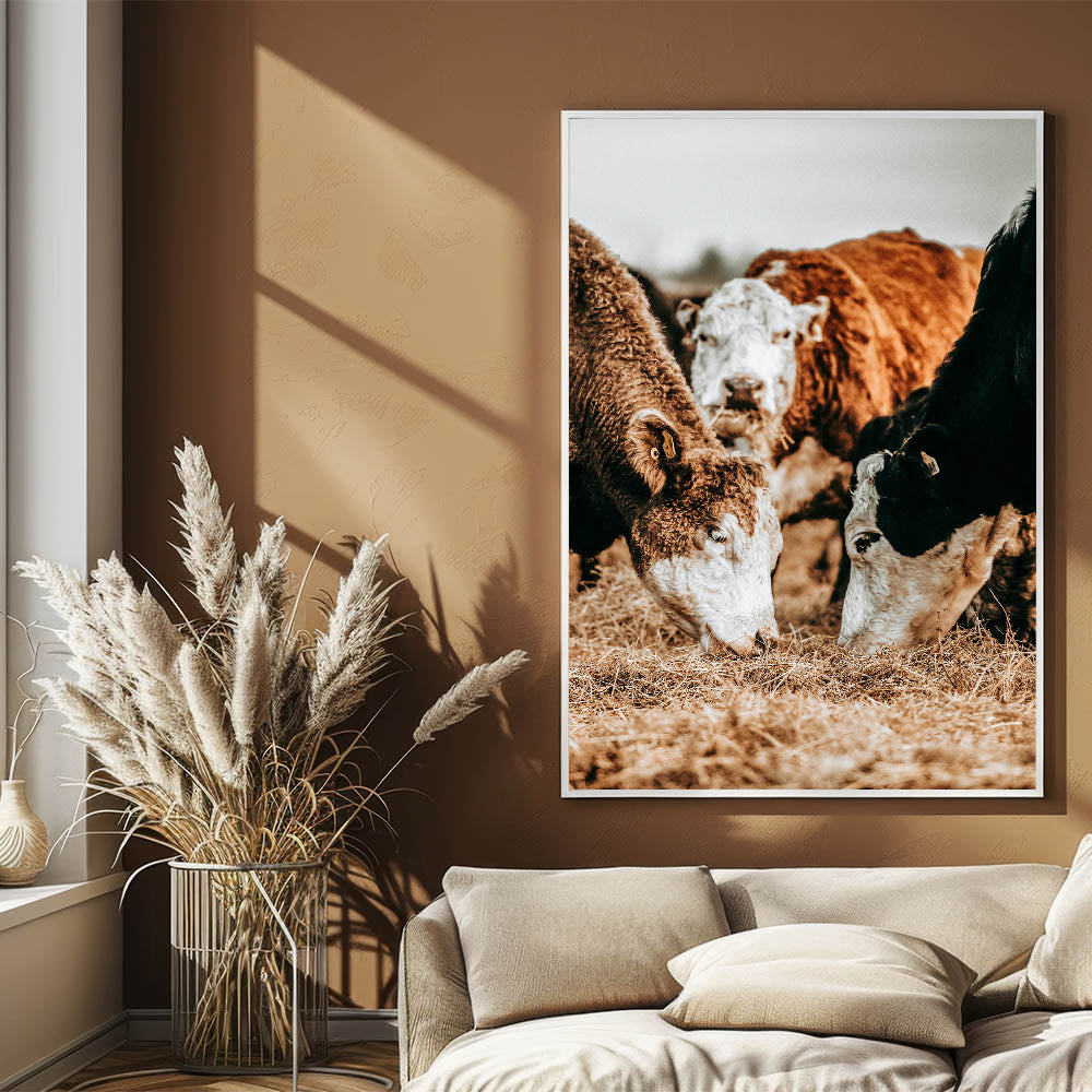 Celebrate the beauty of rural life with this striking farmhouse wall art featuring a close-up of cows peacefully grazing in a rustic farm setting. The rich textures and earthy tones of the cows and hay evoke the warmth and simplicity of country living. This vintage-inspired artwork is the perfect piece to bring a touch of rustic charm to your home, ideal for enhancing farmhouse-style or country-themed interiors.