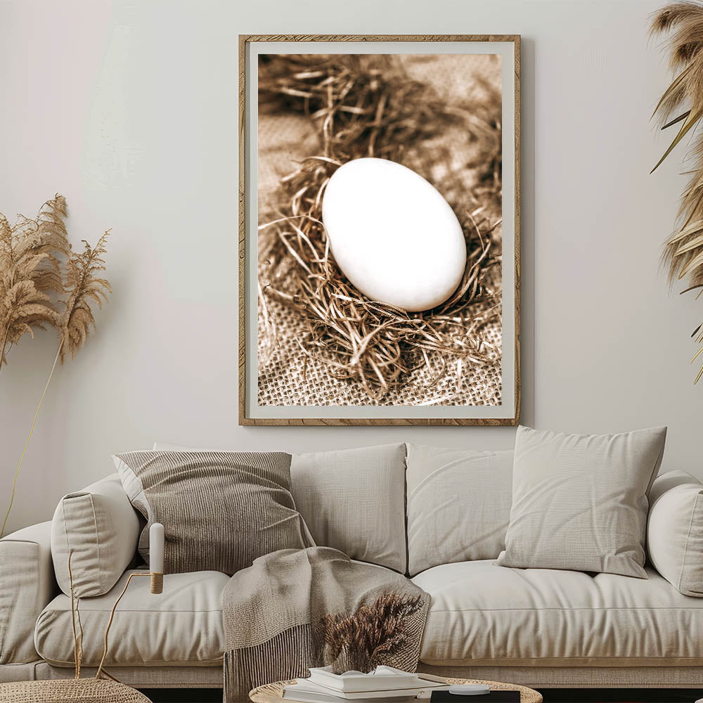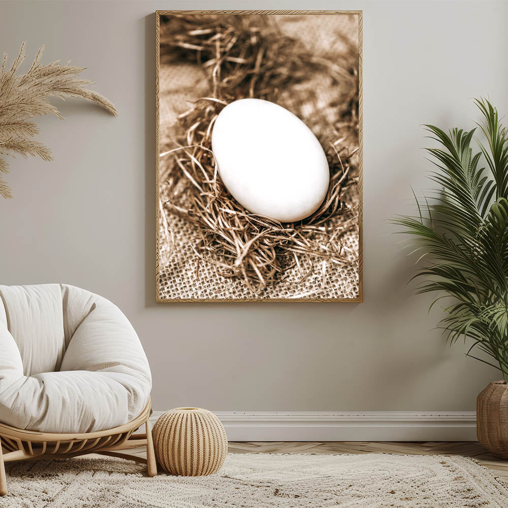 Bring the simplicity and beauty of farm life into your home with this serene farmhouse wall art featuring a close-up of an egg nestled in a bed of straw. This minimalistic piece captures the essence of country living, offering a calming and peaceful touch to any room. The natural textures and earthy tones create a perfect blend of rustic charm and vintage farmhouse aesthetic, making this art an ideal addition to your farmhouse-style decor.