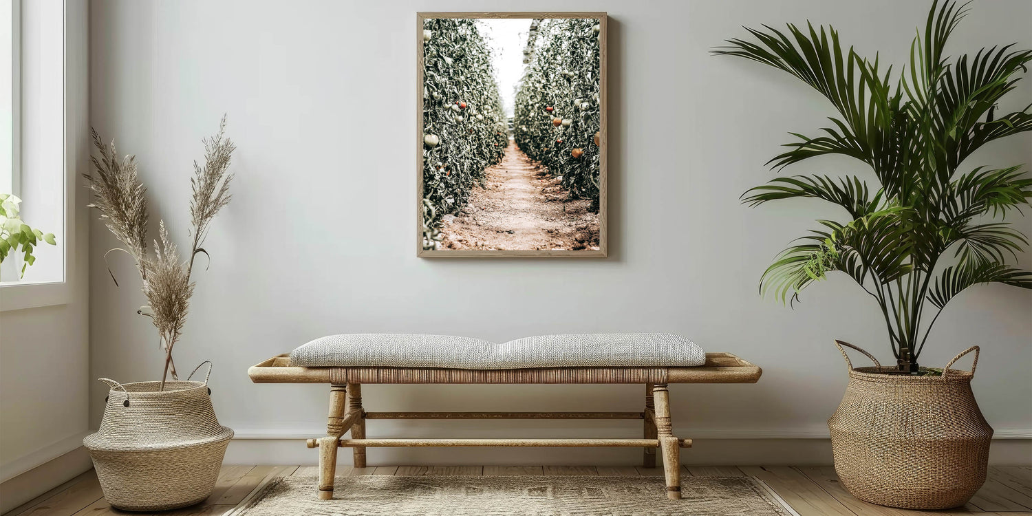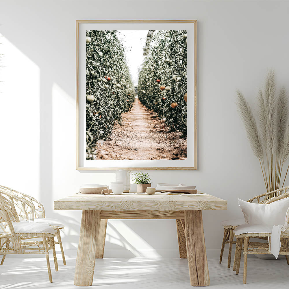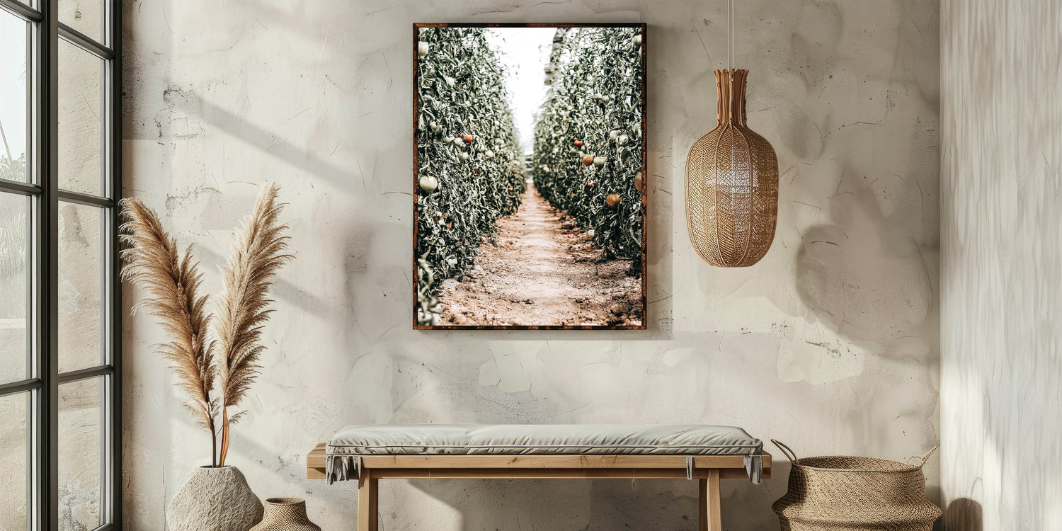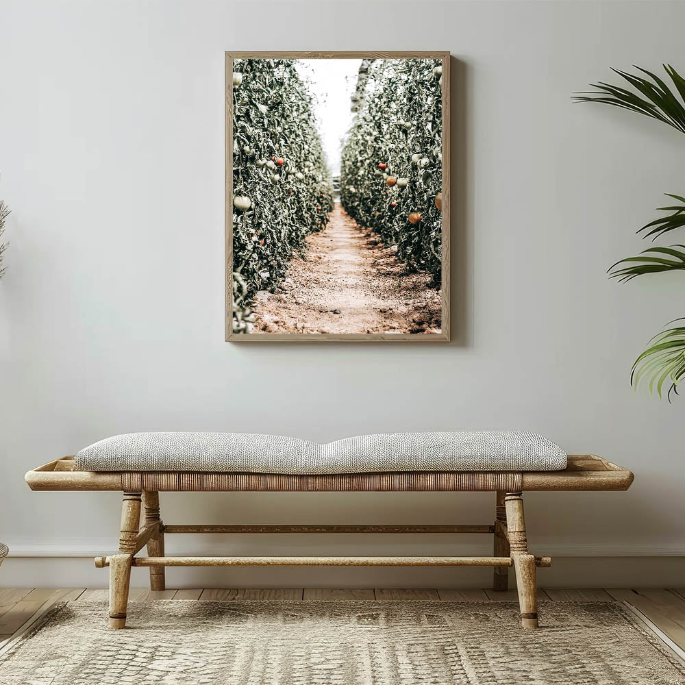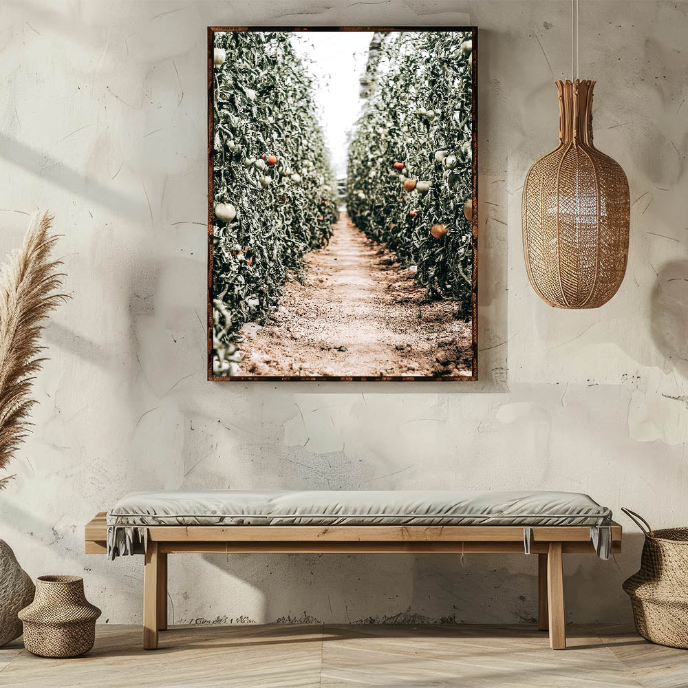 This captivating piece of Farmhouse Wall Art captures the peaceful serenity of a tomato field, drawing you into the heart of country living. The vibrant greenery combined with the ripening tomatoes gives a touch of rustic charm, perfect for those who appreciate the tranquility of rural life. The perspective of the dirt path through the crops evokes a sense of nature's harmony, making this artwork an ideal addition to any farmhouse-style wall decor.