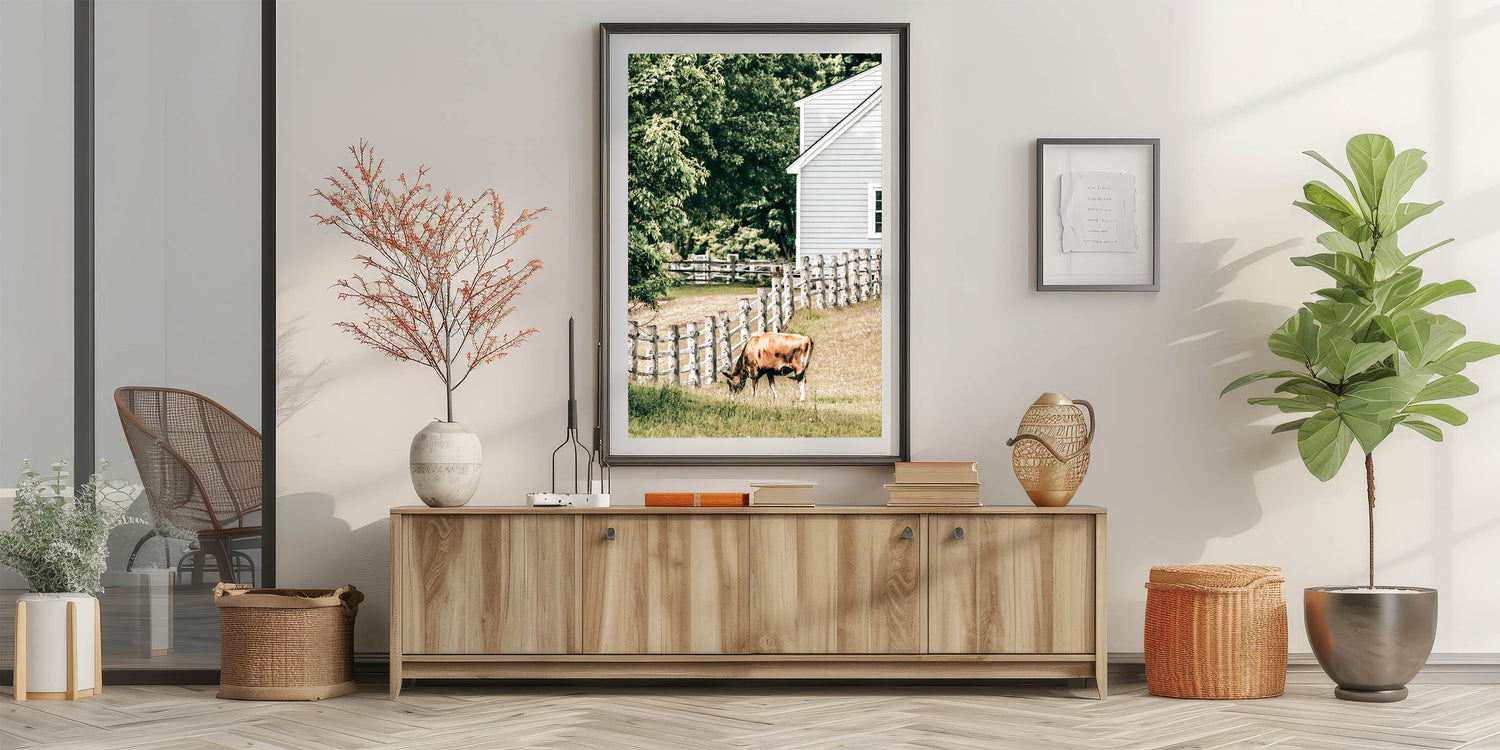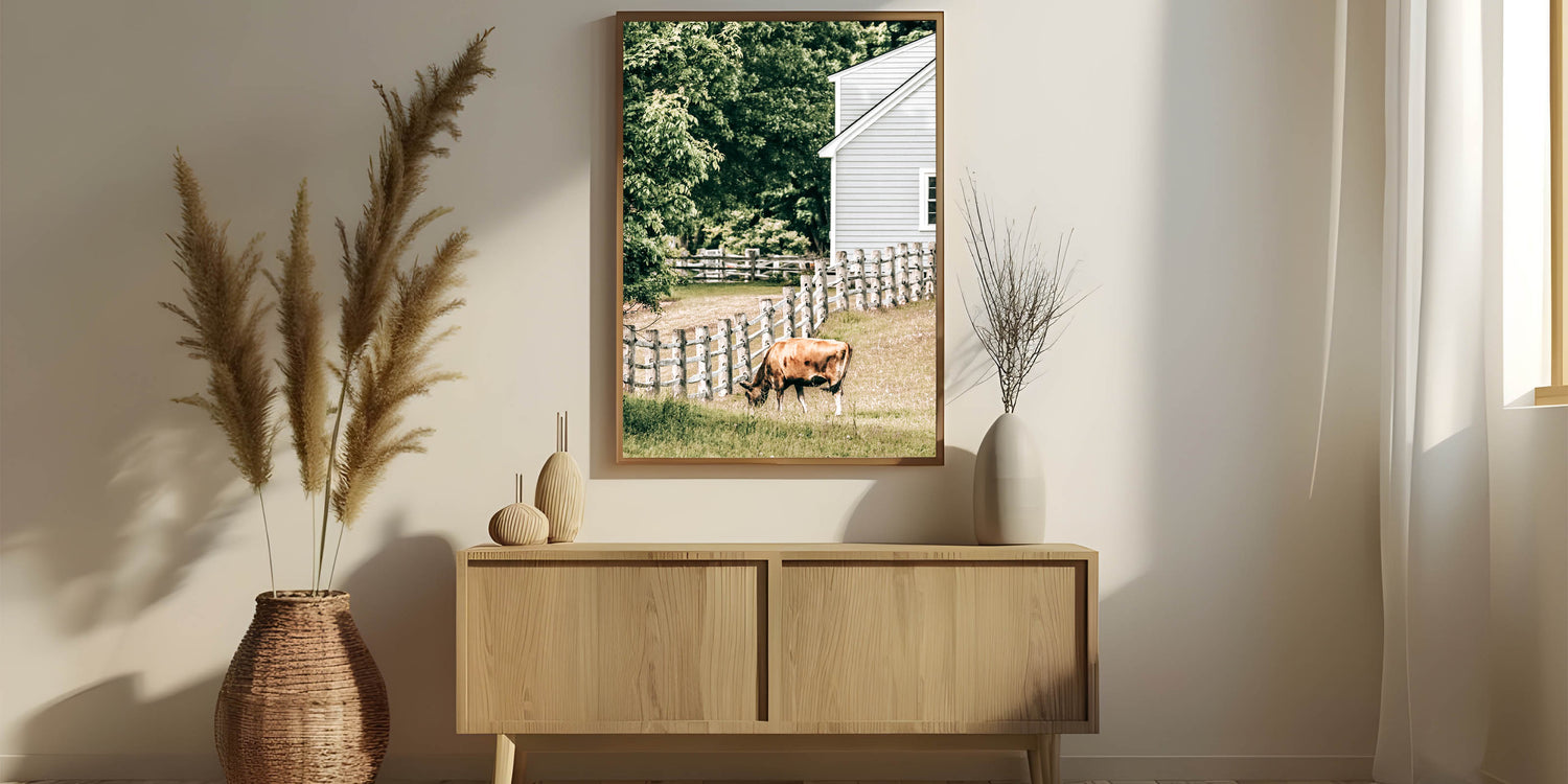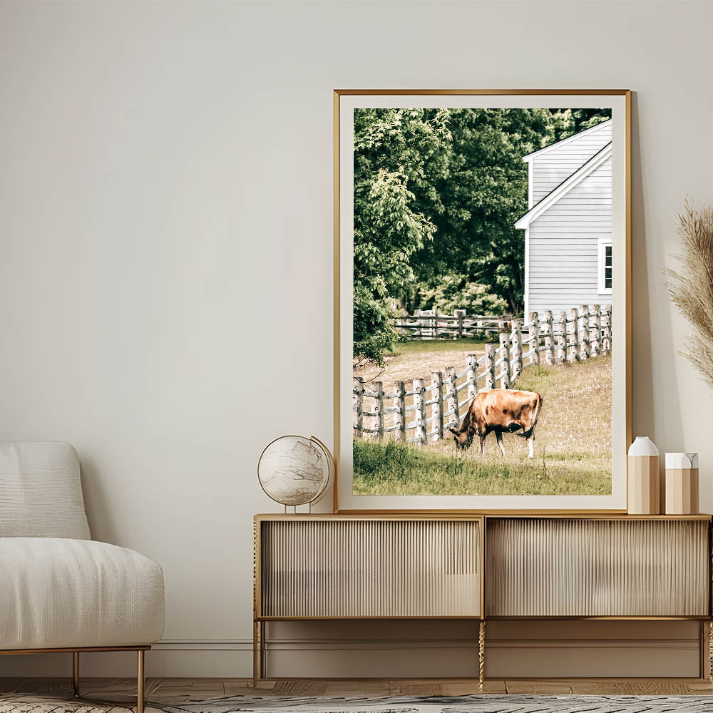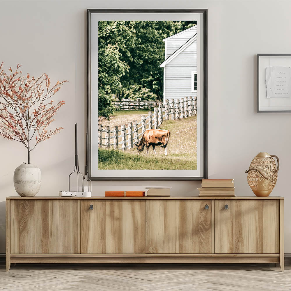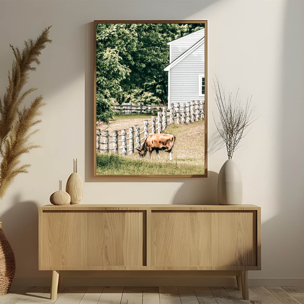 Transform your space with this charming farmhouse wall art, featuring a peaceful scene of a cow grazing near a classic wooden fence and farmhouse. This rustic artwork encapsulates the serene beauty of country living, making it a perfect addition to your farmhouse-style or rustic décor. The warm tones and vintage-inspired design bring an antique farmhouse aesthetic to any room, evoking a sense of calm and nostalgia.