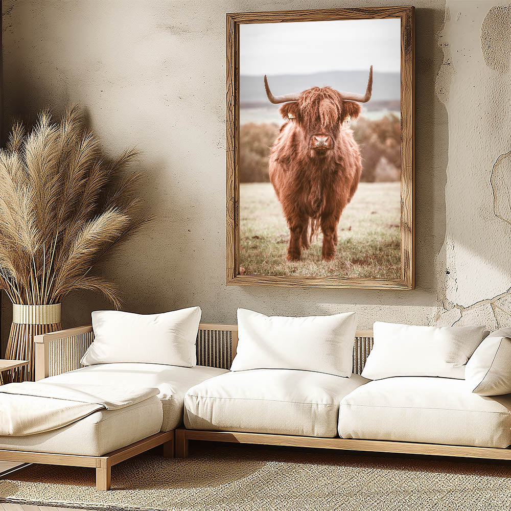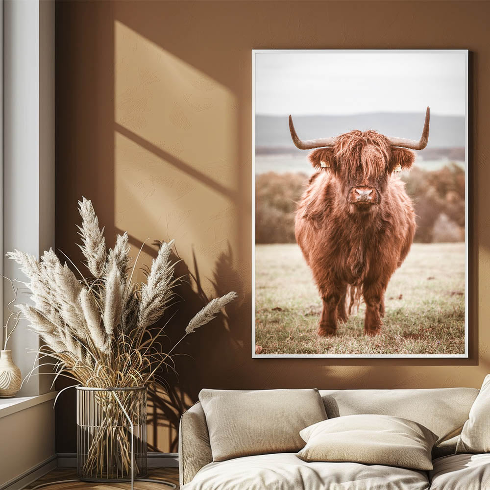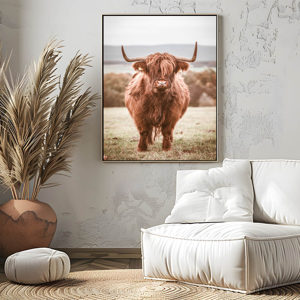 Capture the essence of rustic charm with this striking farmhouse wall art featuring a Highland cow standing proudly against a serene countryside backdrop. This portrait embodies the tranquility and beauty of country living style, making it the perfect addition to your rustic farmhouse decor. The detailed texture and natural tones in this image create a vintage-inspired aesthetic, ideal for anyone seeking an antique farmhouse look in their home.