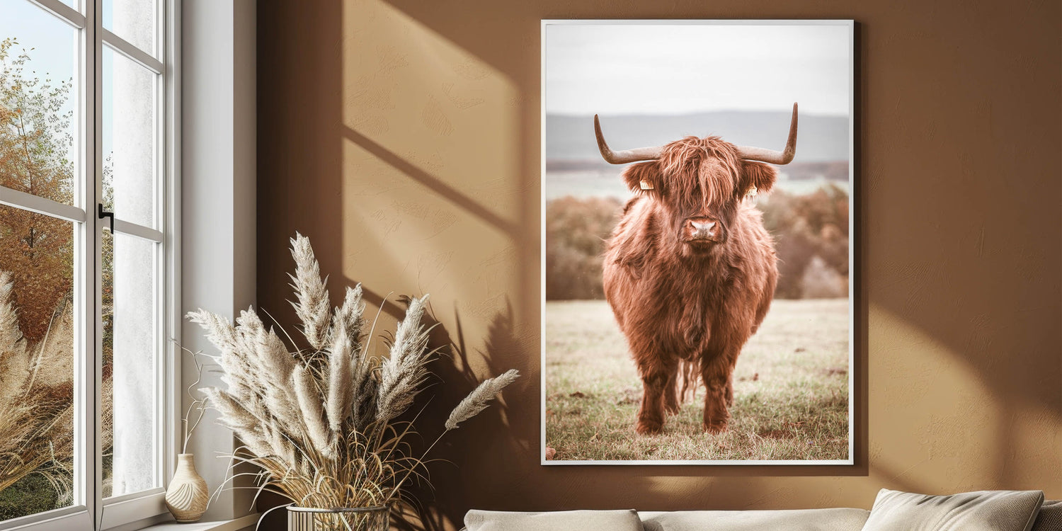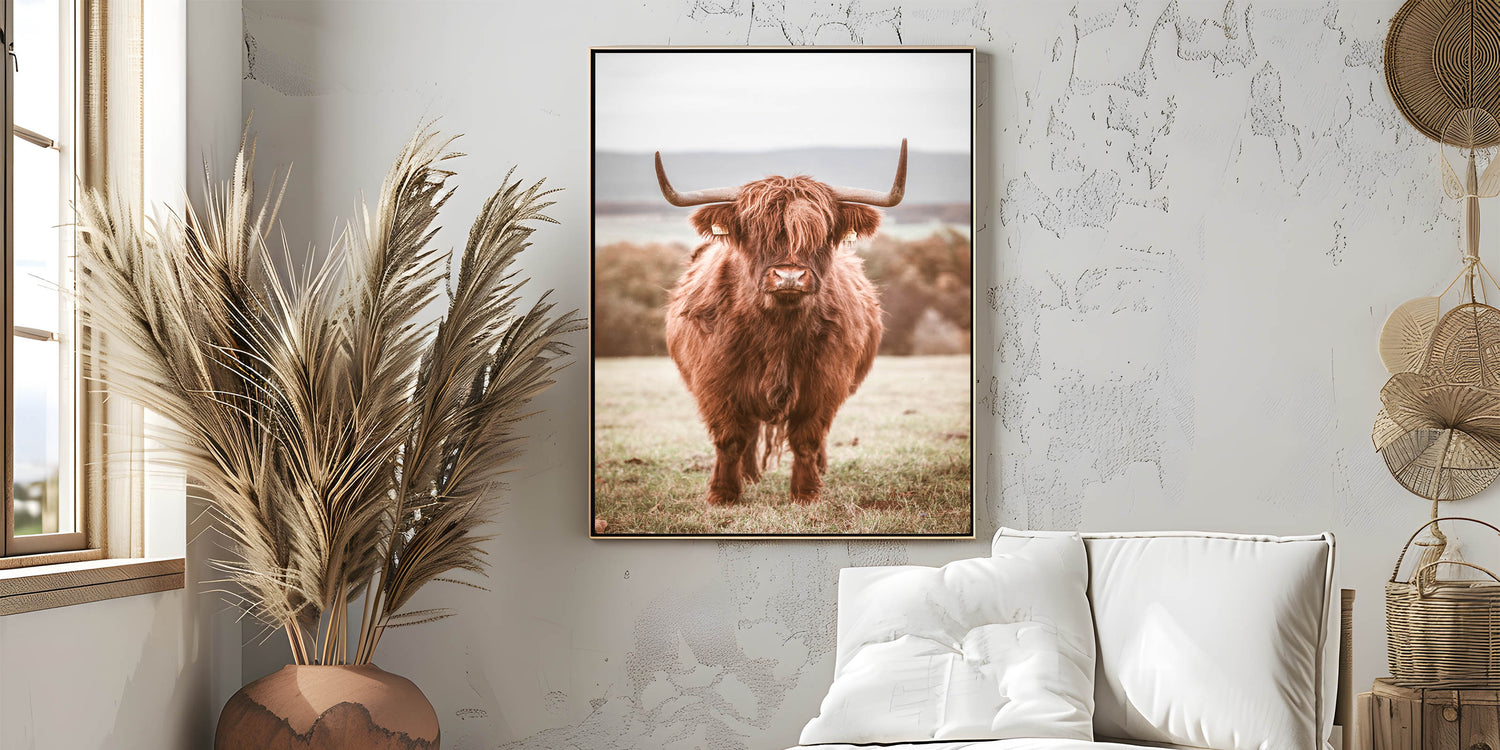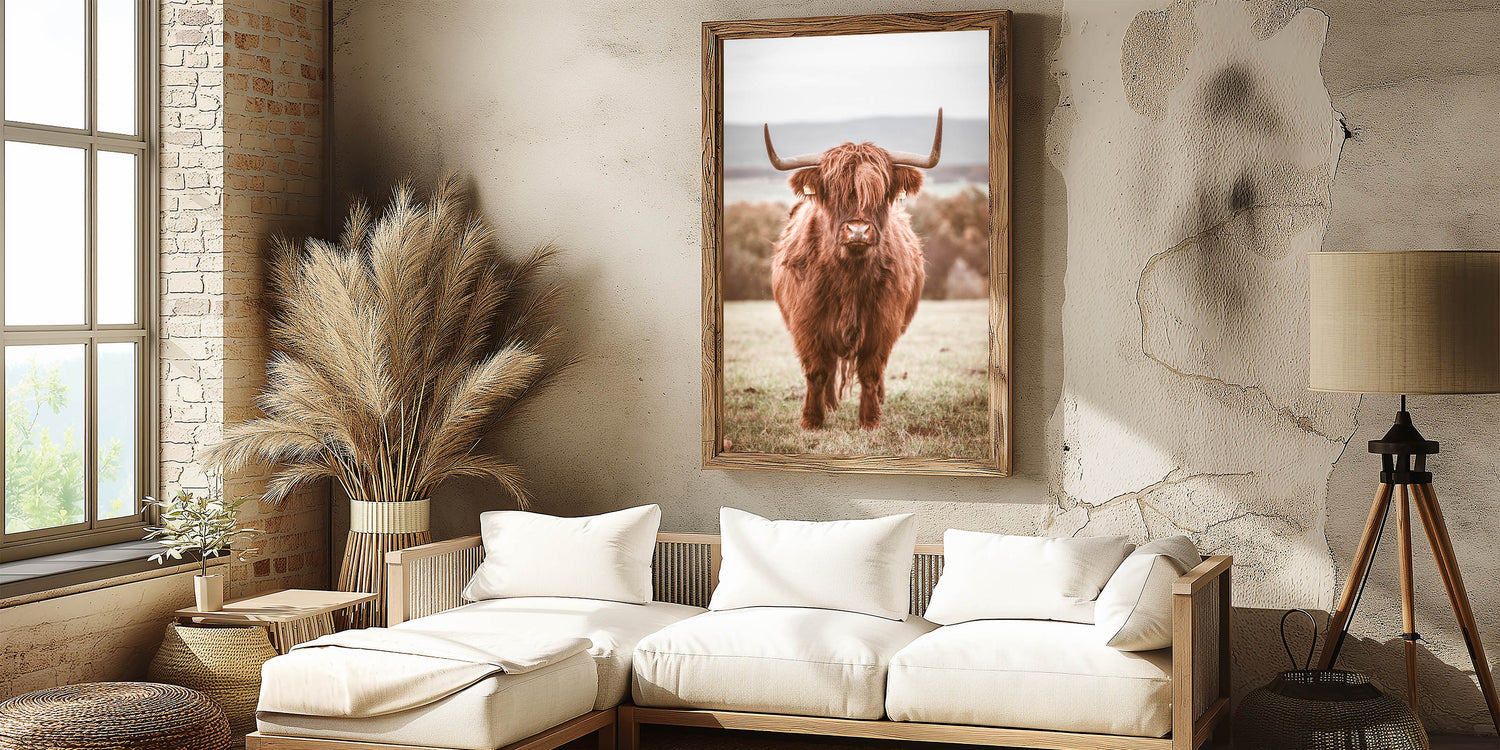 Capture the essence of rustic charm with this striking farmhouse wall art featuring a Highland cow standing proudly against a serene countryside backdrop. This portrait embodies the tranquility and beauty of country living style, making it the perfect addition to your rustic farmhouse decor. The detailed texture and natural tones in this image create a vintage-inspired aesthetic, ideal for anyone seeking an antique farmhouse look in their home.