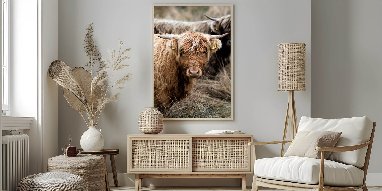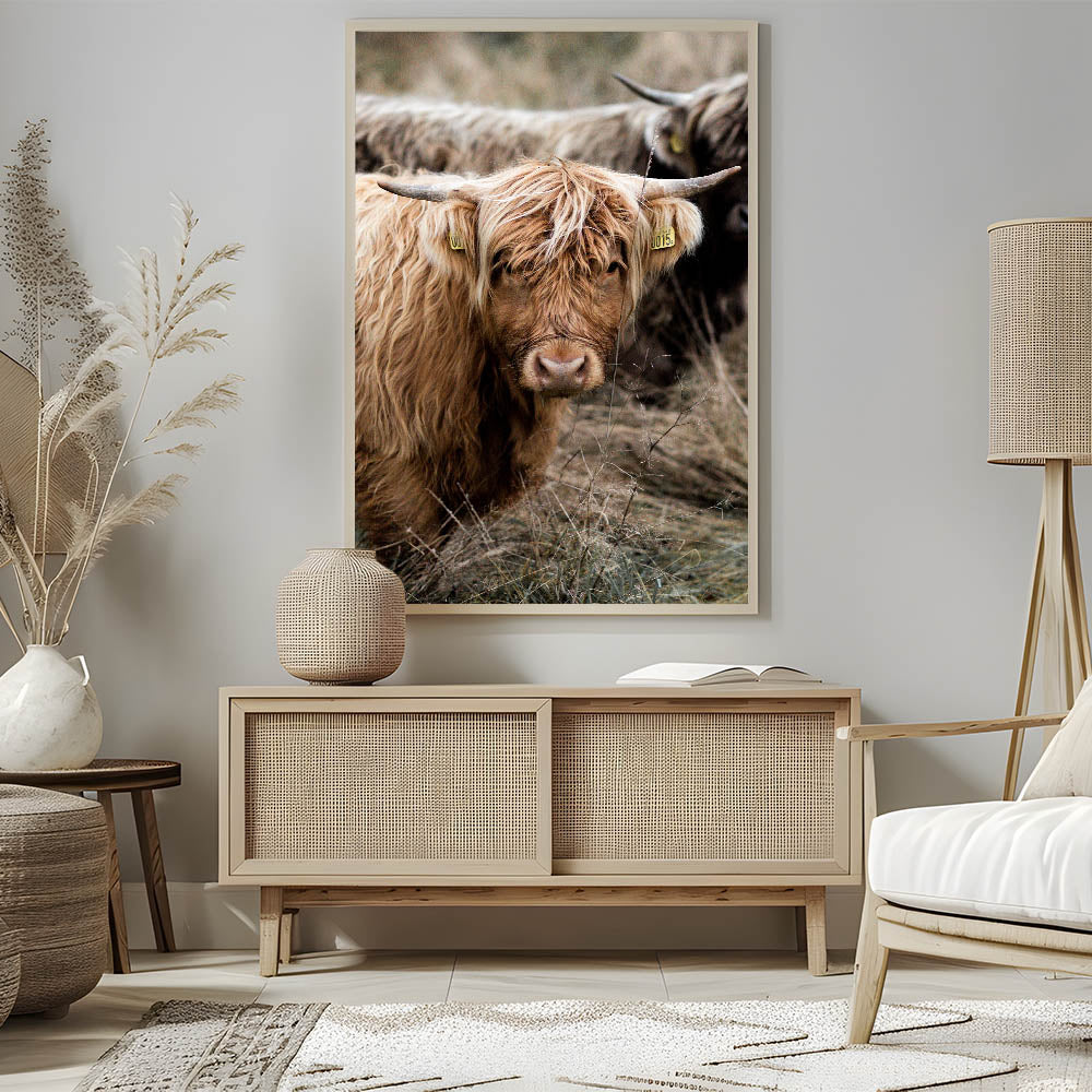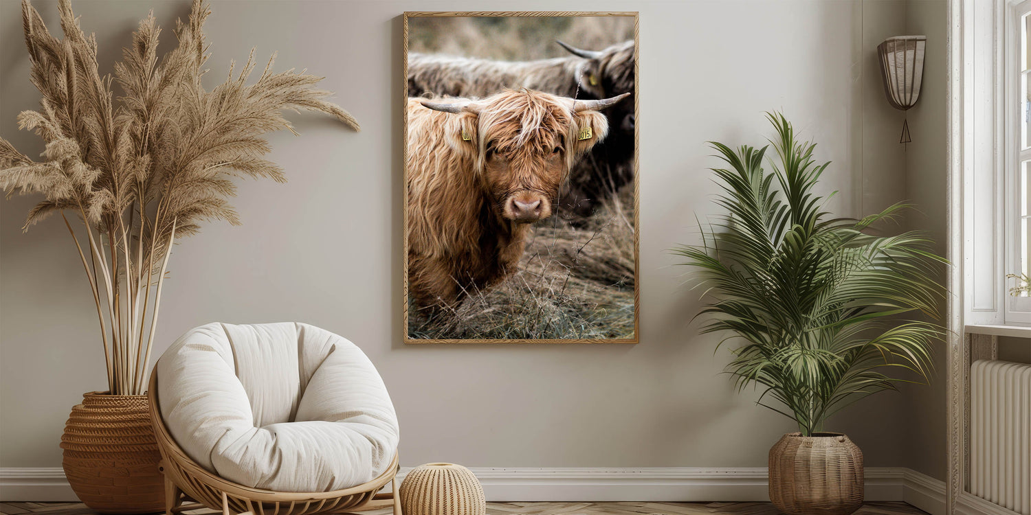 Whether displayed in your living room, kitchen, or hallway, this beautiful Highland cow print will bring a cozy, rustic atmosphere to your home. Perfect for those seeking a country-style accent, this piece blends vintage charm with natural elegance.
