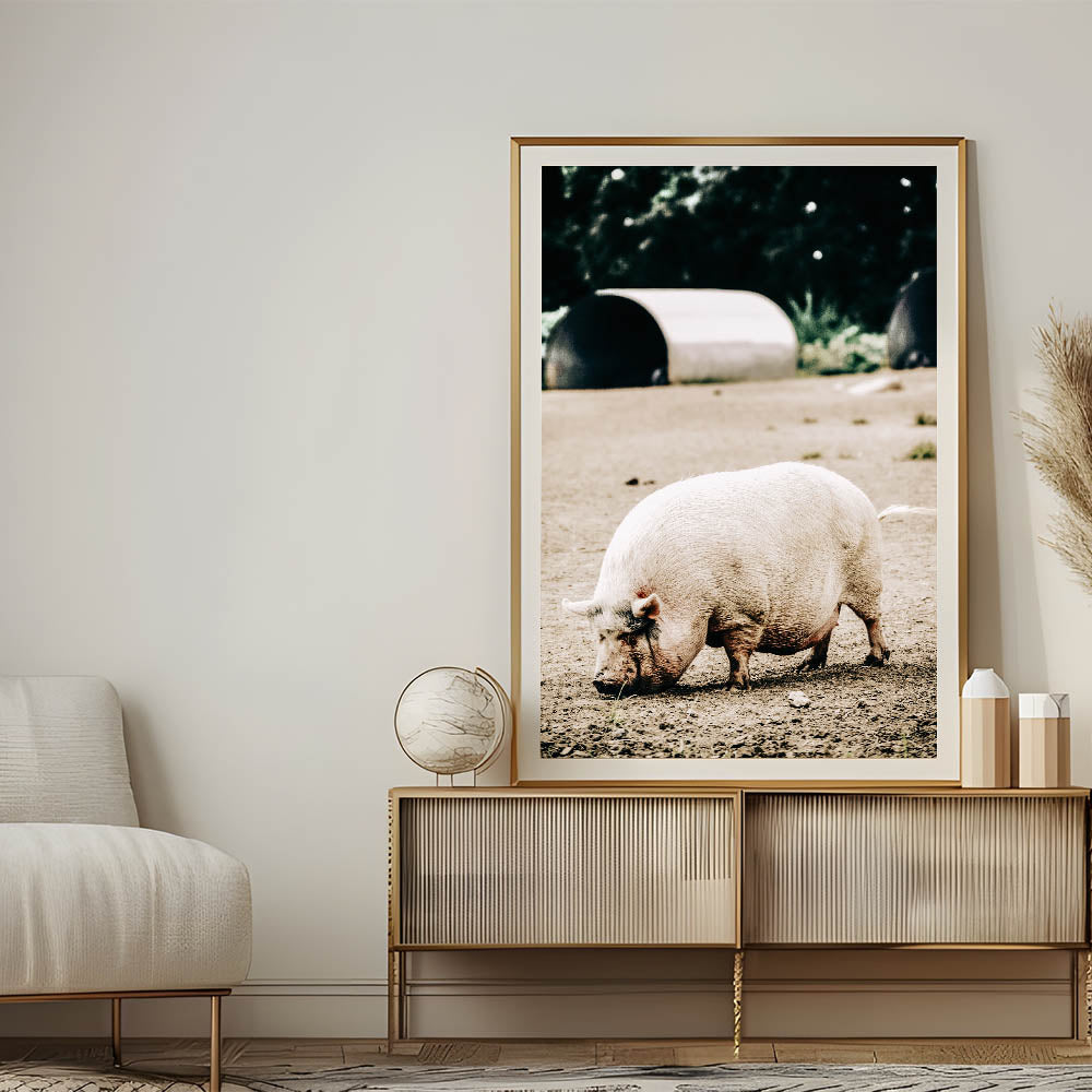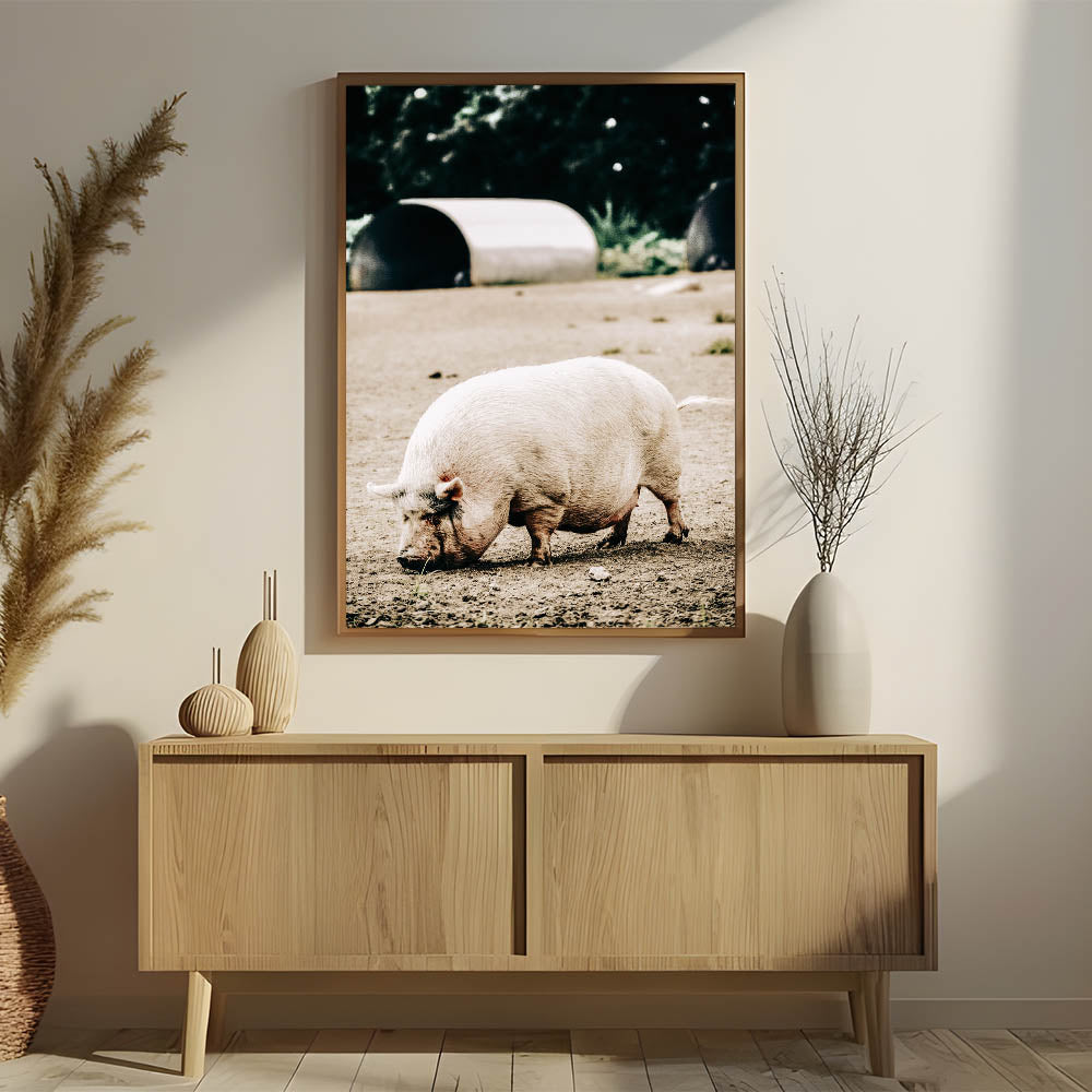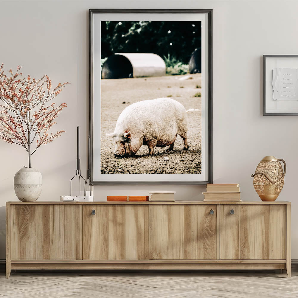 Bring the peaceful charm of rural life into your home with this farmhouse wall art, featuring a rustic pig foraging on a quiet farm. The earthy tones and simple backdrop evoke the essence of country living, making this artwork an ideal addition to any farmhouse or rustic décor. The vintage-inspired design adds warmth and character, perfect for creating a cozy atmosphere in your home.