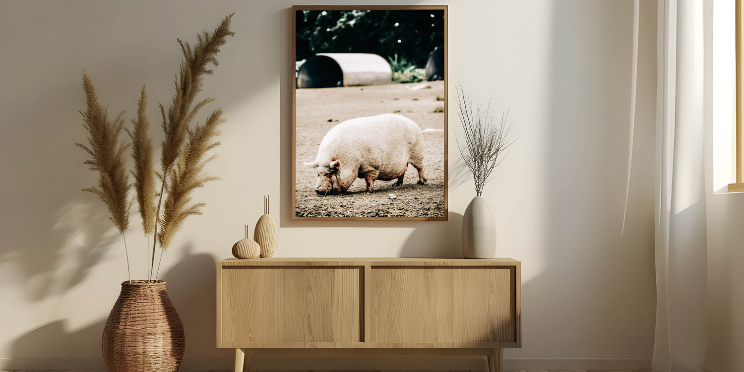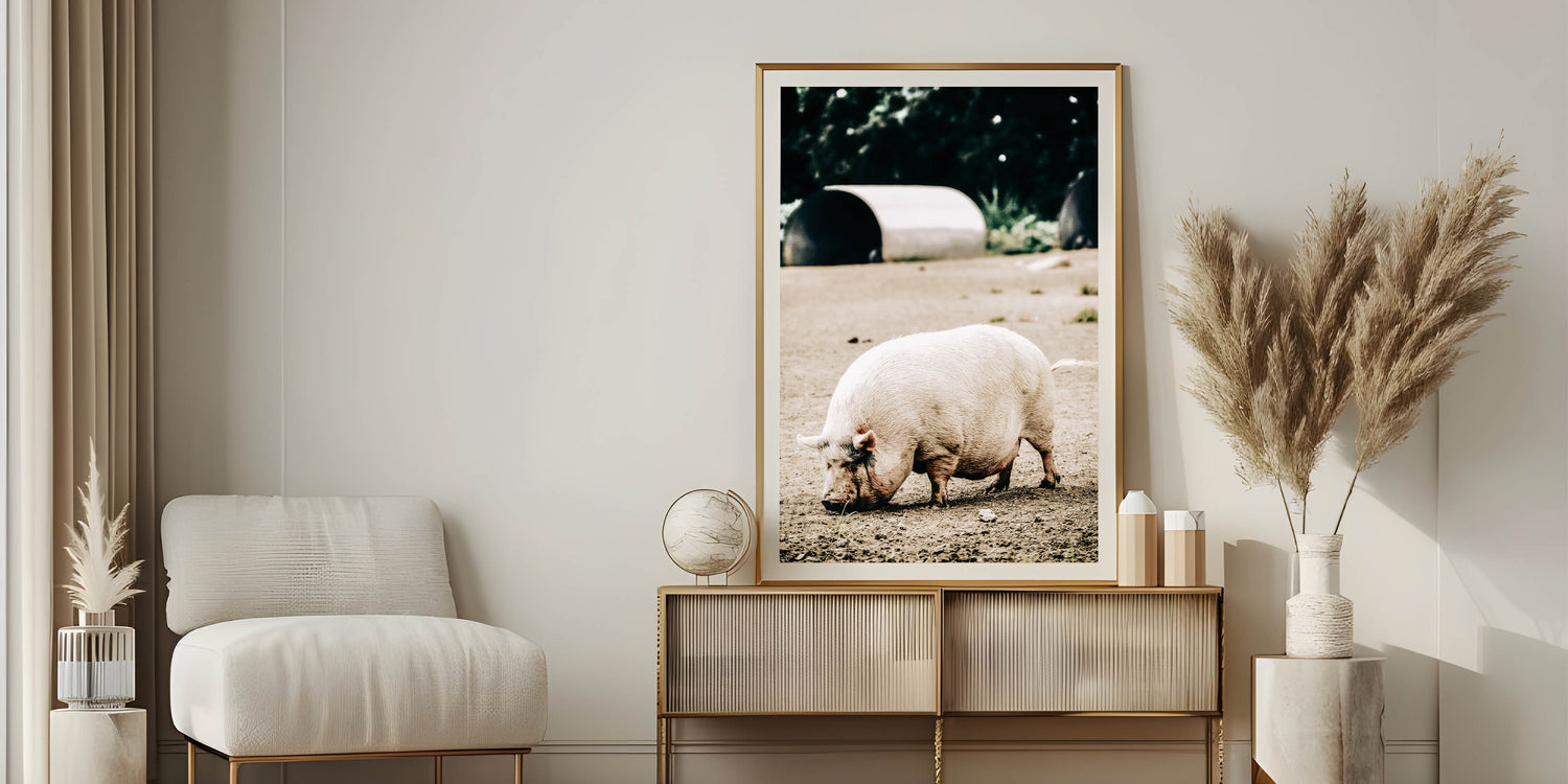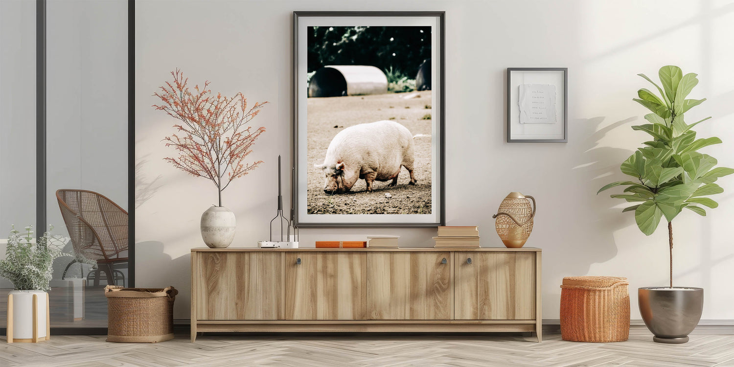 Bring the peaceful charm of rural life into your home with this farmhouse wall art, featuring a rustic pig foraging on a quiet farm. The earthy tones and simple backdrop evoke the essence of country living, making this artwork an ideal addition to any farmhouse or rustic décor. The vintage-inspired design adds warmth and character, perfect for creating a cozy atmosphere in your home.