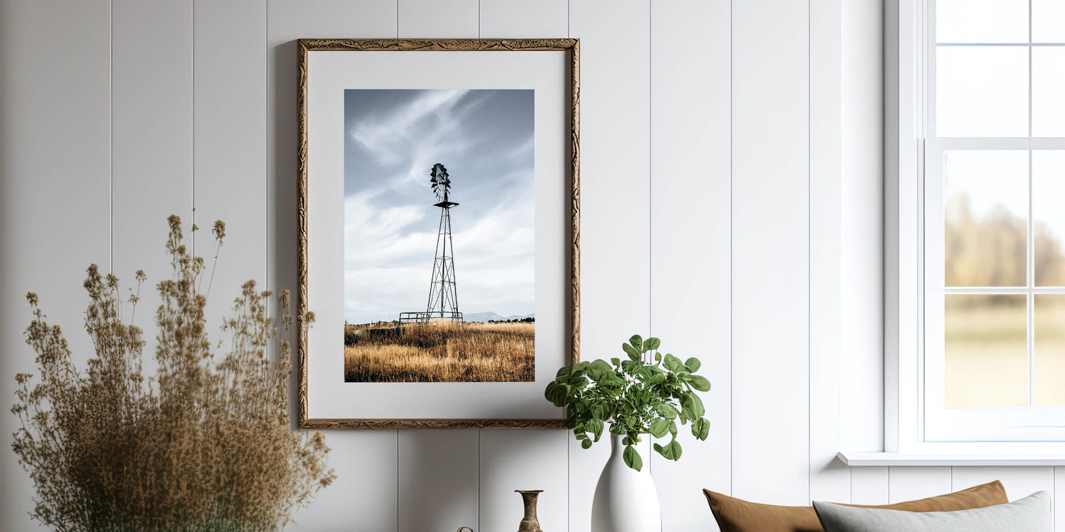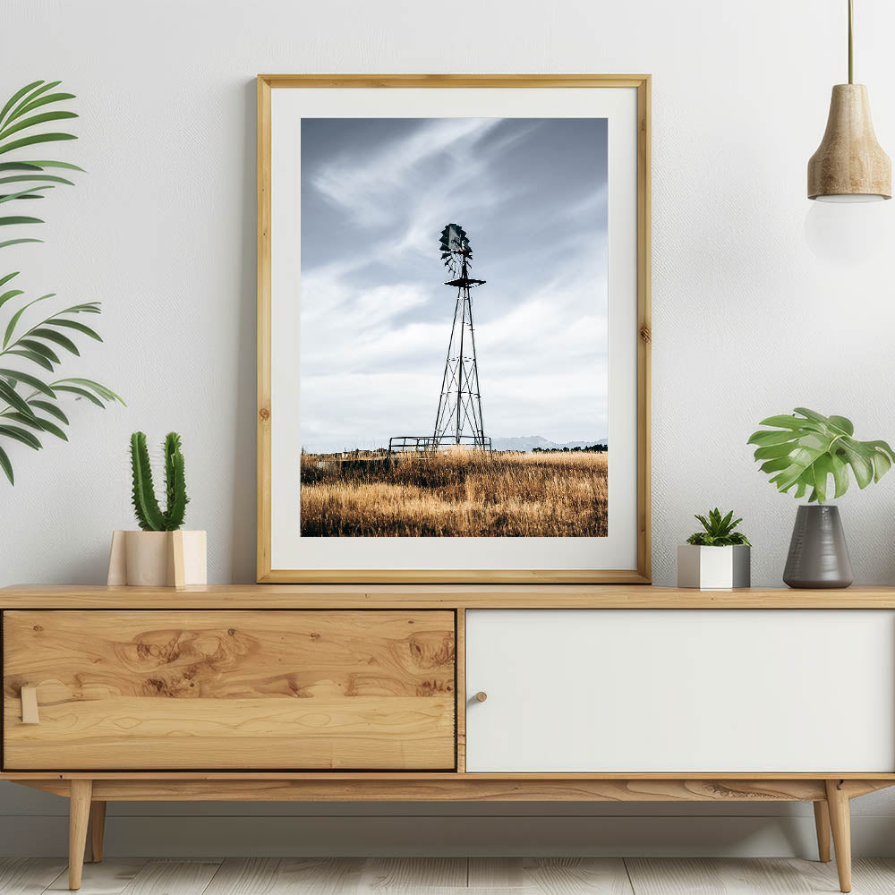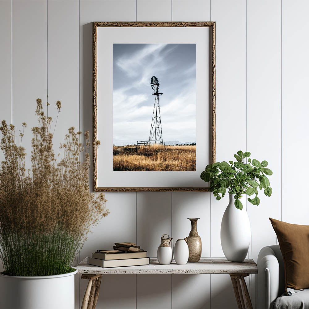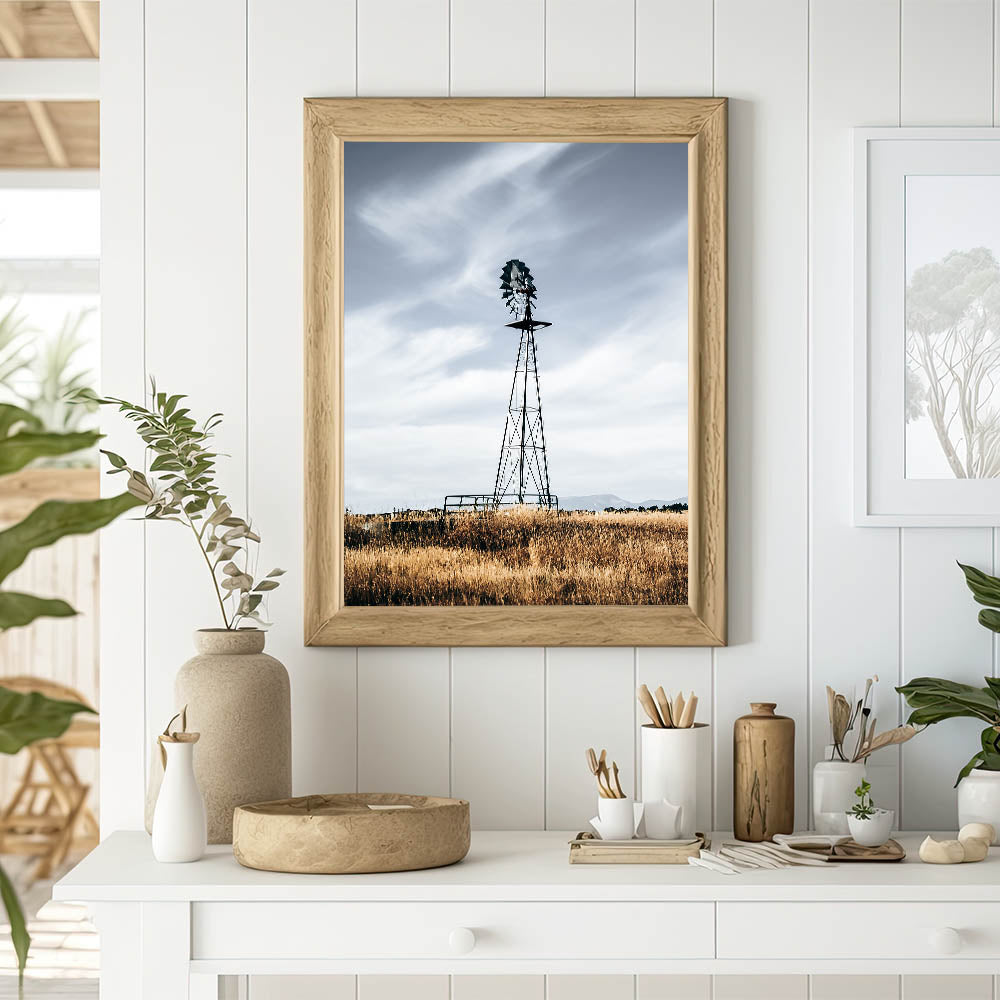 Add a touch of rustic charm to your home with this stunning farmhouse wall art featuring a windmill standing tall in a golden field. The muted tones and minimalist composition perfectly capture the beauty of country living, making this artwork an ideal addition to your farmhouse-style decor. The windmill’s vintage aesthetic against the backdrop of a wide-open sky brings a sense of tranquility and nostalgia to any room.