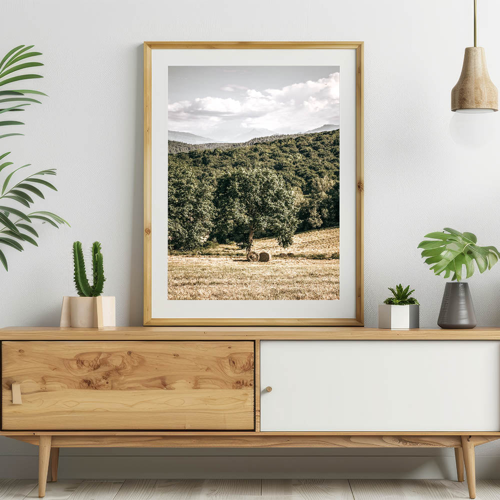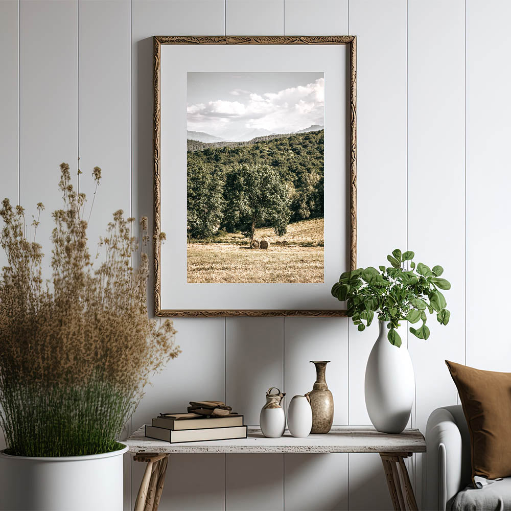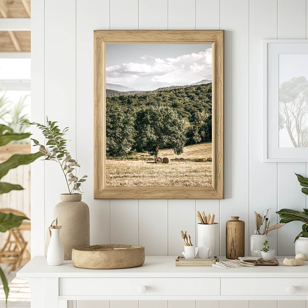 Embrace the peaceful beauty of country living with this stunning farmhouse wall art. Featuring a scenic view of rolling hills, lush greenery, and hay bales resting under a towering tree, this artwork captures the essence of rural charm. Ideal for adding a touch of vintage-inspired farmhouse décor to your home, this piece evokes a sense of tranquility and connection to nature.