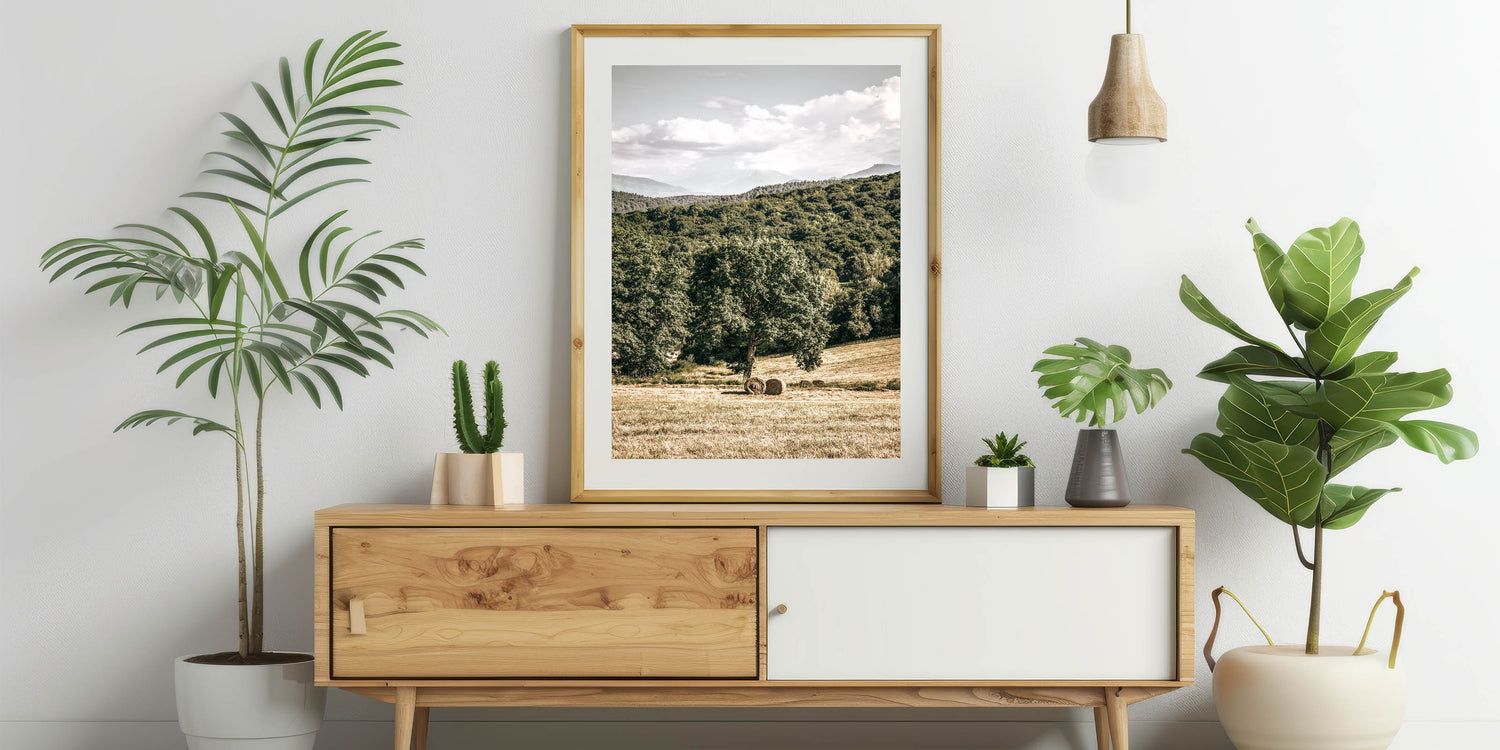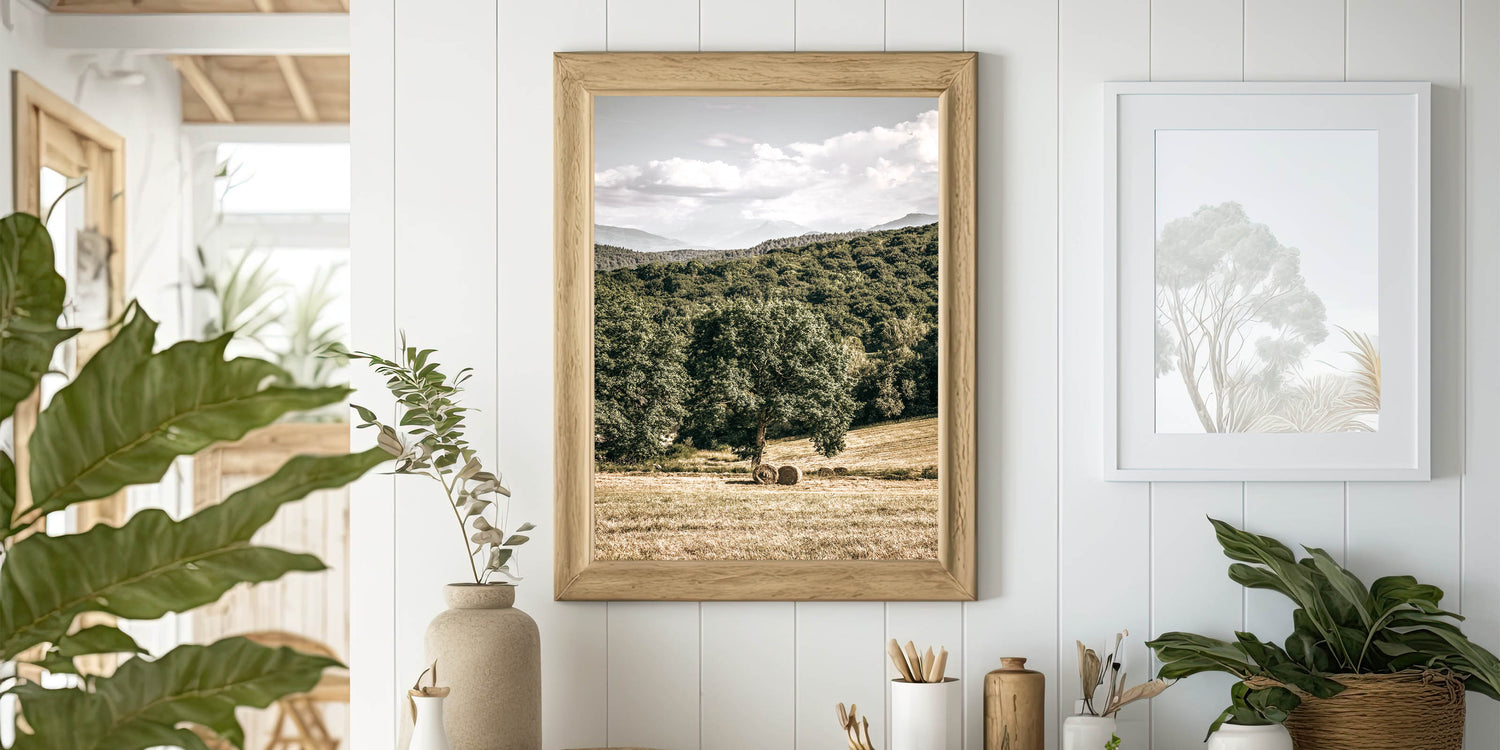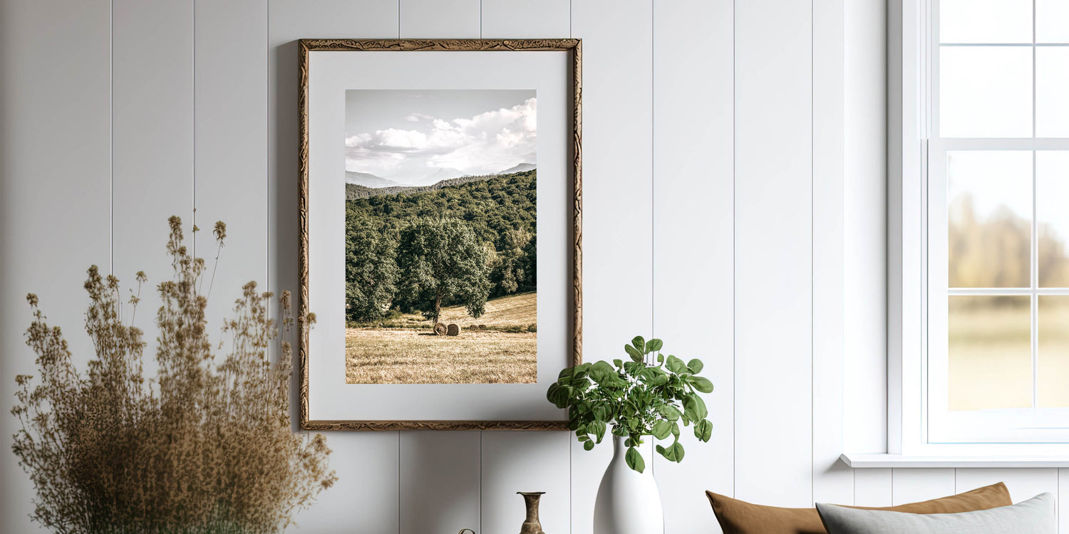 Embrace the peaceful beauty of country living with this stunning farmhouse wall art. Featuring a scenic view of rolling hills, lush greenery, and hay bales resting under a towering tree, this artwork captures the essence of rural charm. Ideal for adding a touch of vintage-inspired farmhouse décor to your home, this piece evokes a sense of tranquility and connection to nature.