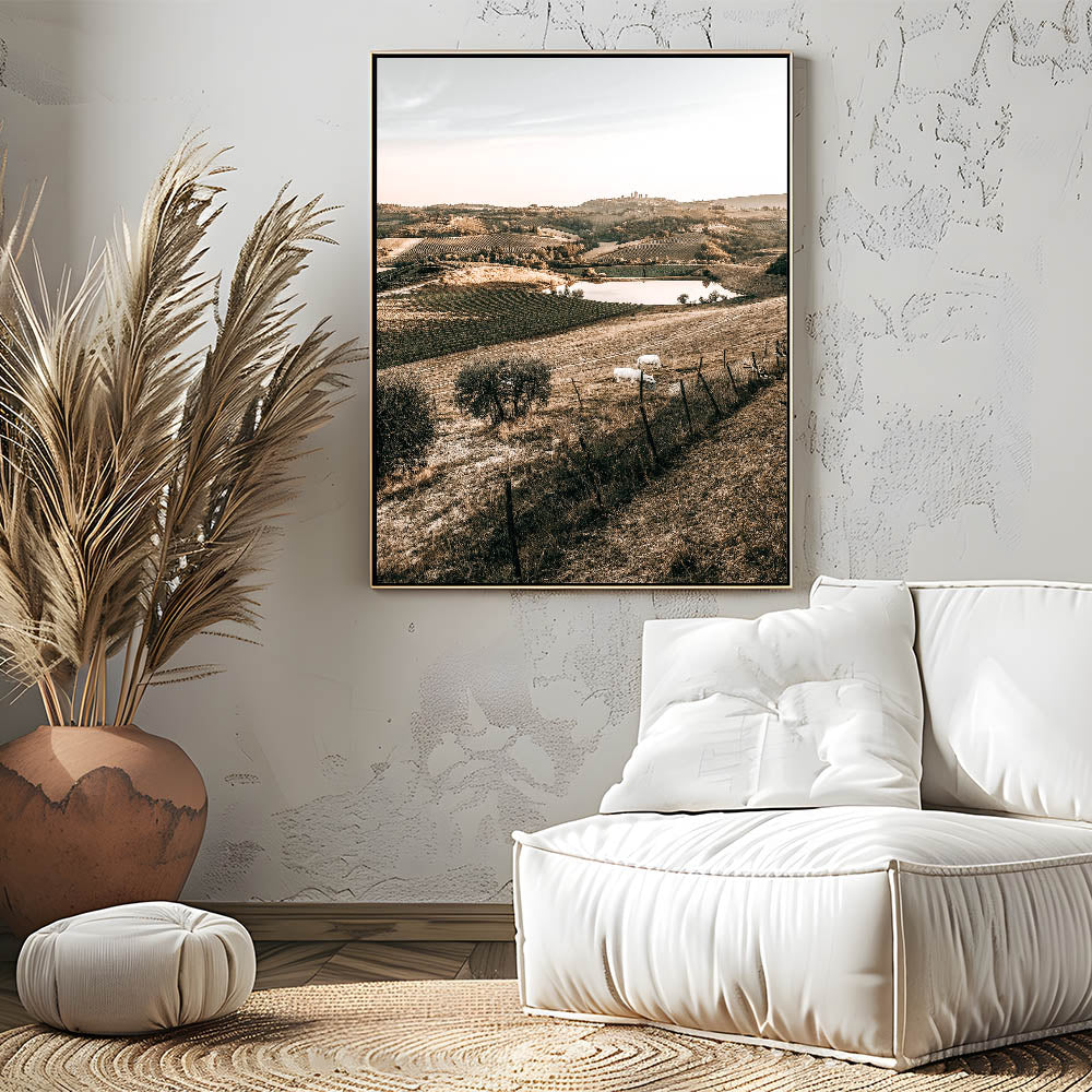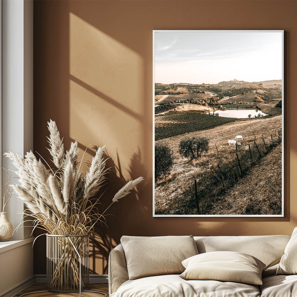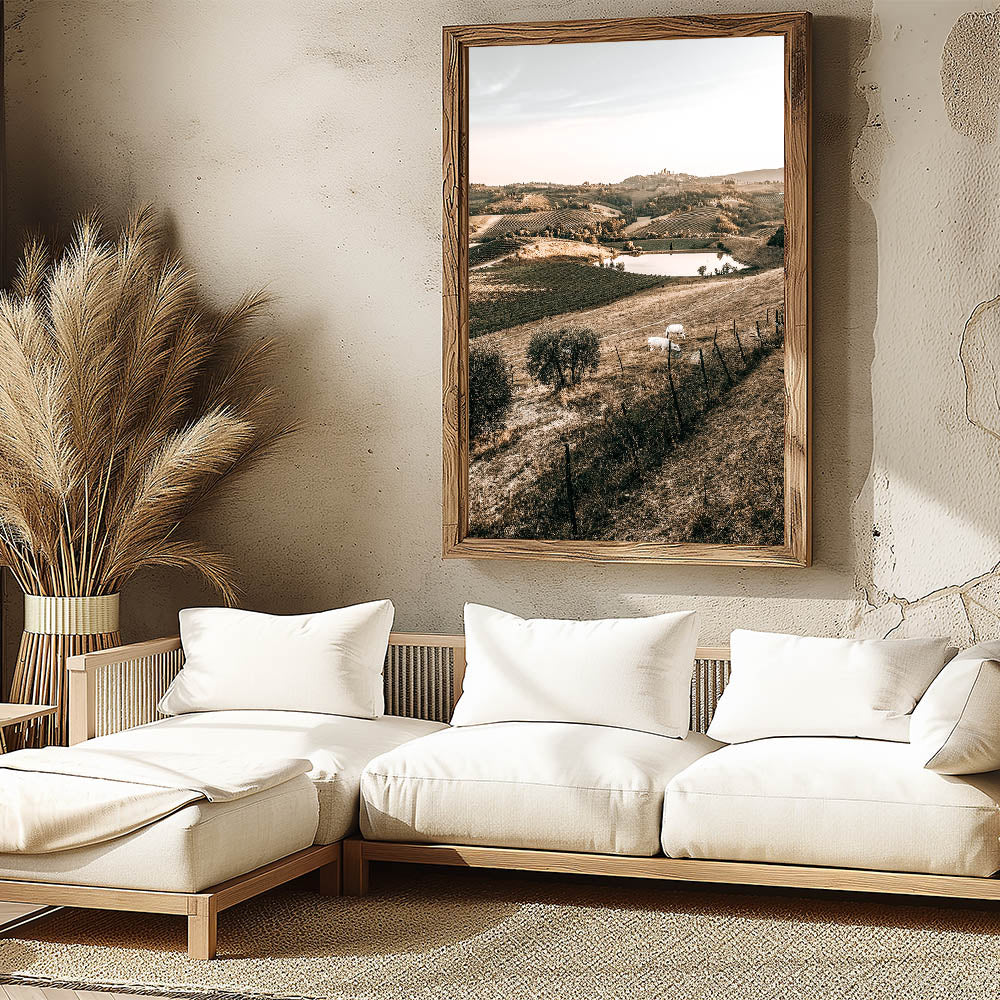 Bring the peaceful beauty of the countryside into your home with this "Scenic Countryside Hills" farmhouse wall art. This stunning print captures the natural charm of rolling hills, distant vineyards, and grazing cows, evoking a sense of calm and tranquility. Perfect for those who appreciate the rustic elegance of rural landscapes, this artwork is ideal for enhancing any farmhouse-style decor in kitchens, living rooms, or bedrooms.